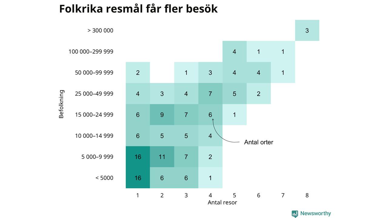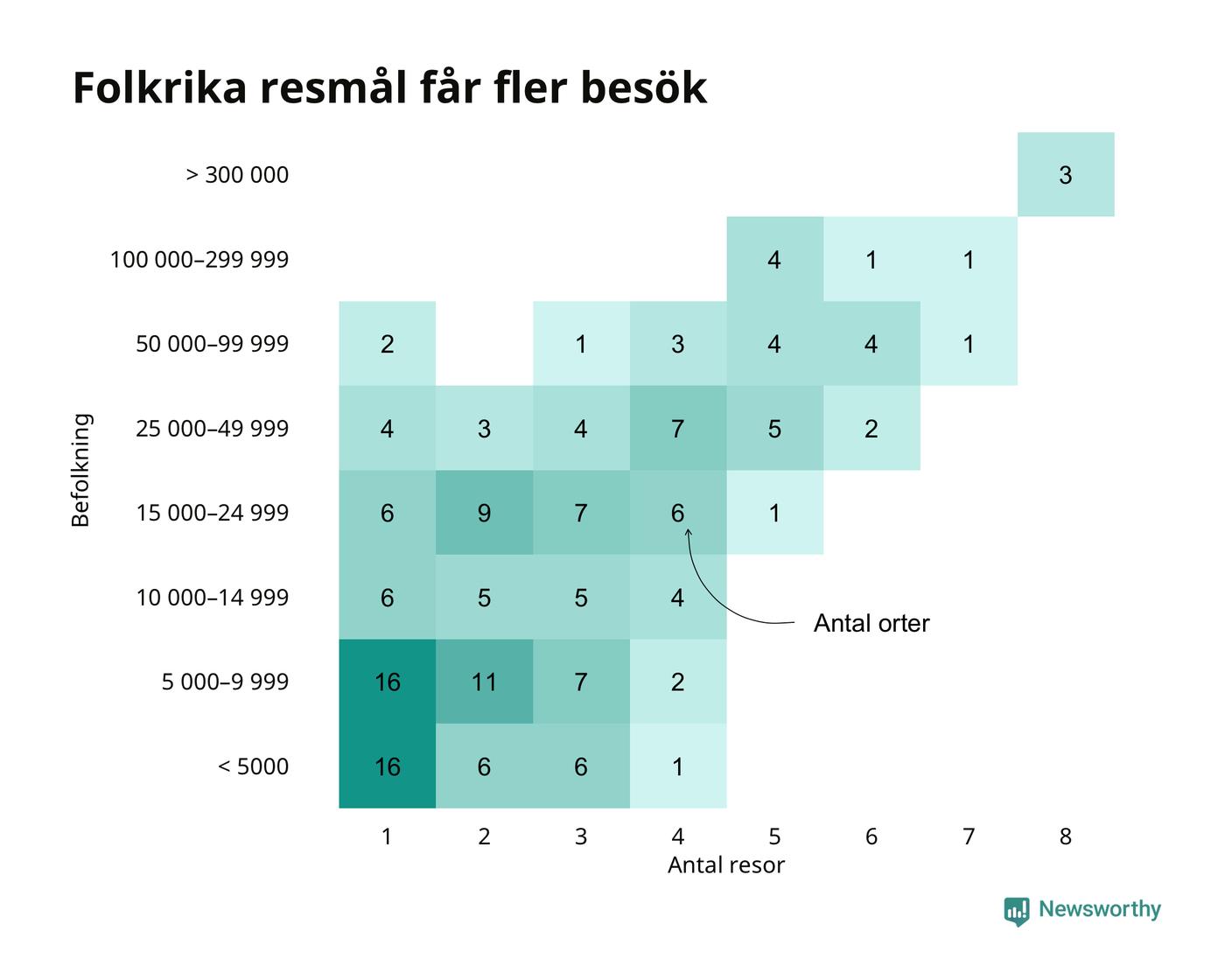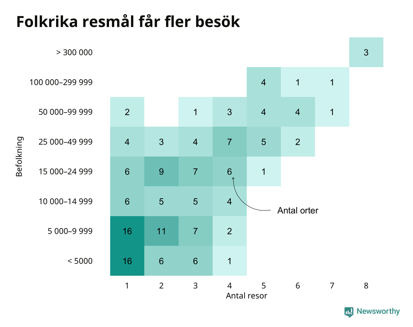 Antal orter uppdelat på antal resor i På spåret och befolkning