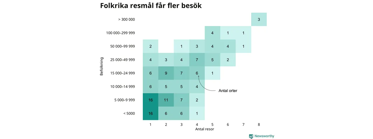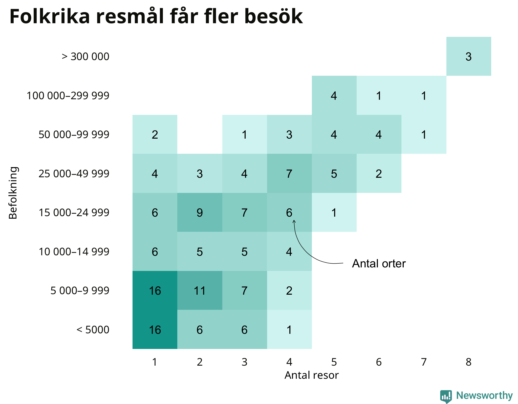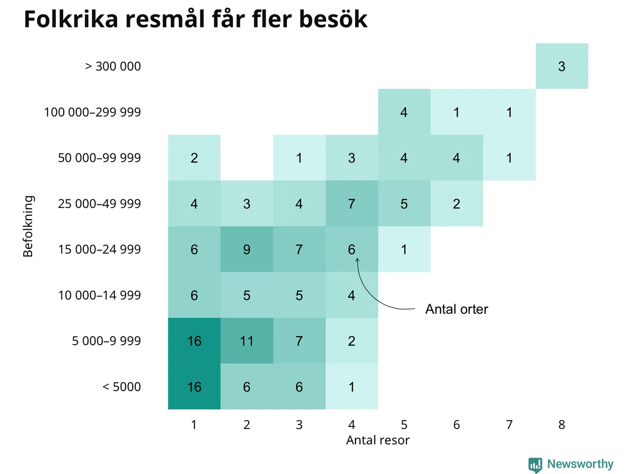 Antal orter uppdelat på antal resor i På spåret och befolkning