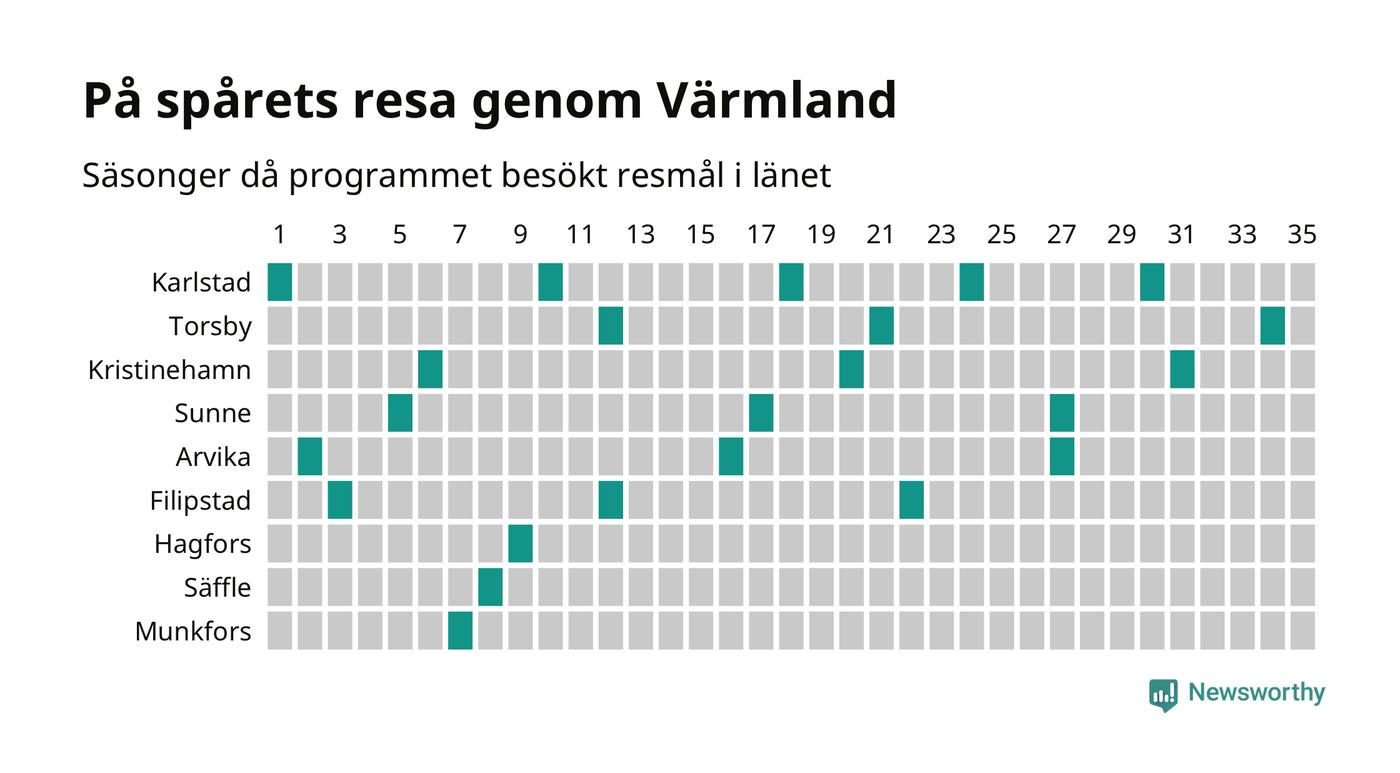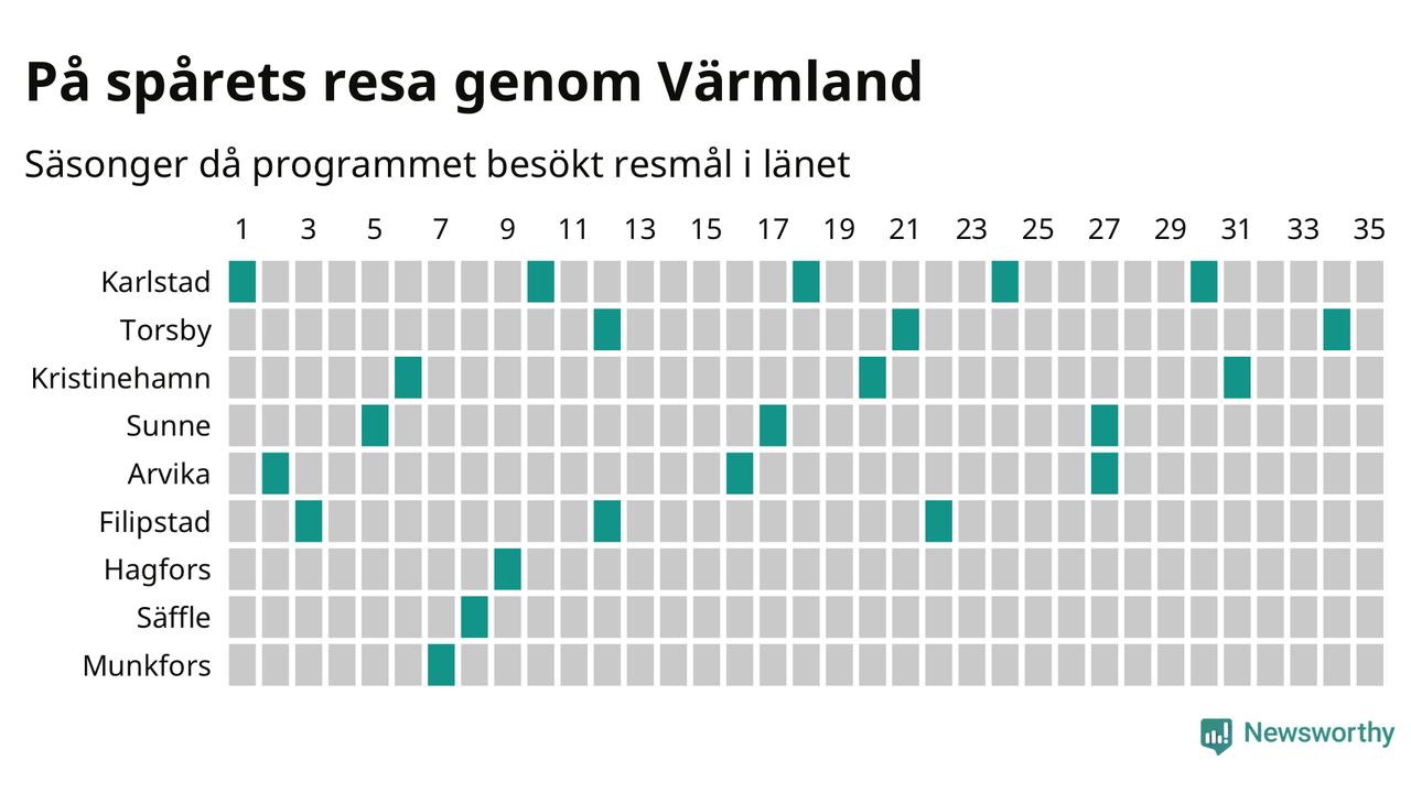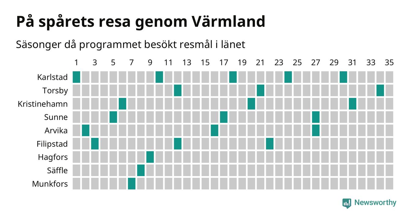 På spåret har stannat tre gånger i Sunne, senast säsongen 2016/17. Genom åren har programmet besökt nio av 16 kommuner i Värmlands län. Senast fick Torsby besök, för ett par säsonger sedan. Av resmålen i länet har Munkfors fått vänta längst tid sedan sist. 1996 besökte programmet orten senast.