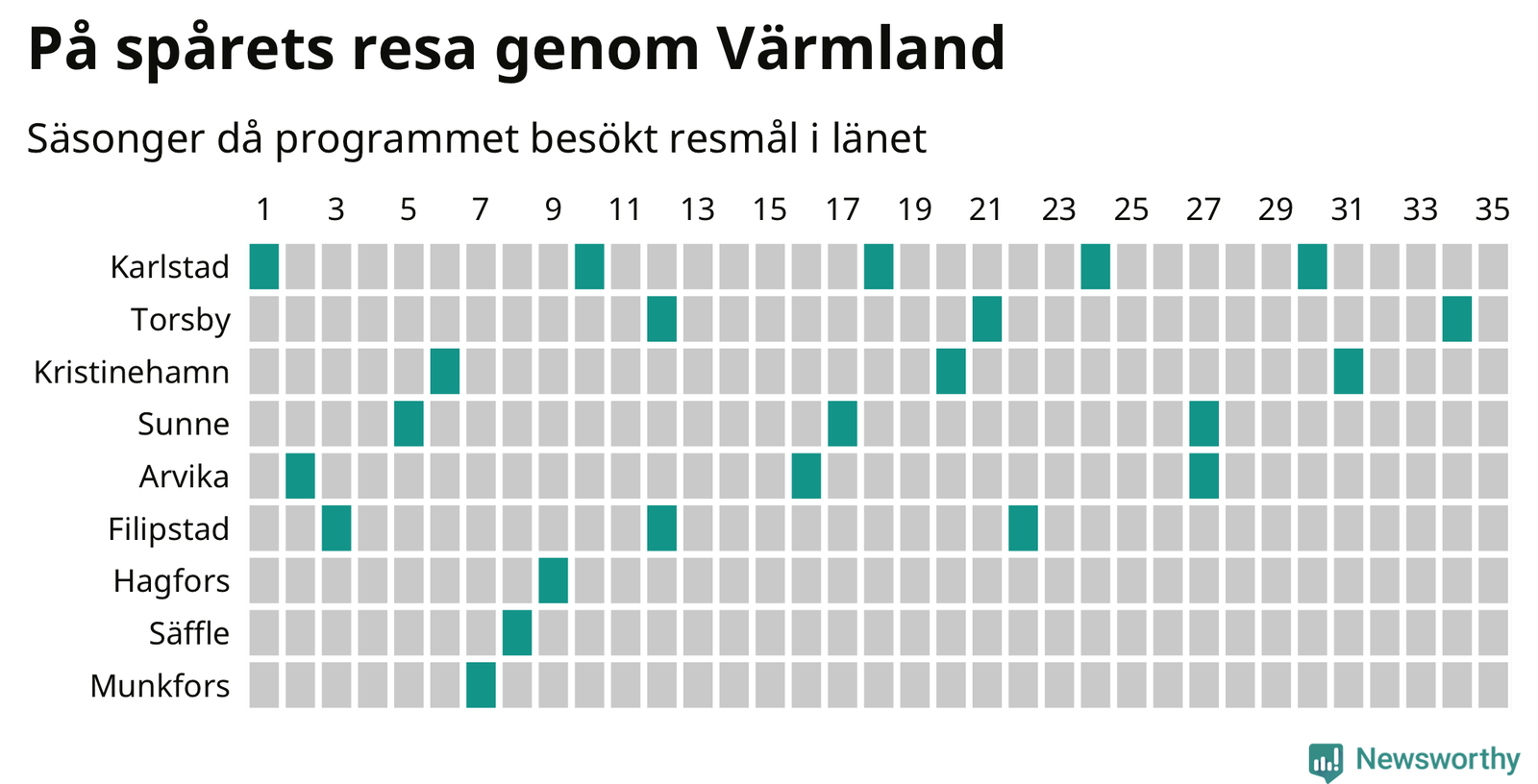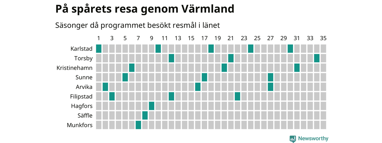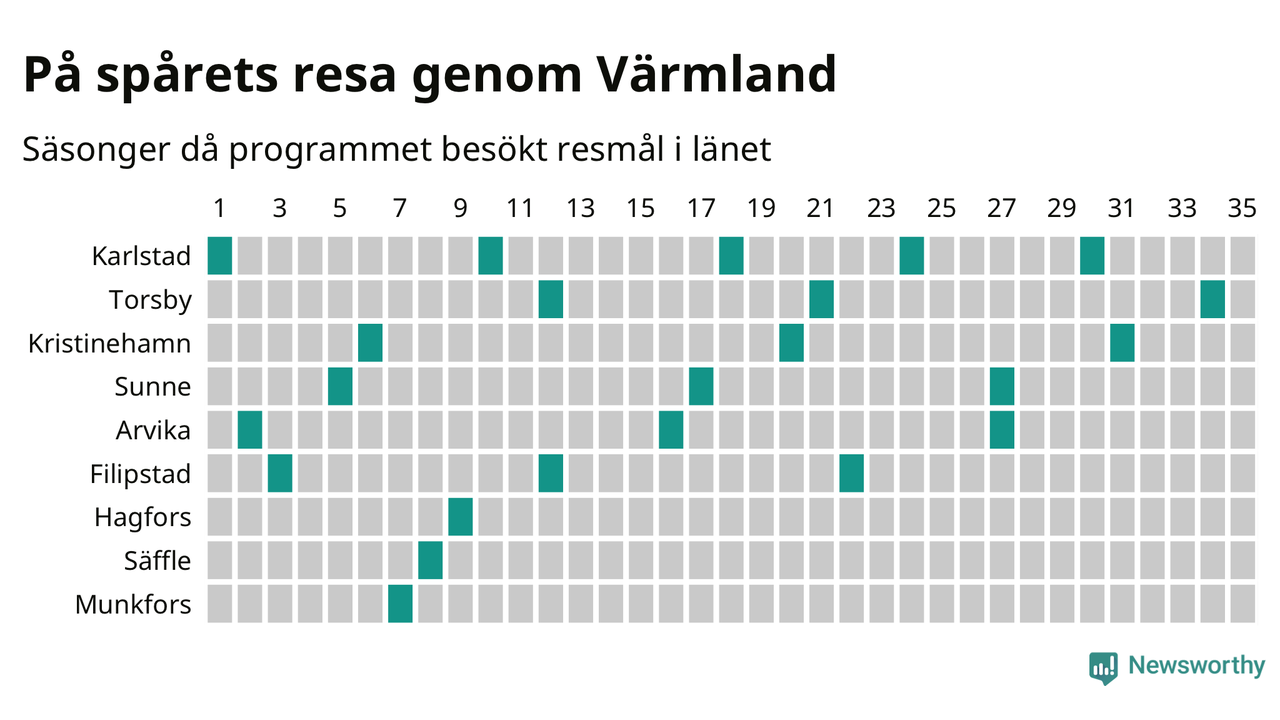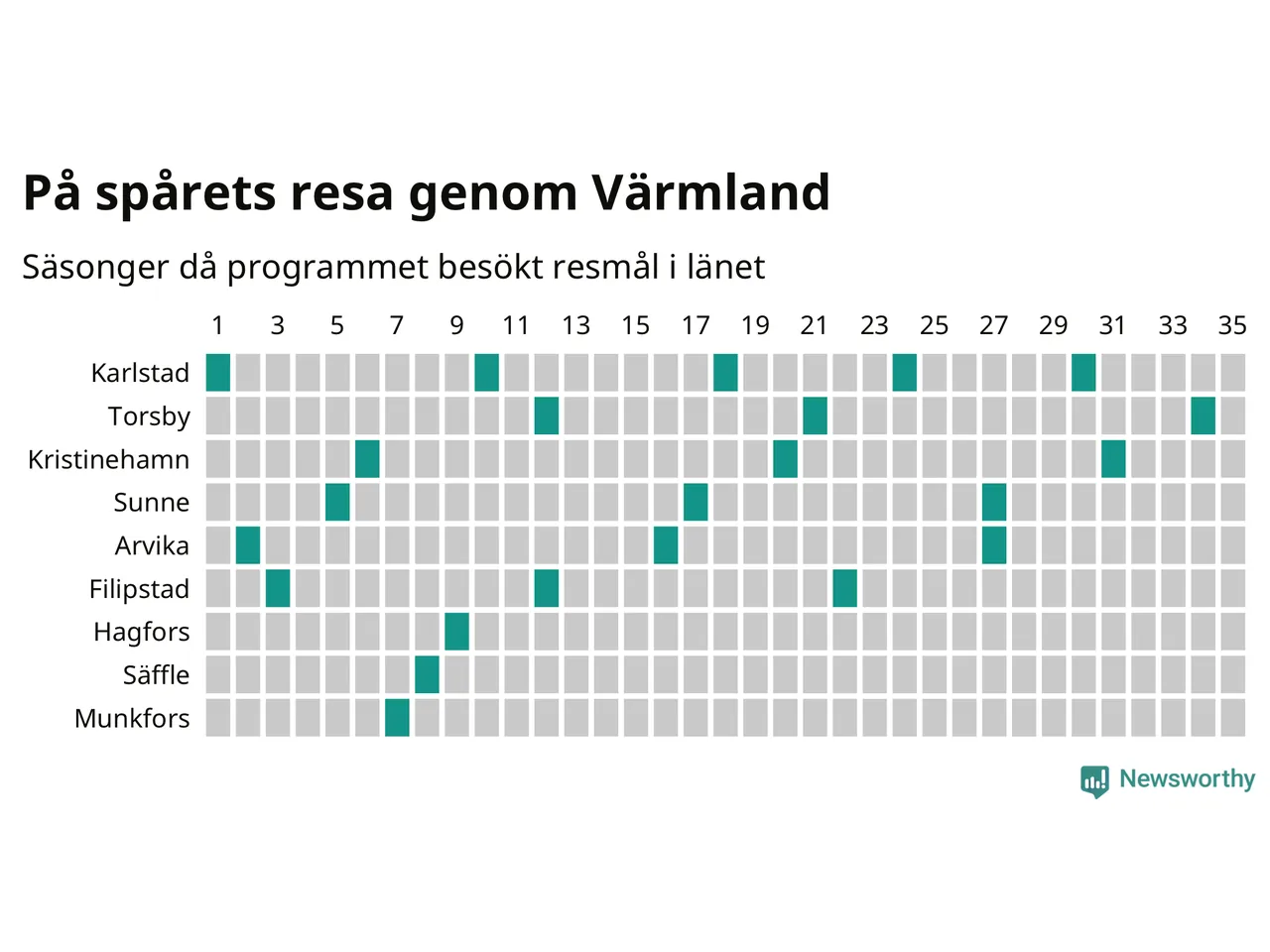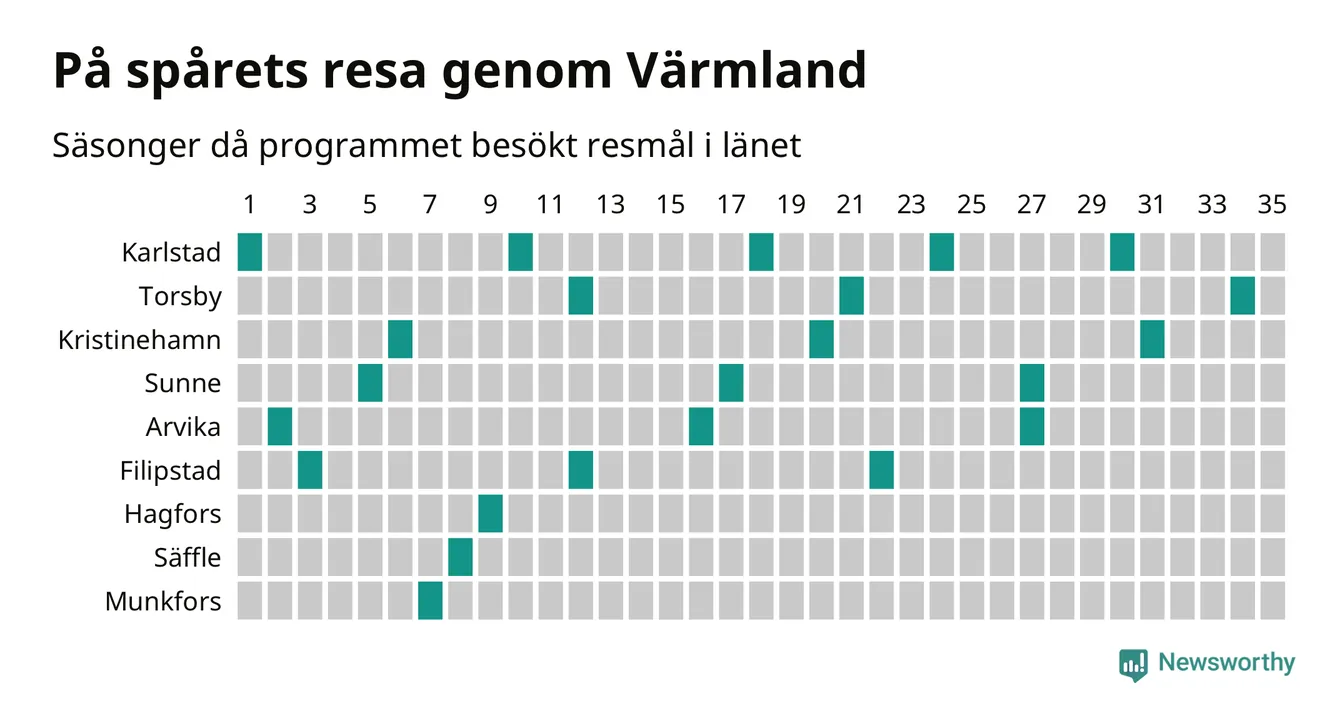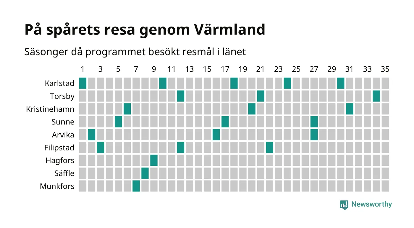 I flera år har Newsworthy samlat ett stort antal datapunkter om alla dessa tätorter för att försöka knäcka På spåret-koden. Och några saker står klart: Att det finns en järnvägsstation på orten har viss betydelse, men är inte nödvändigt. Av de 163 svenska orter som hittills fått vara med i programmet finns det perronger i 129. Av de 34 resmål utan järnvägsstation har Visby besökts oftast, sex gånger. Men det finns ytterligare ungefär 350 svenska orter med tågstation där På spåret aldrig varit.