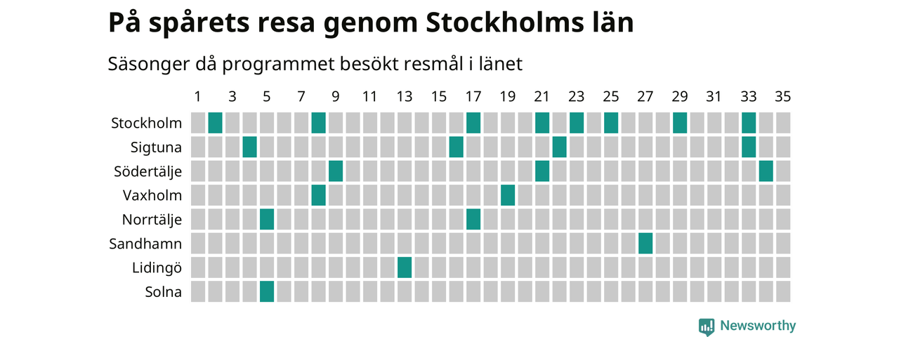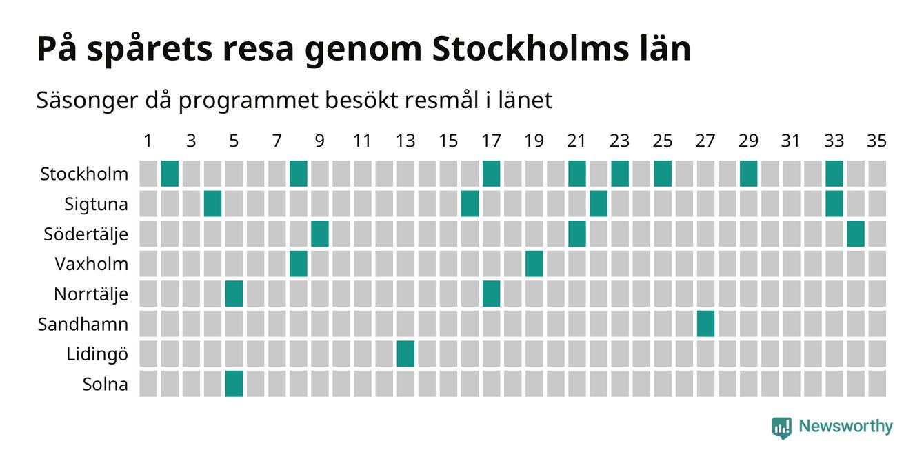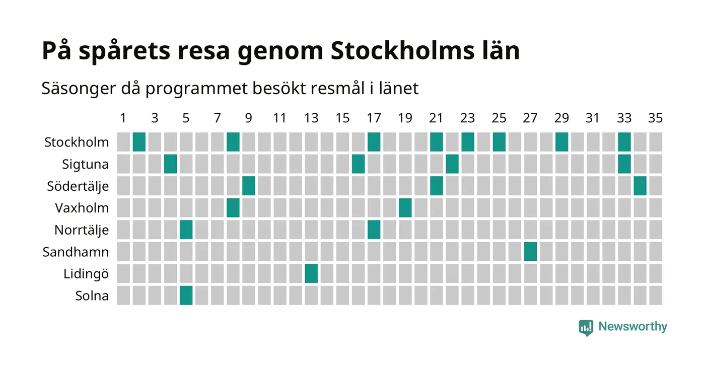 På spåret har som sagt aldrig stannat till i någon ort i Sollentuna kommun, och det är alltså ovanligt med helt nya resmål i programmet. I fjol var det bara återkommande destinationer – och under de senaste fem säsongerna har knappt var tionde resa gått till en helt ny ort. Vår modell gör bedömningen att Sollentuna har störst chans i kommunen och – baserat på analysen ovan – tillhör de ännu ej besökta resmål som borde kunna vara aktuella. Trots närheten till en storstad – något som historiskt sett varit en nackdel.