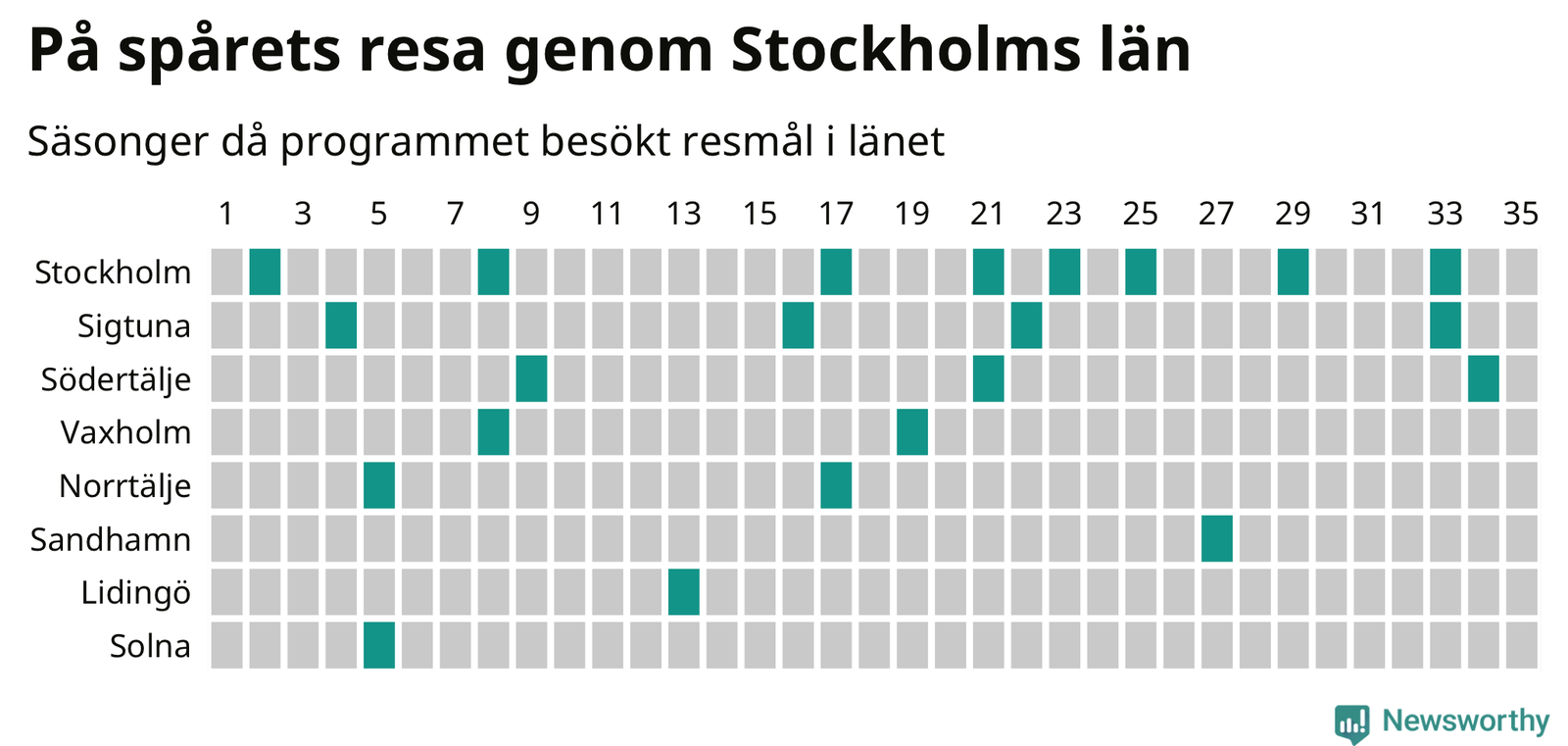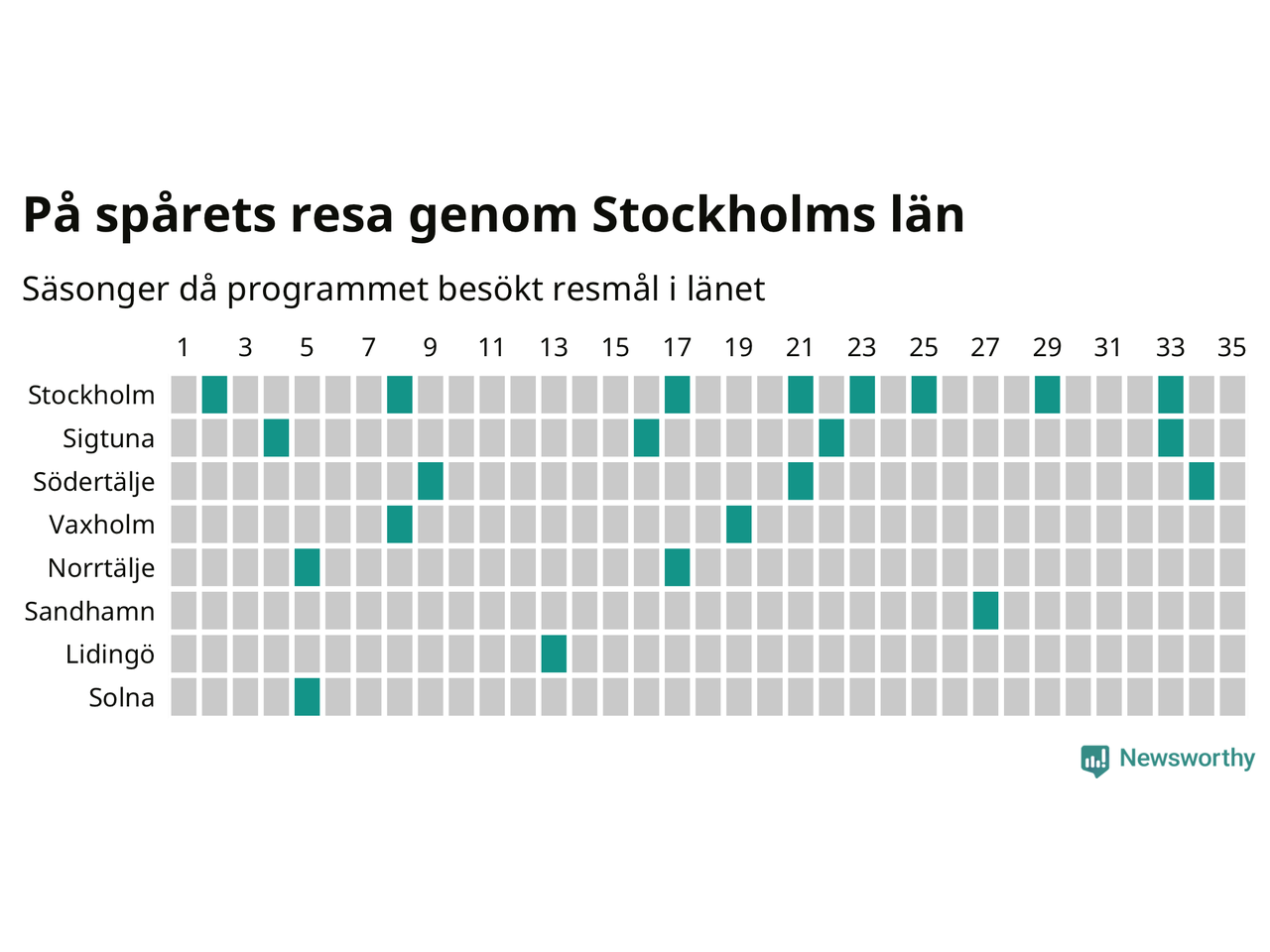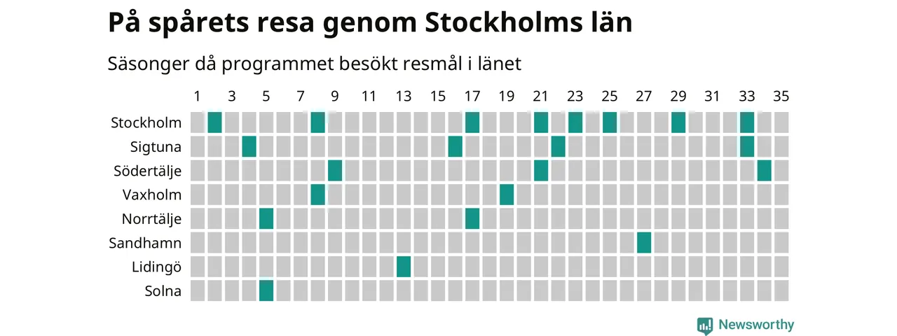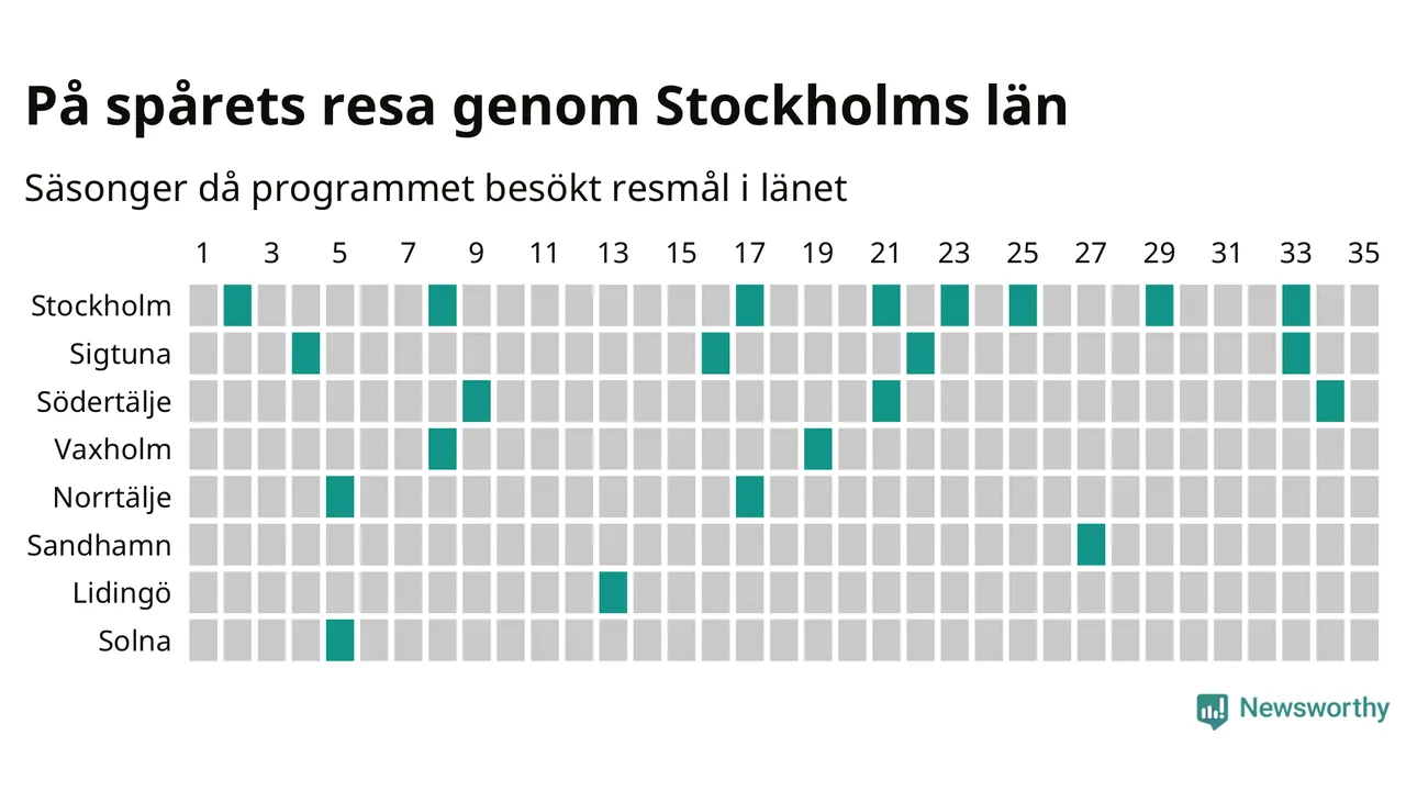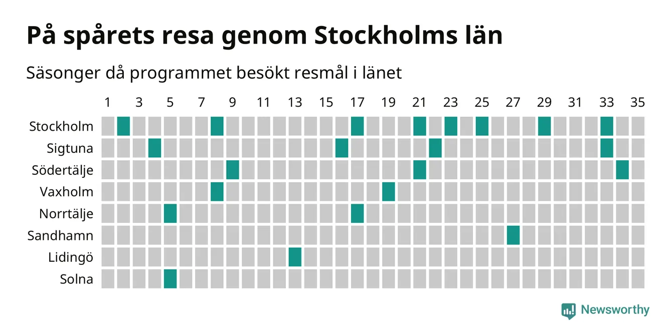 I flera år har Newsworthy samlat ett stort antal datapunkter om alla dessa tätorter för att försöka knäcka På spåret-koden. Och några saker står klart: Att det finns en järnvägsstation på orten har viss betydelse, men är inte nödvändigt. Av de 163 svenska orter som hittills fått vara med i programmet finns det perronger i 129. Av de 34 resmål utan järnvägsstation har Visby besökts oftast, sex gånger. Men det finns ytterligare ungefär 350 svenska orter med tågstation där På spåret aldrig varit.