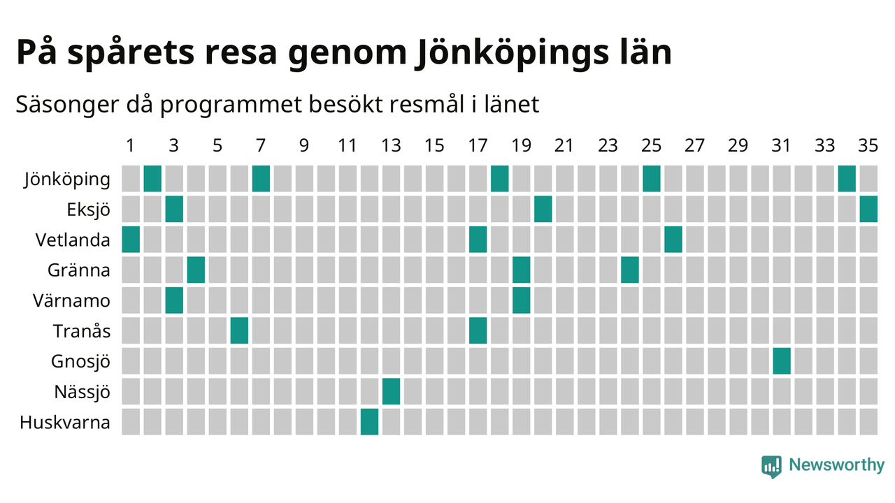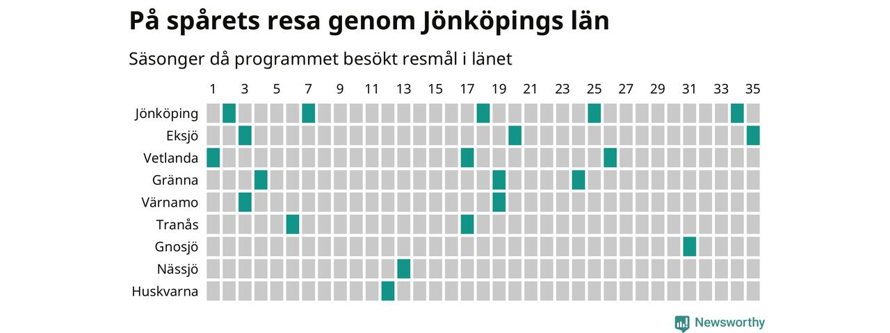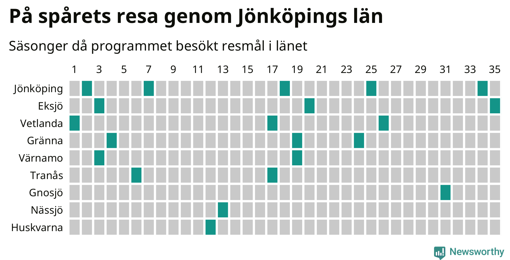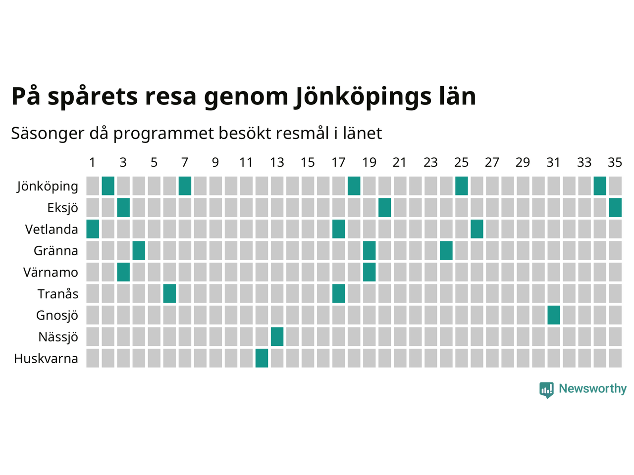 Så vad säger På spåret-koden om Värnamos chanser att dyka upp under säsongen som börjar på fredag? Vår modell bedömer att Värnamo antagligen inte är ett av årets resmål. Det som trots allt talar för en resa är tidsperspektivet. Det har gått 17 säsonger – eller 16 år – sedan På spåret senast besökte orten.