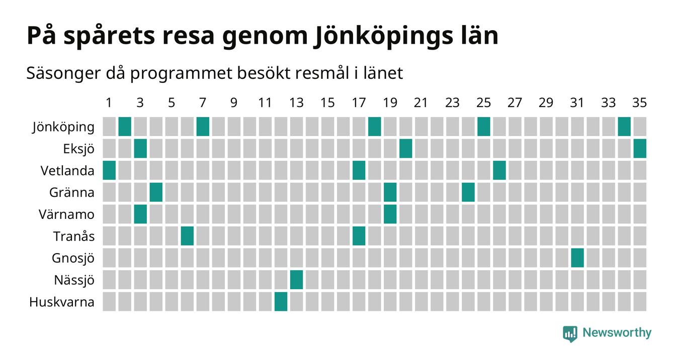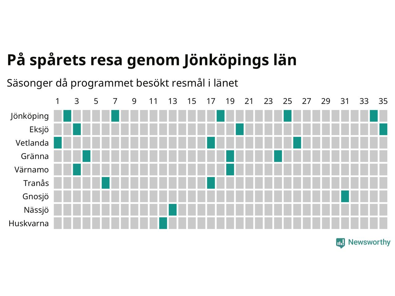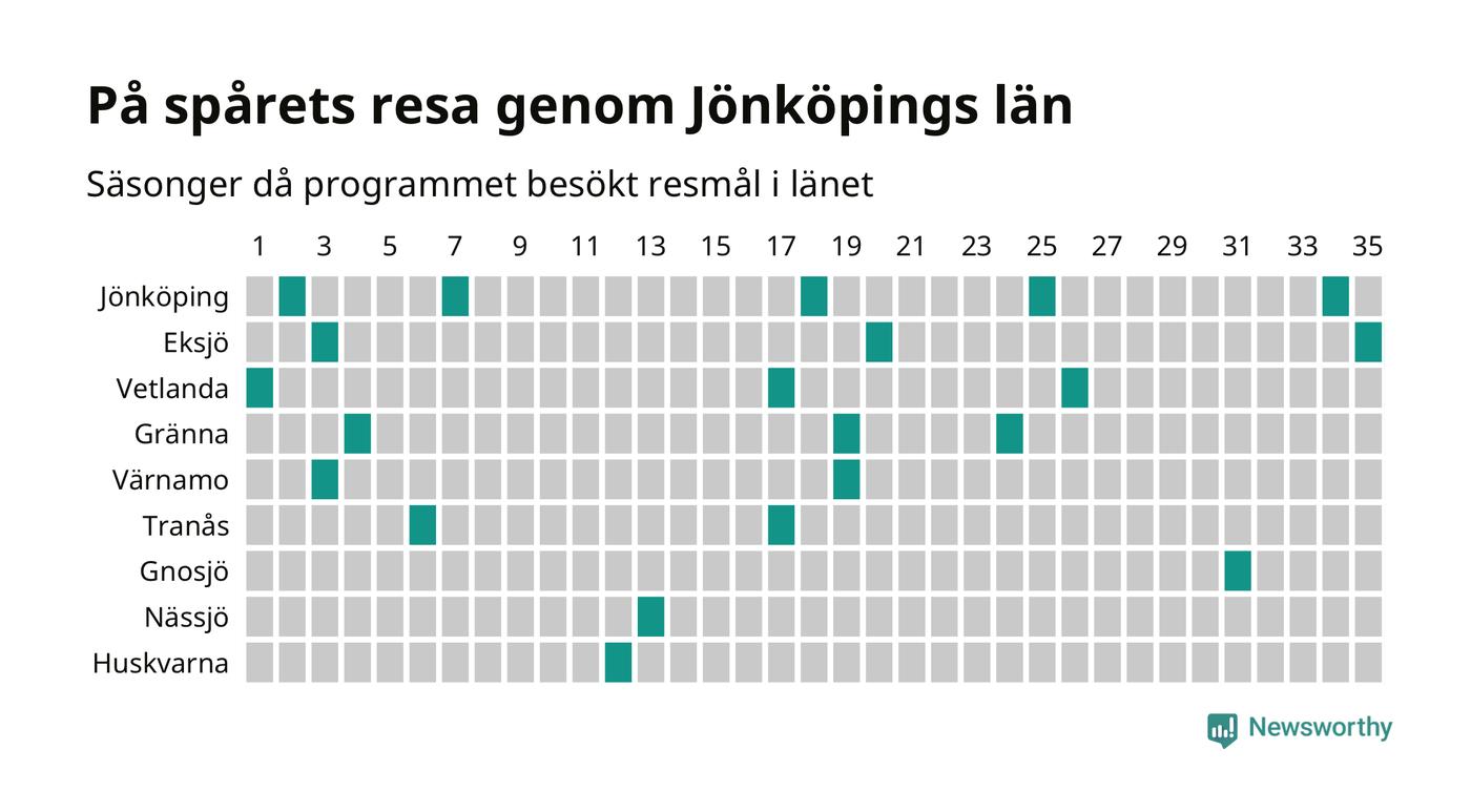 På spåret har stannat två gånger i Värnamo, senast säsongen 2008/09. Genom åren har programmet besökt sju av 13 kommuner i Jönköpings län. Senast fick Eksjö besök, under förra säsongen. Av resmålen i länet har Huskvarna fått vänta längst tid sedan sist. 2001 besökte programmet orten senast.