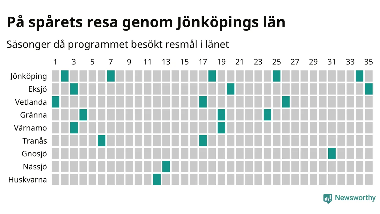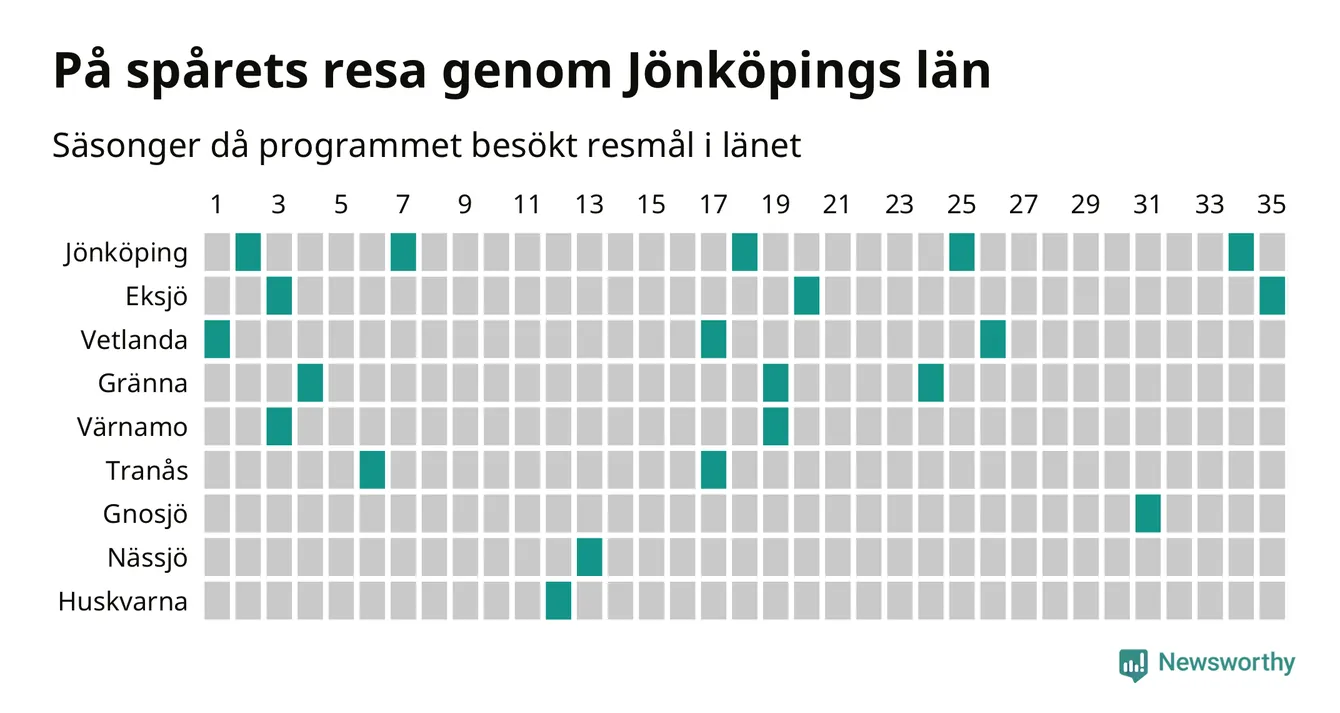 I flera år har Newsworthy samlat ett stort antal datapunkter om alla dessa tätorter för att försöka knäcka På spåret-koden. Och några saker står klart: Att det finns en järnvägsstation på orten har viss betydelse, men är inte nödvändigt. Av de 163 svenska orter som hittills fått vara med i programmet finns det perronger i 129. Av de 34 resmål utan järnvägsstation har Visby besökts oftast, sex gånger. Men det finns ytterligare ungefär 350 svenska orter med tågstation där På spåret aldrig varit.