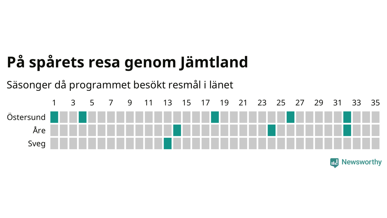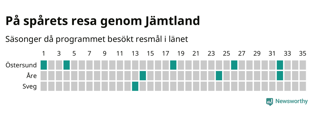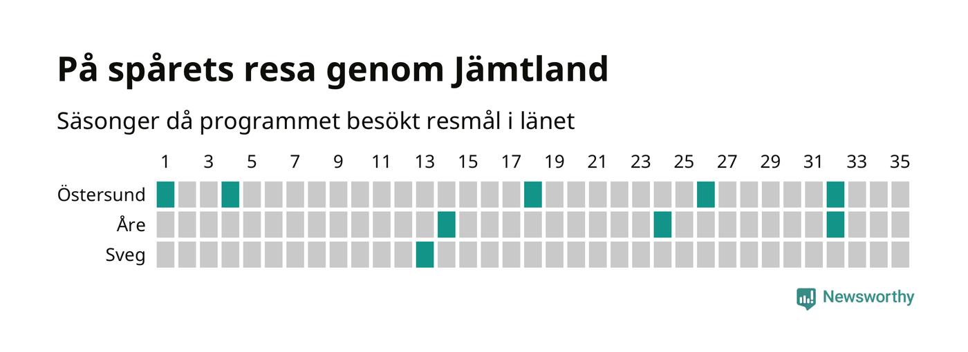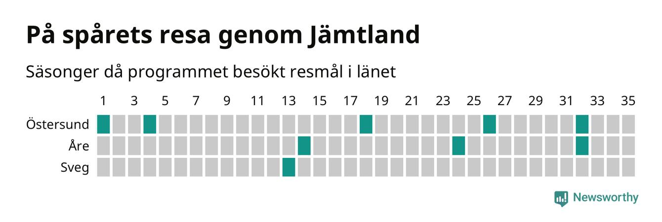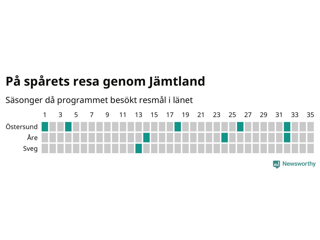 På spåret har stannat fem gånger i Östersund, senast säsongen 2021/22. Genom åren har programmet besökt tre av åtta kommuner i Jämtlands län. Senaste gången var det just Åre och Östersund. Av resmålen i länet har Sveg fått vänta längst tid sedan sist. Säsongen 2002/03 besökte programmet orten senast.