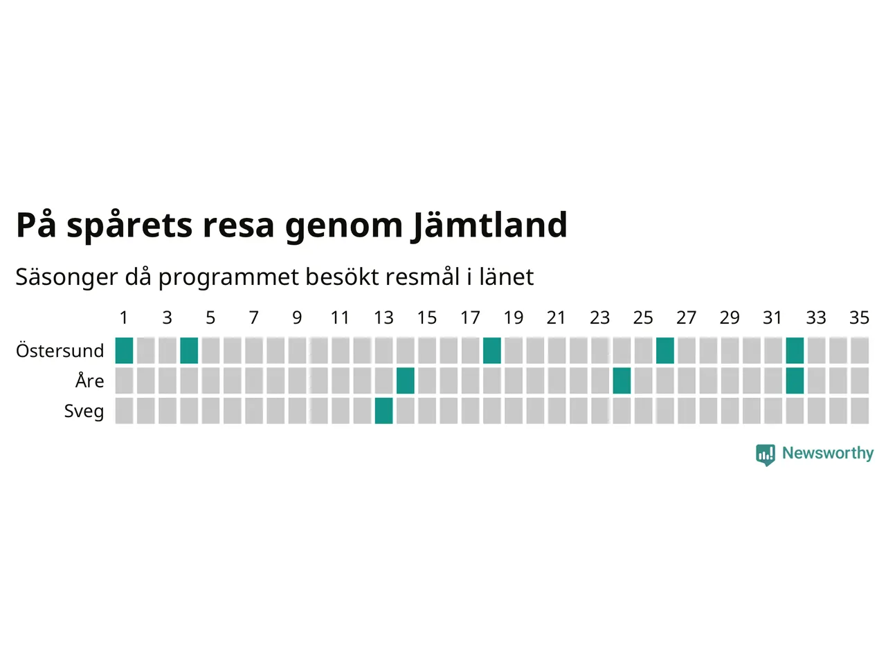 I flera år har Newsworthy samlat ett stort antal datapunkter om alla dessa tätorter för att försöka knäcka På spåret-koden. Och några saker står klart: Att det finns en järnvägsstation på orten har viss betydelse, men är inte nödvändigt. Av de 163 svenska orter som hittills fått vara med i programmet finns det perronger i 129. Av de 34 resmål utan järnvägsstation har Visby besökts oftast, sex gånger. Men det finns ytterligare ungefär 350 svenska orter med tågstation där På spåret aldrig varit.
