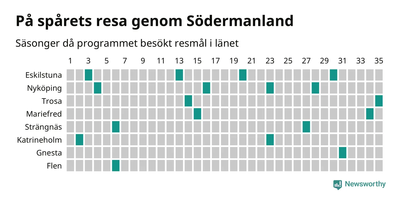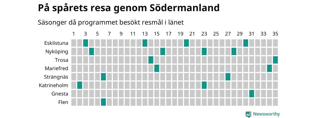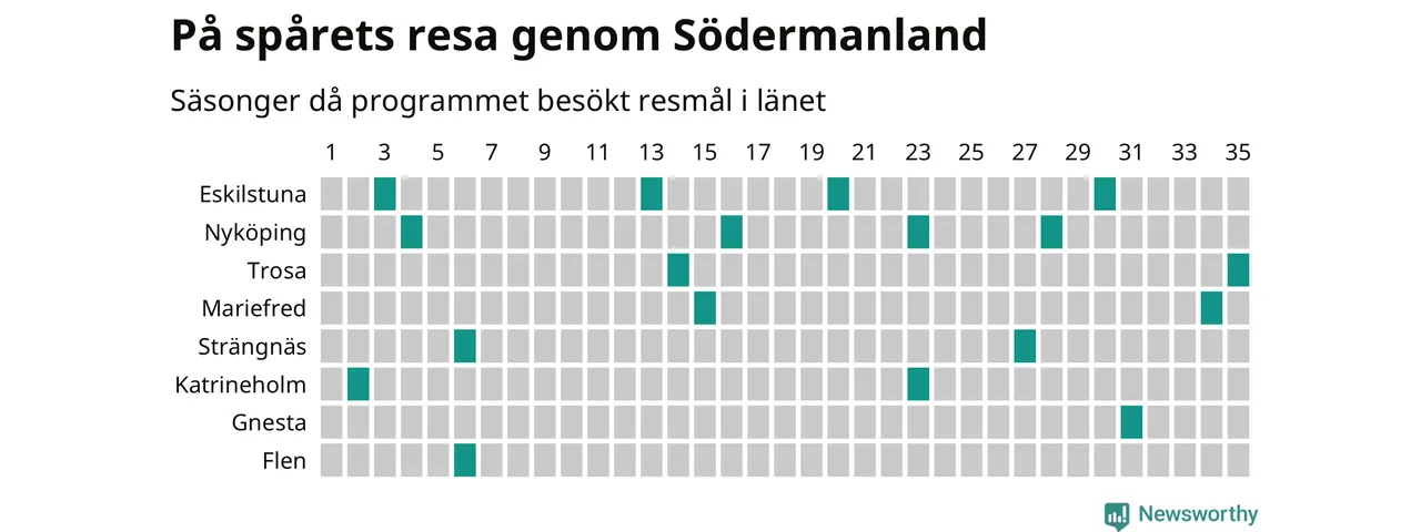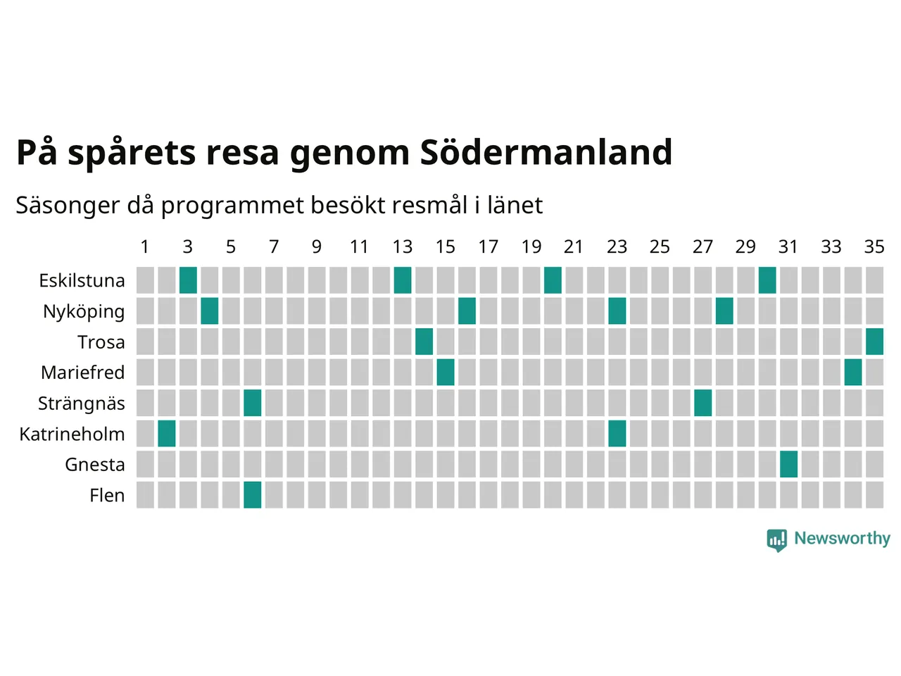 I flera år har Newsworthy samlat ett stort antal datapunkter om alla dessa tätorter för att försöka knäcka På spåret-koden. Och några saker står klart: Att det finns en järnvägsstation på orten har viss betydelse, men är inte nödvändigt. Av de 163 svenska orter som hittills fått vara med i programmet finns det perronger i 129. Av de 34 resmål utan järnvägsstation har Visby besökts oftast, sex gånger. Men det finns ytterligare ungefär 350 svenska orter med tågstation där På spåret aldrig varit.