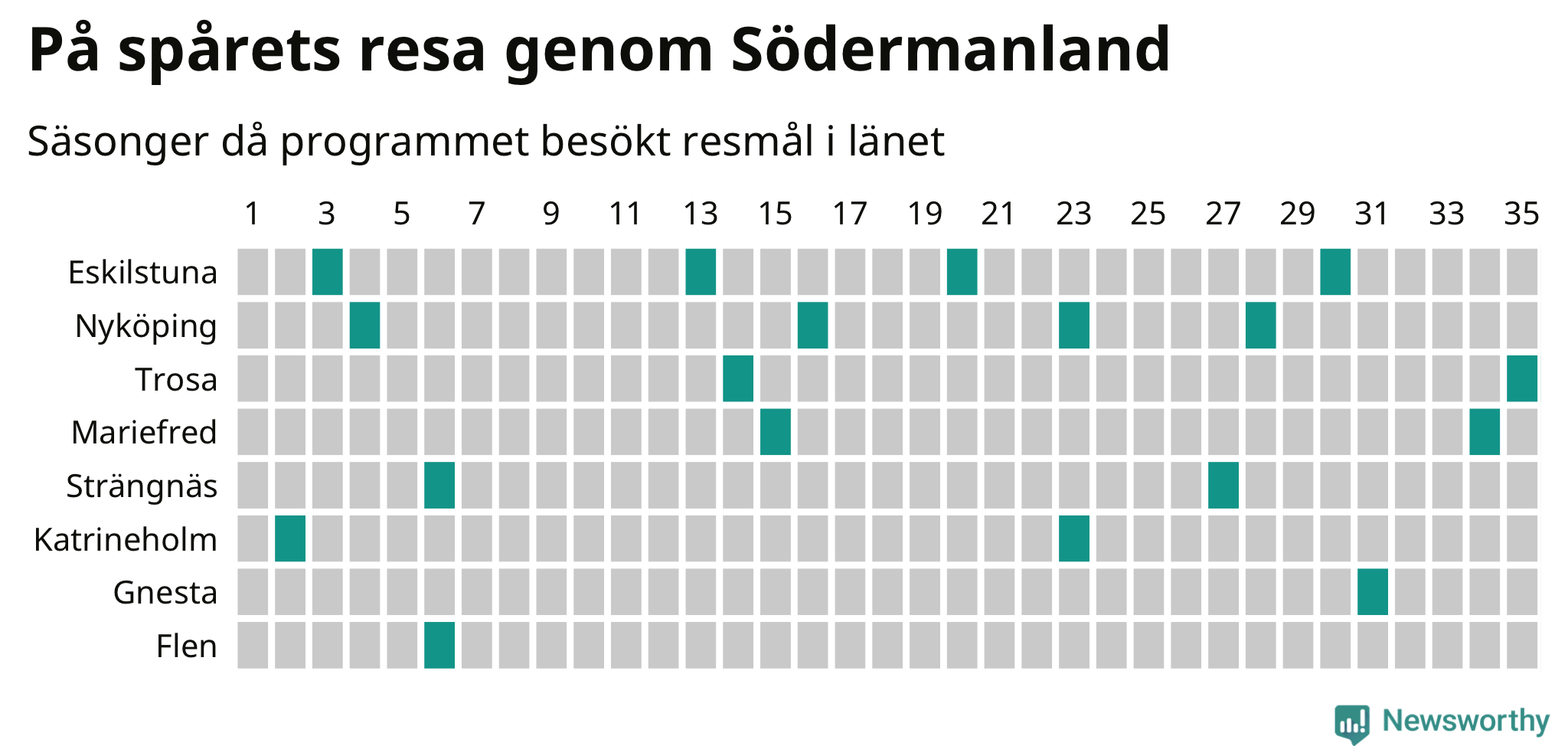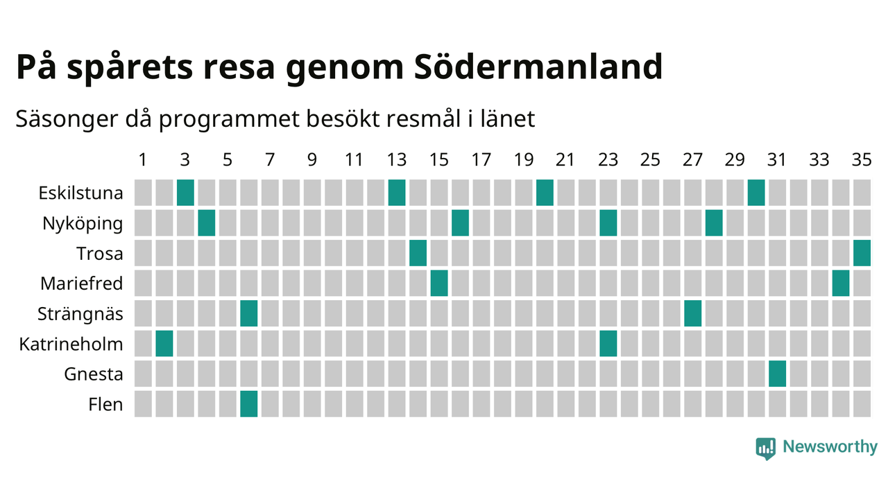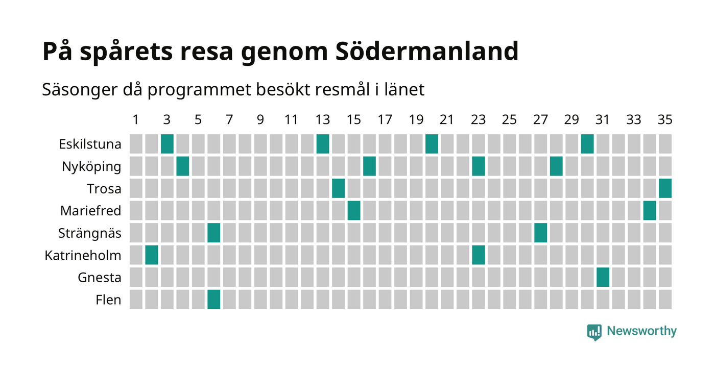 I flera år har Newsworthy samlat ett stort antal datapunkter om alla dessa tätorter för att försöka knäcka På spåret-koden. Och några saker står klart: Att det finns en järnvägsstation på orten har viss betydelse, men är inte nödvändigt. Av de 163 svenska orter som hittills fått vara med i programmet finns det perronger i 129. Av de 34 resmål utan järnvägsstation har Visby besökts oftast, sex gånger. Men det finns ytterligare ungefär 350 svenska orter med tågstation där På spåret aldrig varit.
