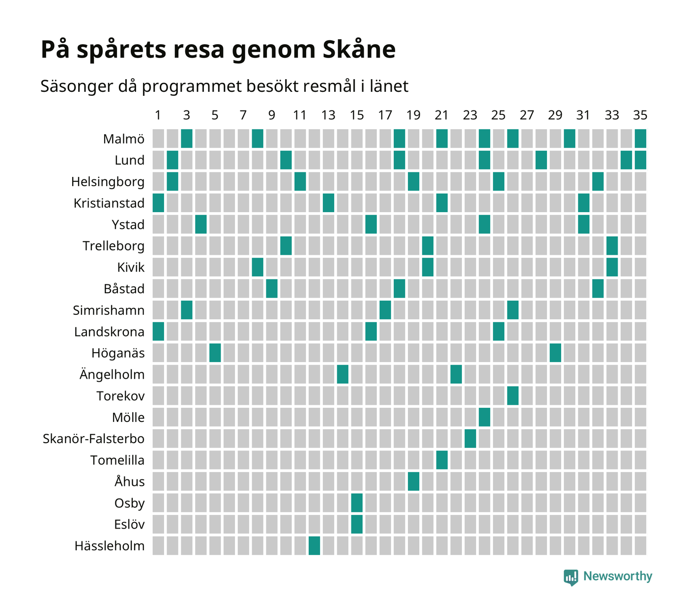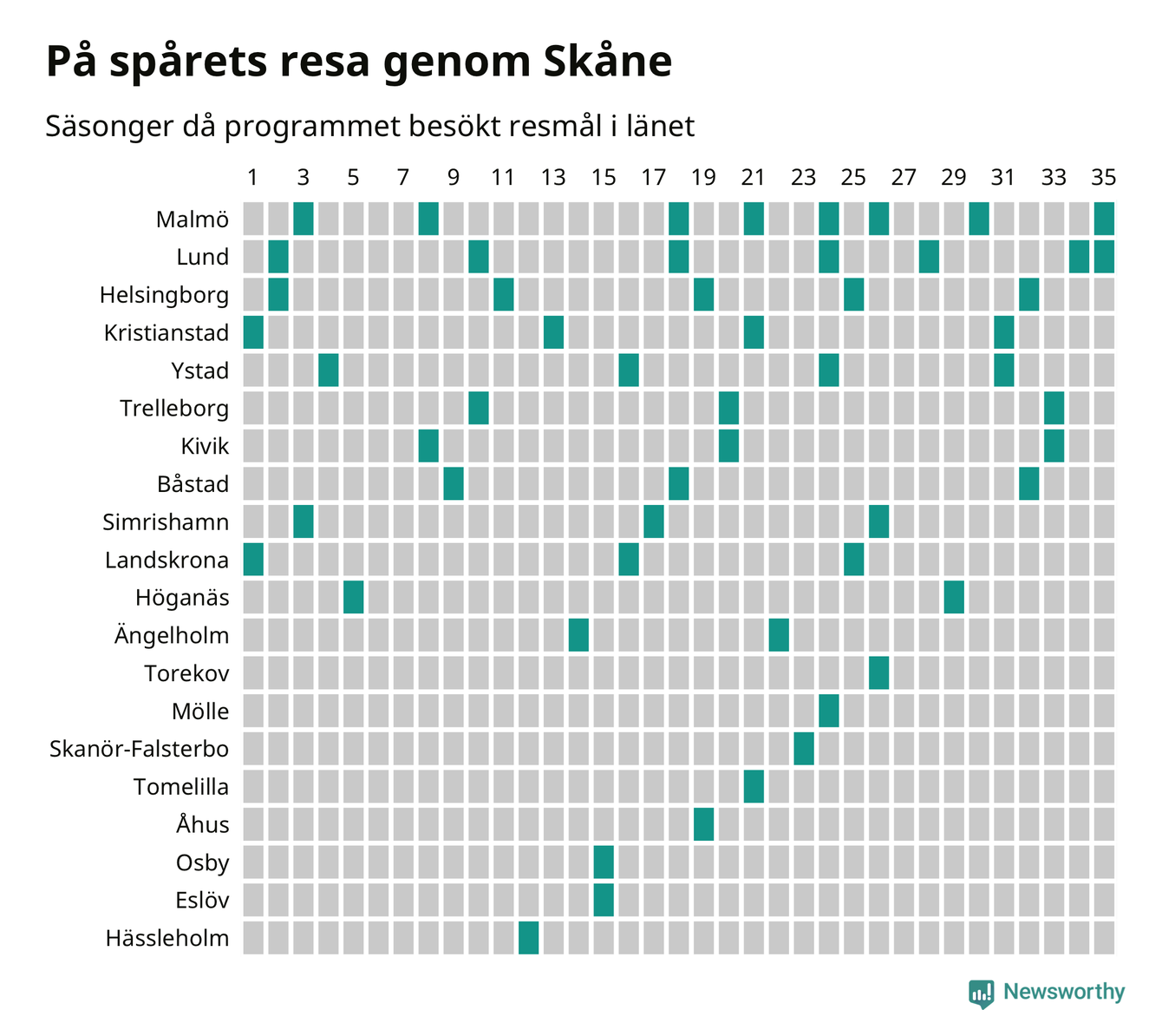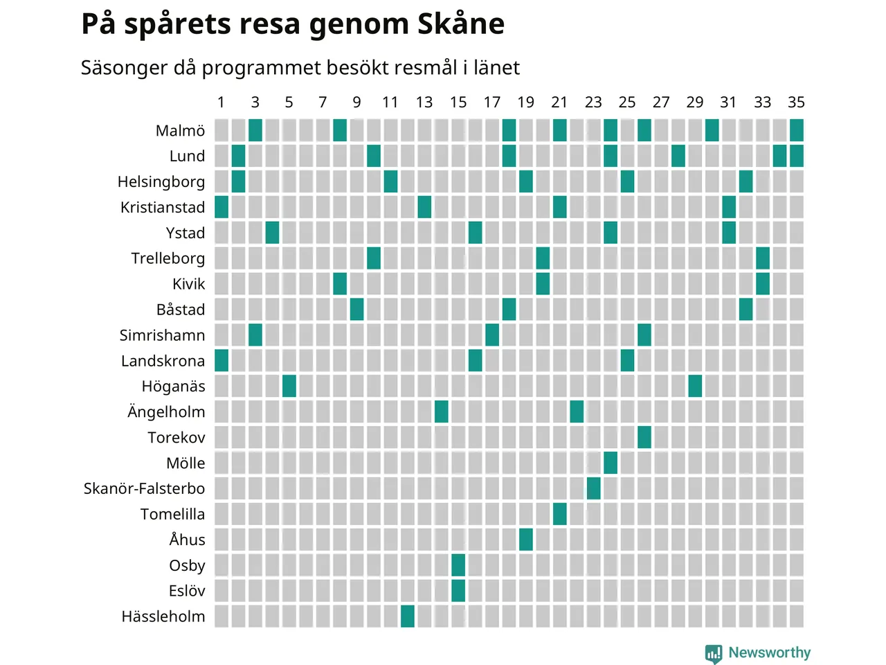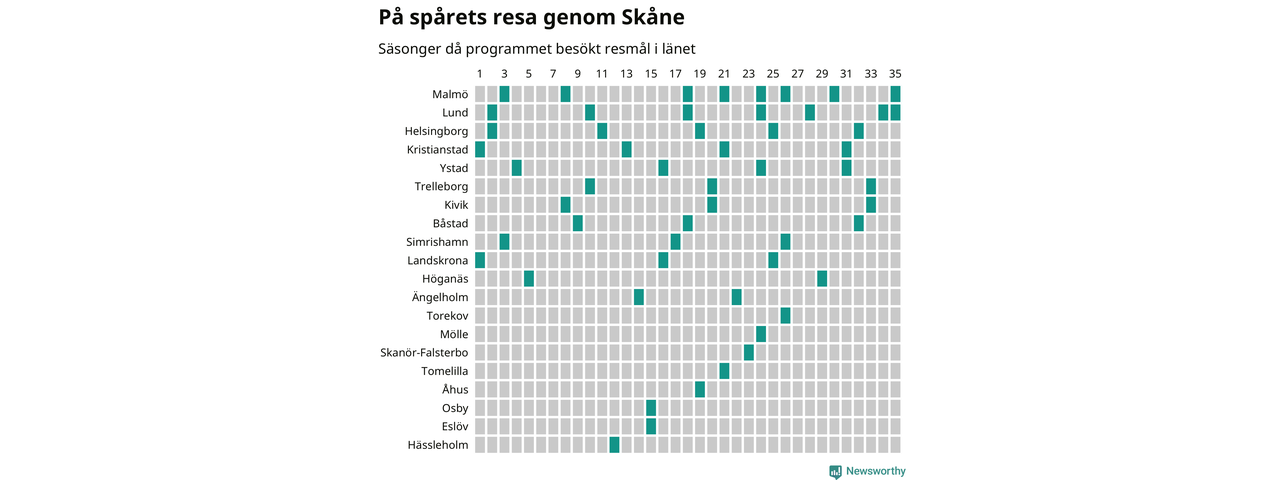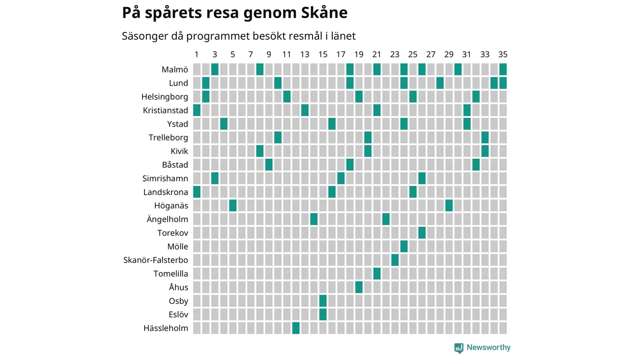 I flera år har Newsworthy samlat ett stort antal datapunkter om alla dessa tätorter för att försöka knäcka På spåret-koden. Och några saker står klart: Att det finns en järnvägsstation på orten har viss betydelse, men är inte nödvändigt. Av de 163 svenska orter som hittills fått vara med i programmet finns det perronger i 129. Av de 34 resmål utan järnvägsstation har Visby besökts oftast, sex gånger. Men det finns ytterligare ungefär 350 svenska orter med tågstation där På spåret aldrig varit.