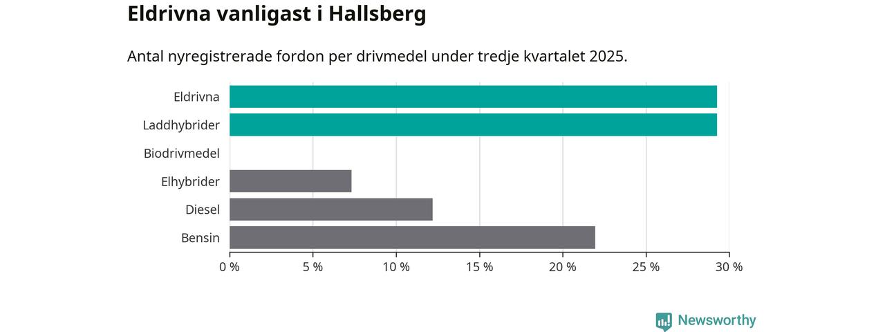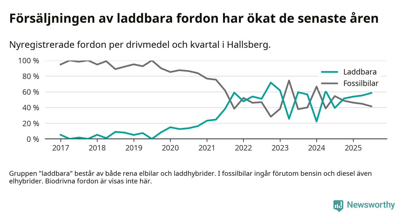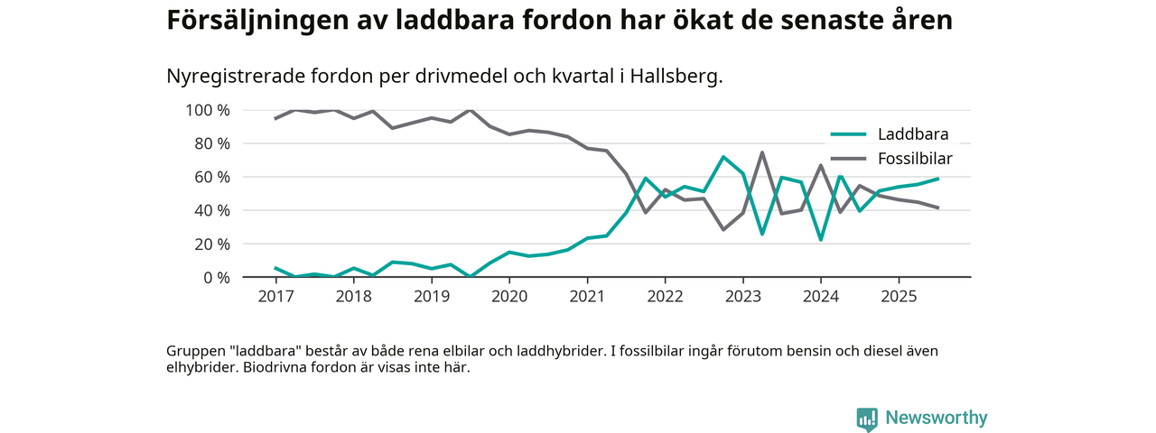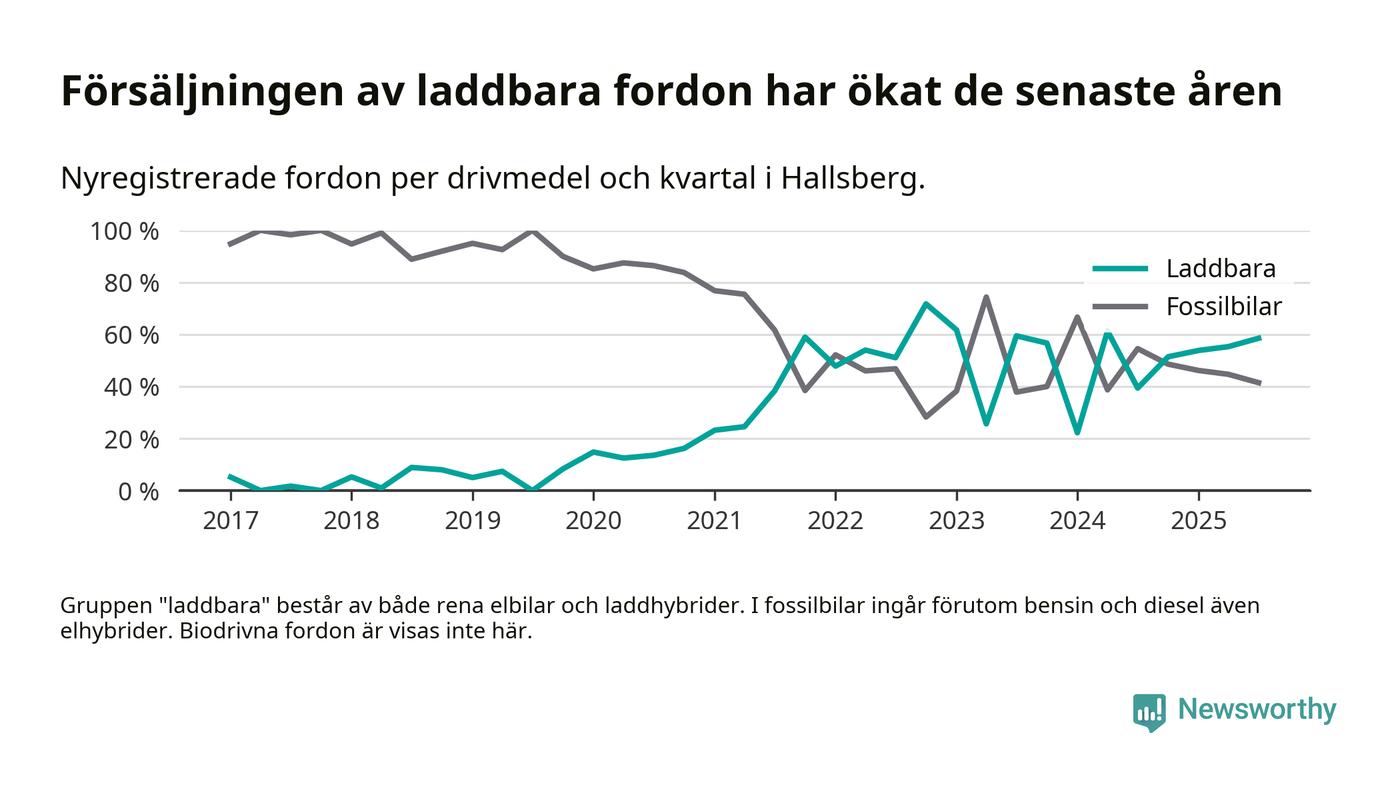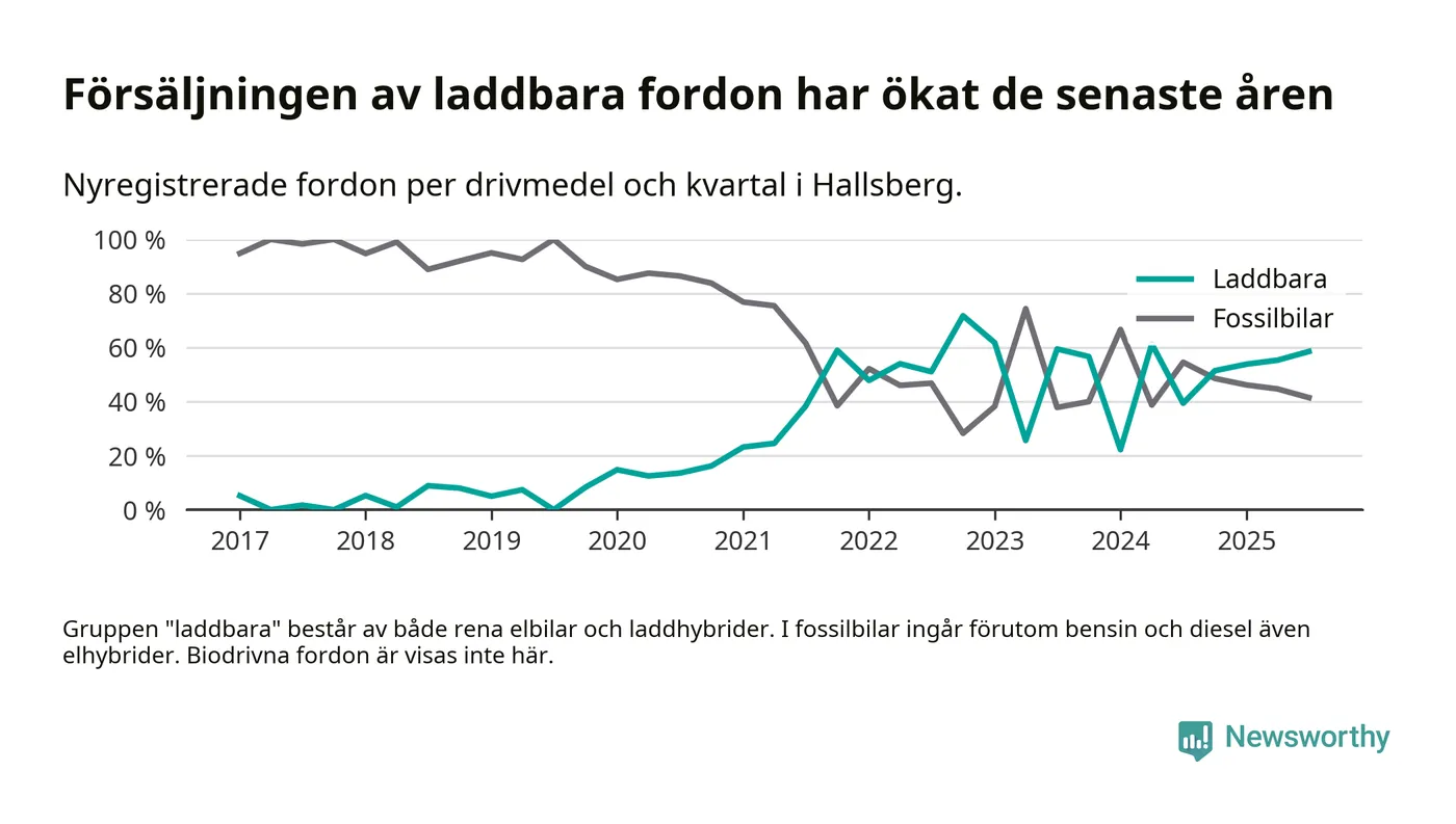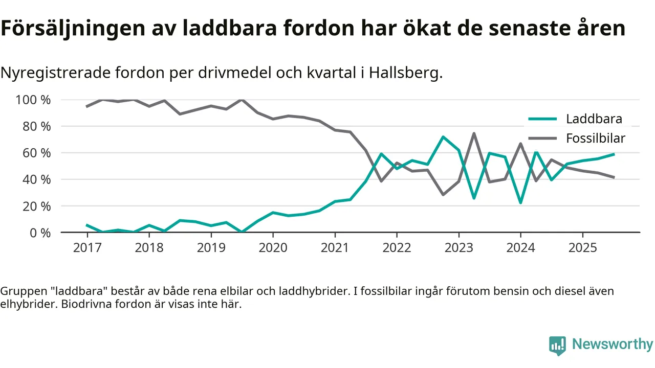 Under tredje kvartalet 2025 var 59 procent av alla nyregistrerade personbilar i Hallsberg laddbara (sammanlagt registrerades 41 nya bilar). Merparten av de laddbara bilarna var rena elbilar (29 procent av alla).