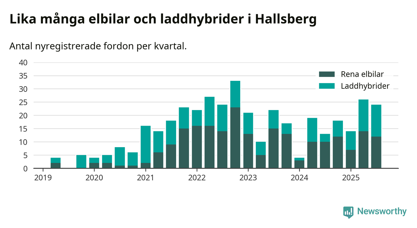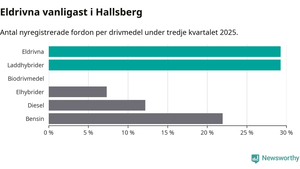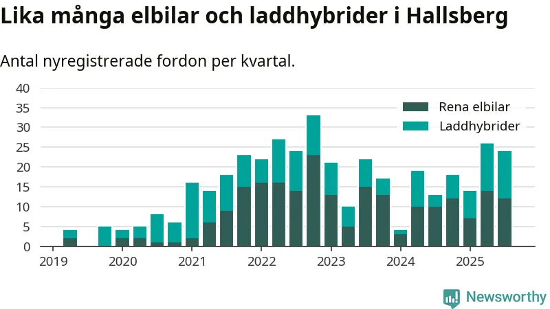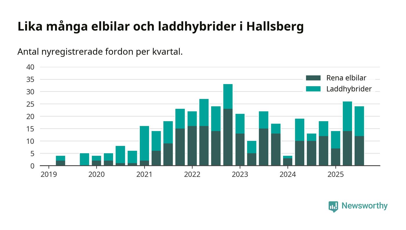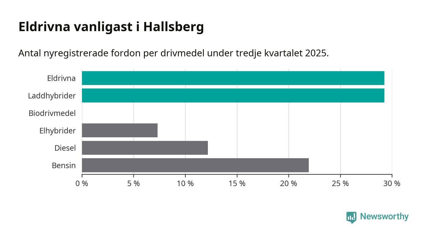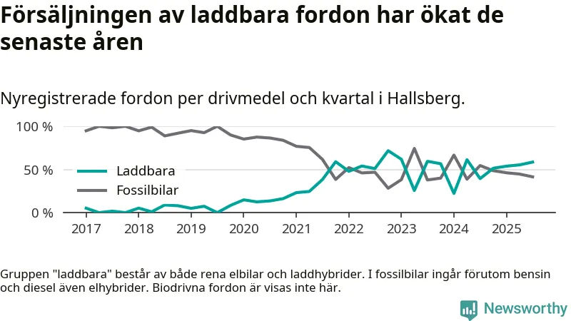 Under tredje kvartalet 2025 var 59 procent av alla nyregistrerade personbilar i Hallsberg laddbara (sammanlagt registrerades 41 nya bilar). Merparten av de laddbara bilarna var rena elbilar (29 procent av alla).