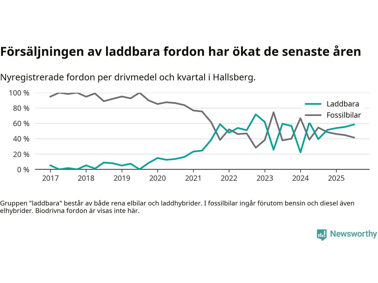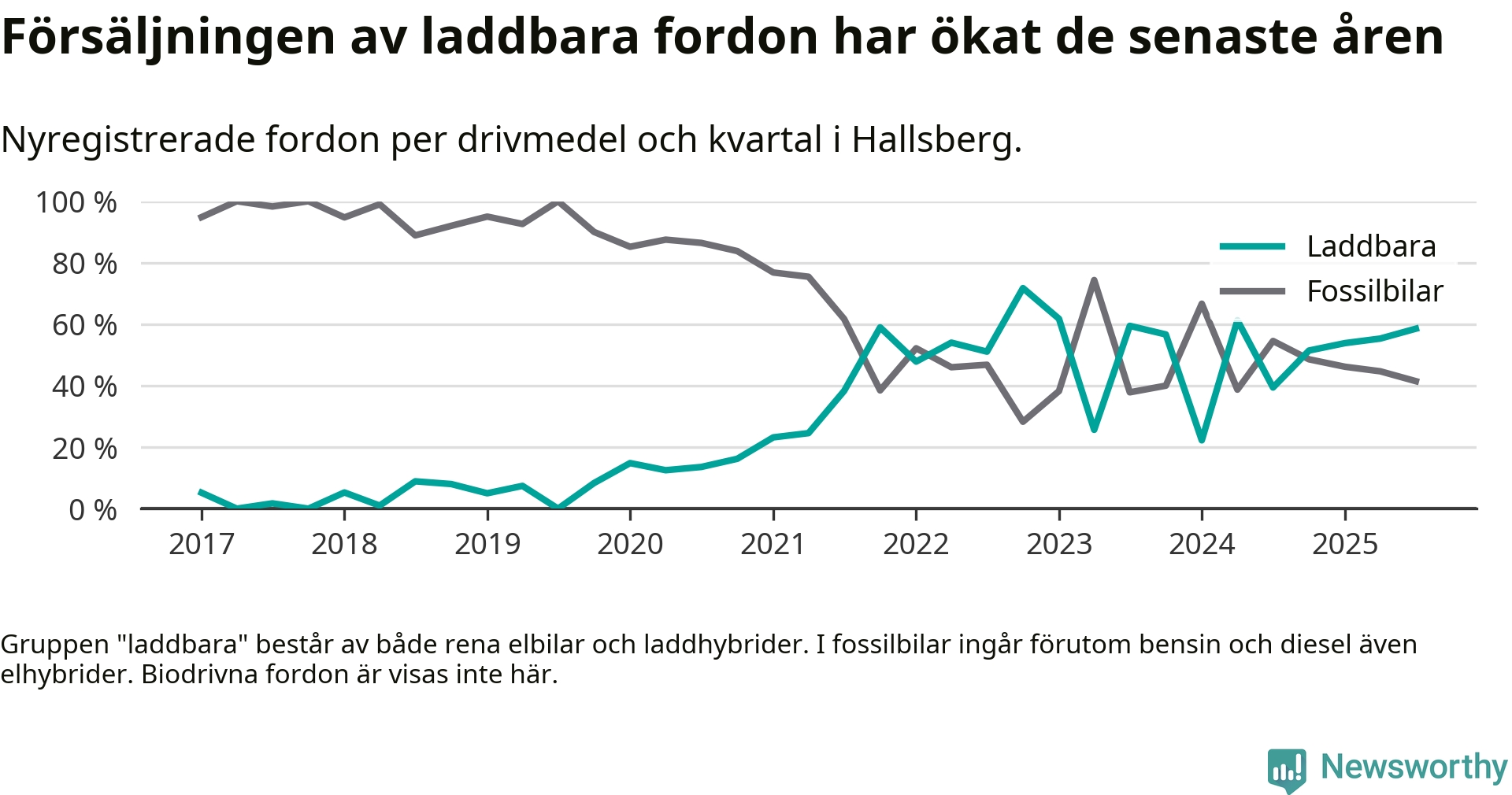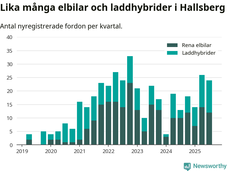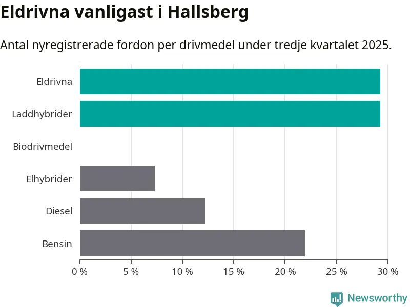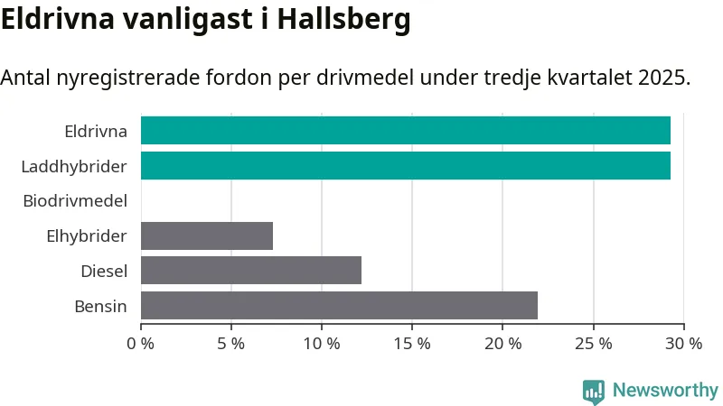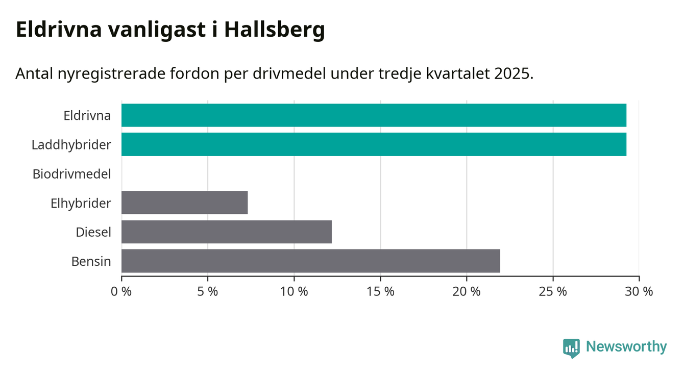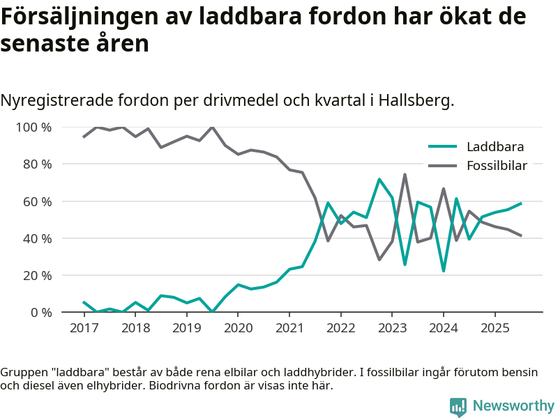 Under tredje kvartalet 2025 var 59 procent av alla nyregistrerade personbilar i Hallsberg laddbara (sammanlagt registrerades 41 nya bilar). Merparten av de laddbara bilarna var rena elbilar (29 procent av alla).