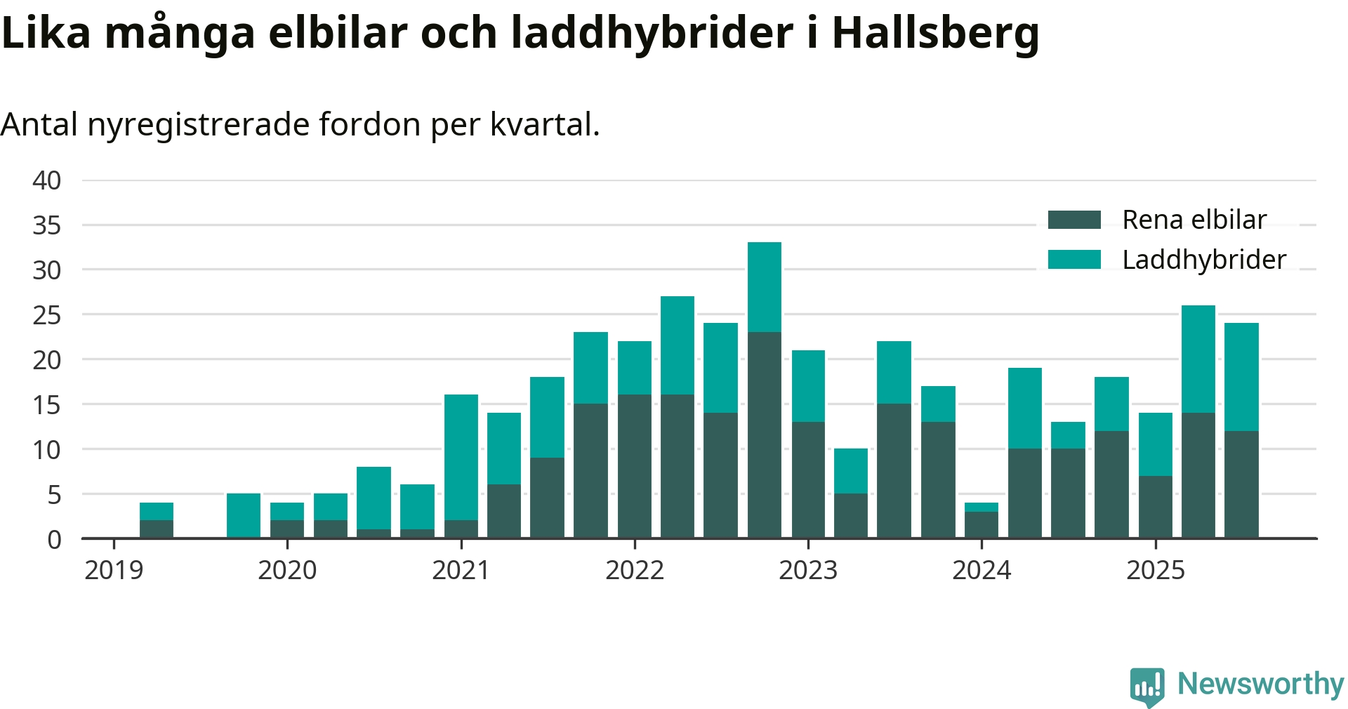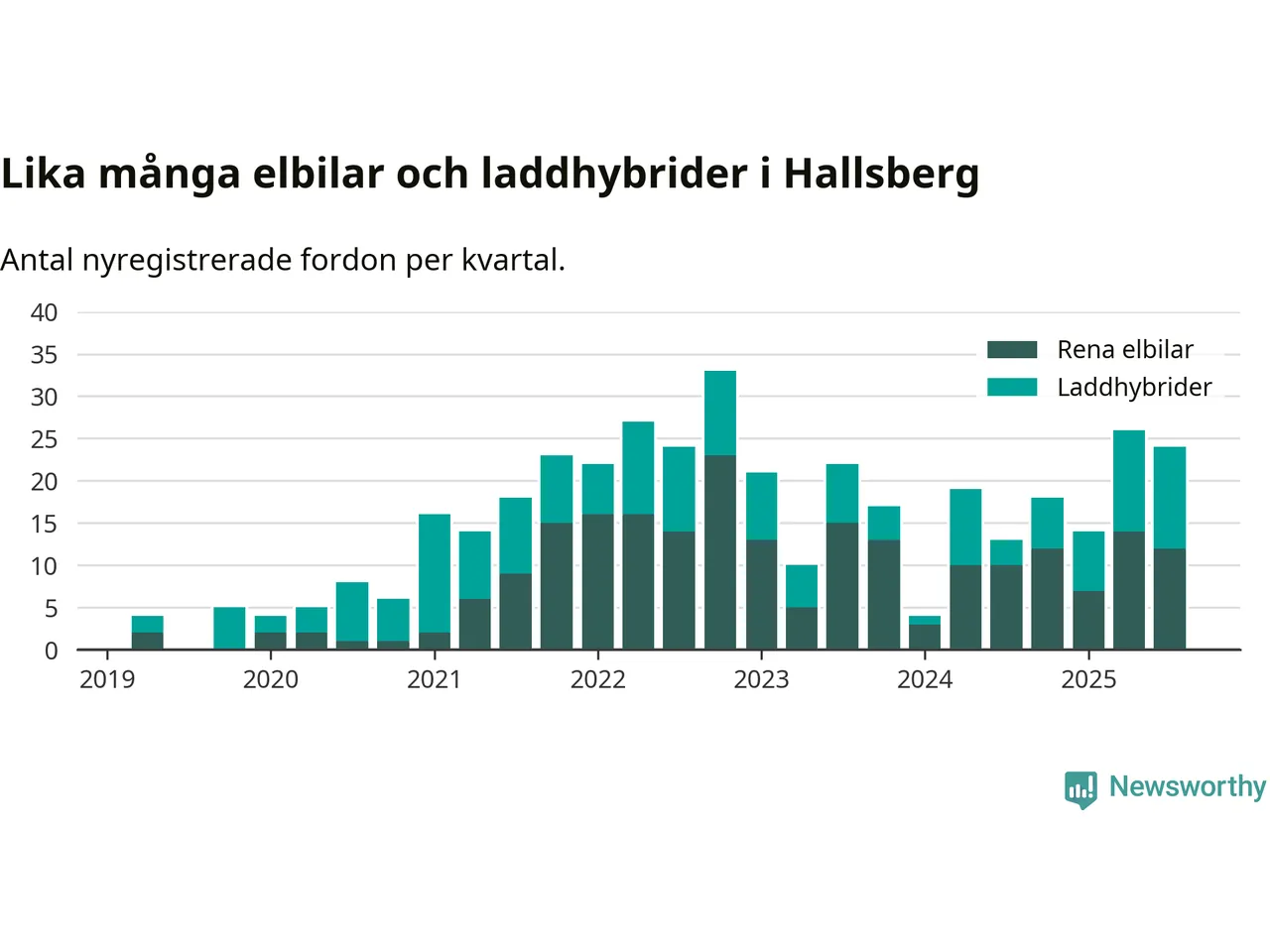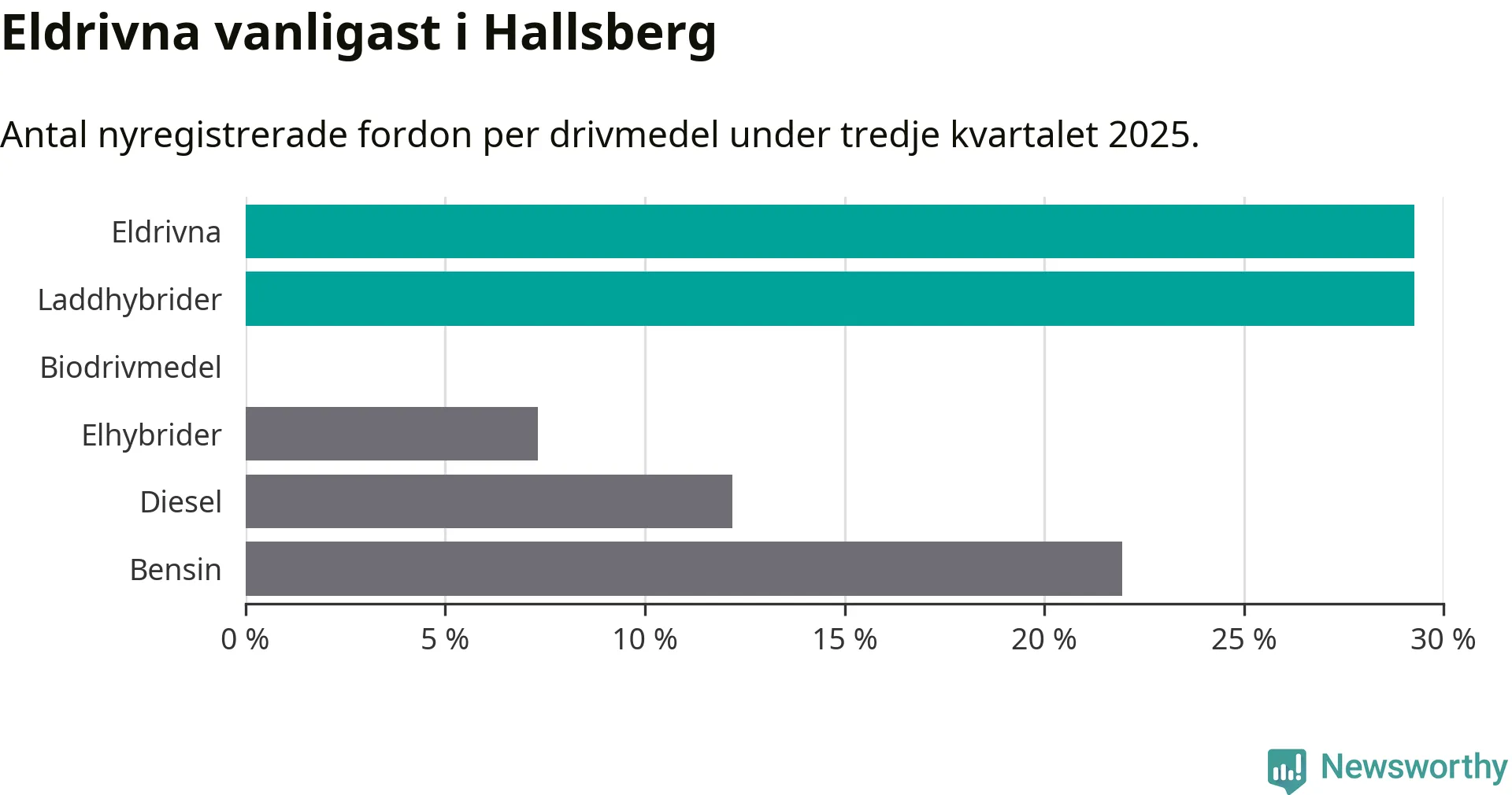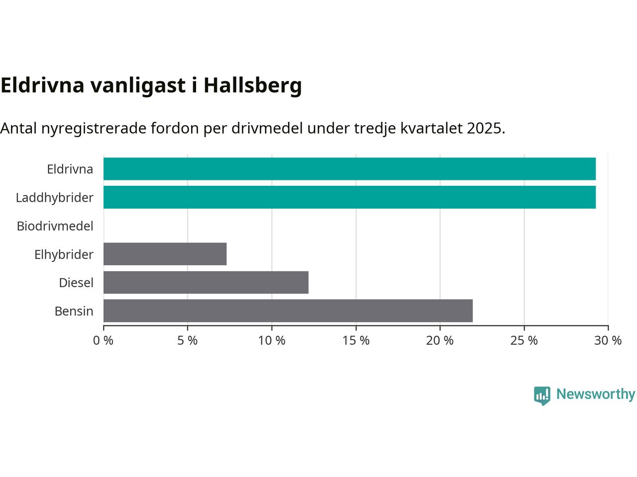 Under tredje kvartalet 2025 var 59 procent av alla nyregistrerade personbilar i Hallsberg laddbara (sammanlagt registrerades 41 nya bilar). Merparten av de laddbara bilarna var rena elbilar (29 procent av alla).
