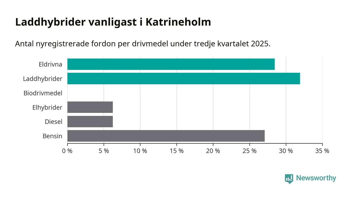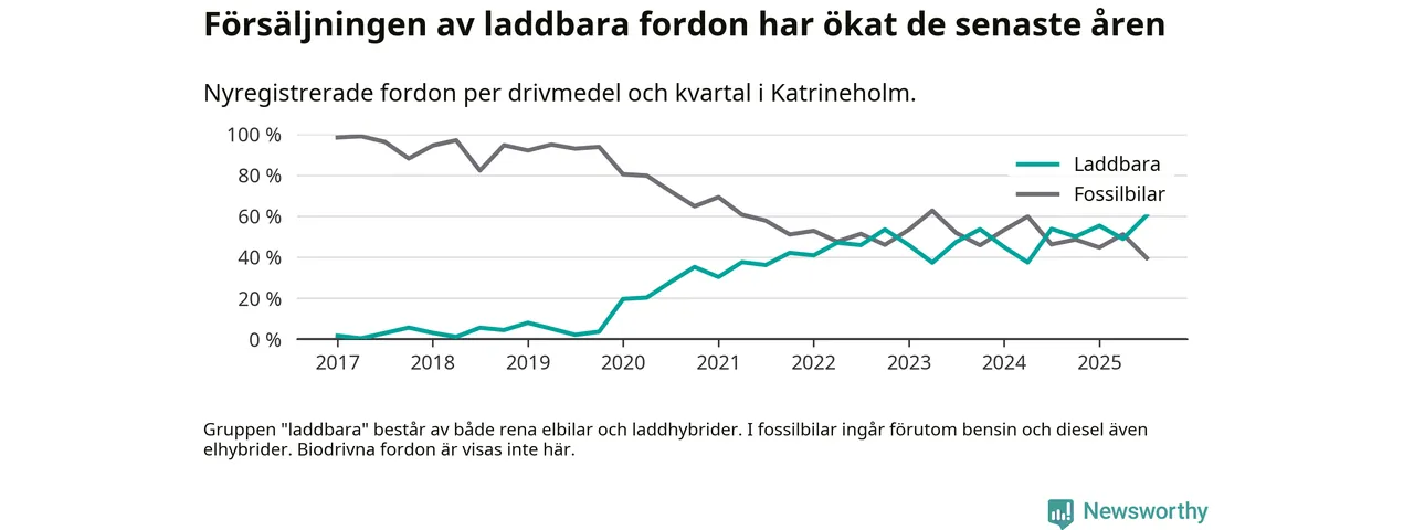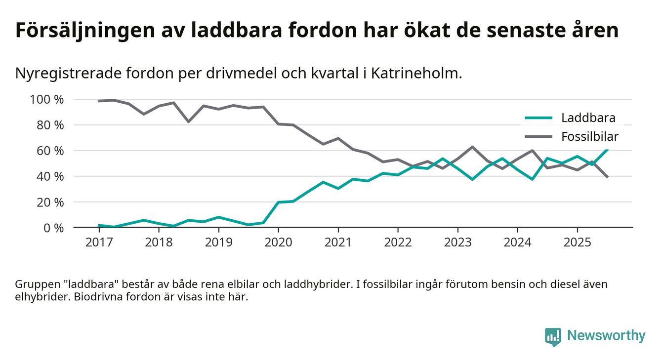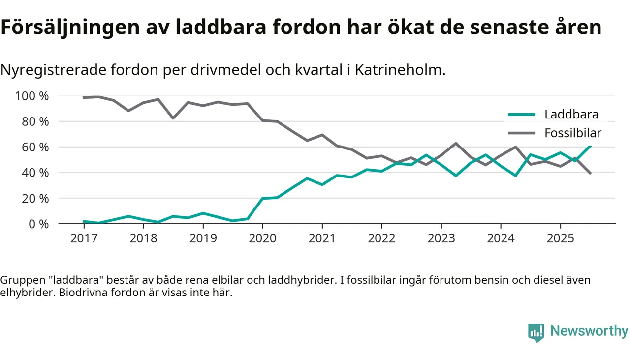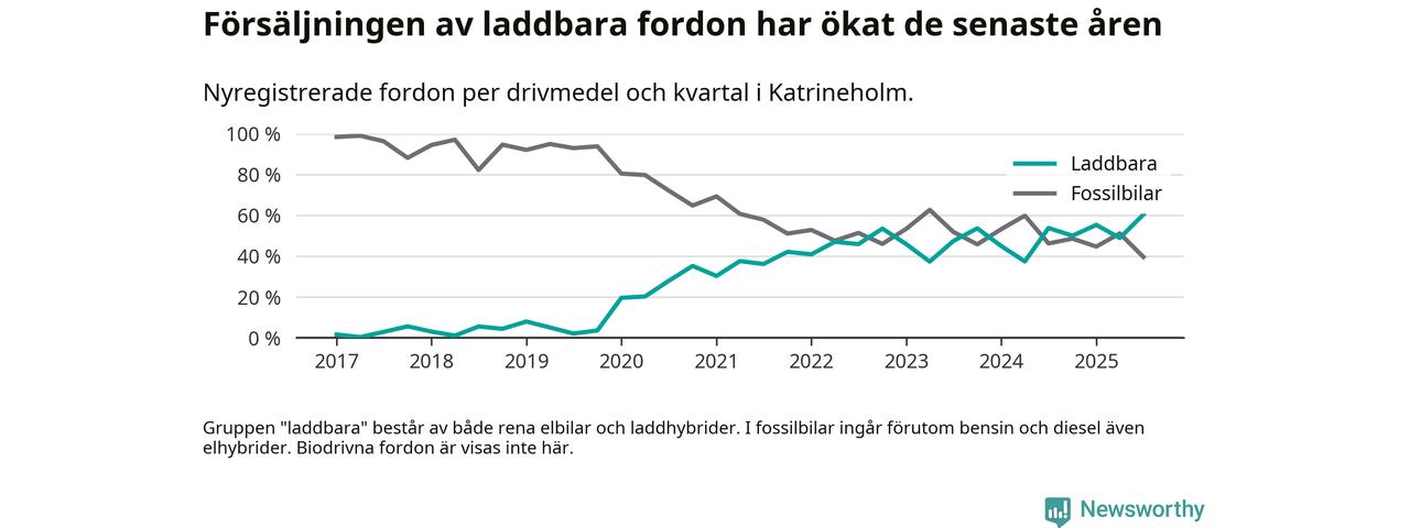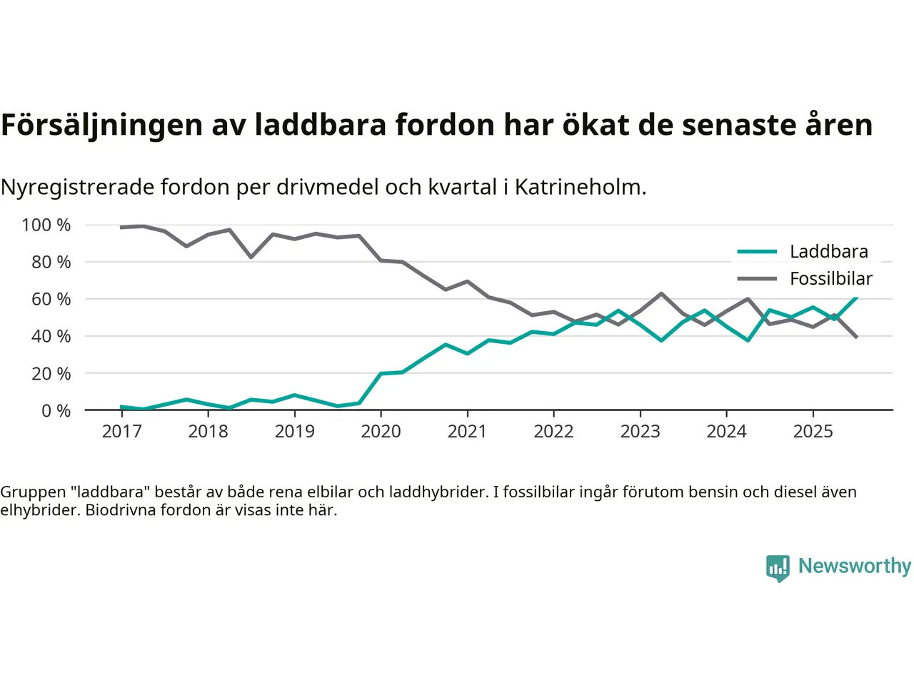 Under tredje kvartalet 2025 var 60 procent av alla nyregistrerade personbilar i Katrineholm laddbara (sammanlagt registrerades 144 nya bilar). Merparten av de laddbara bilarna var så kallade laddhybrider, det vill säga fordon som går att ladda och köra på el, men som även har en förbränningsmotor. 28 procent av alla nya bilar var rena elbilar.