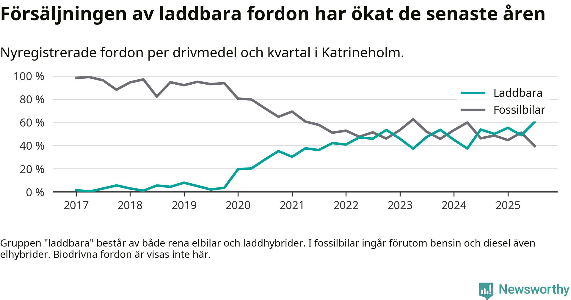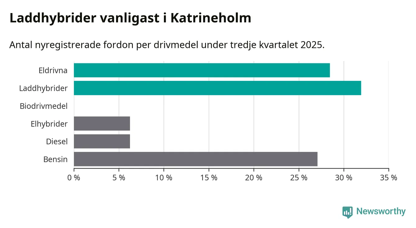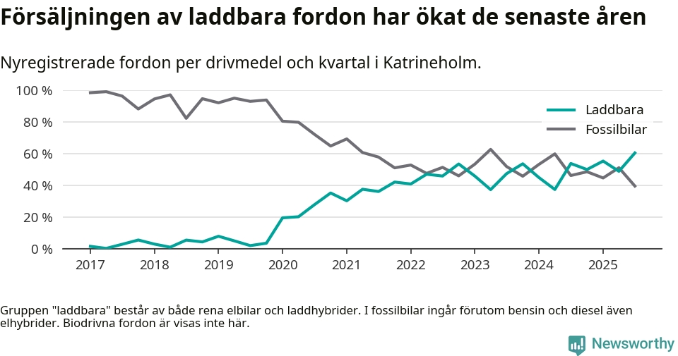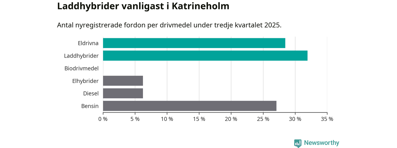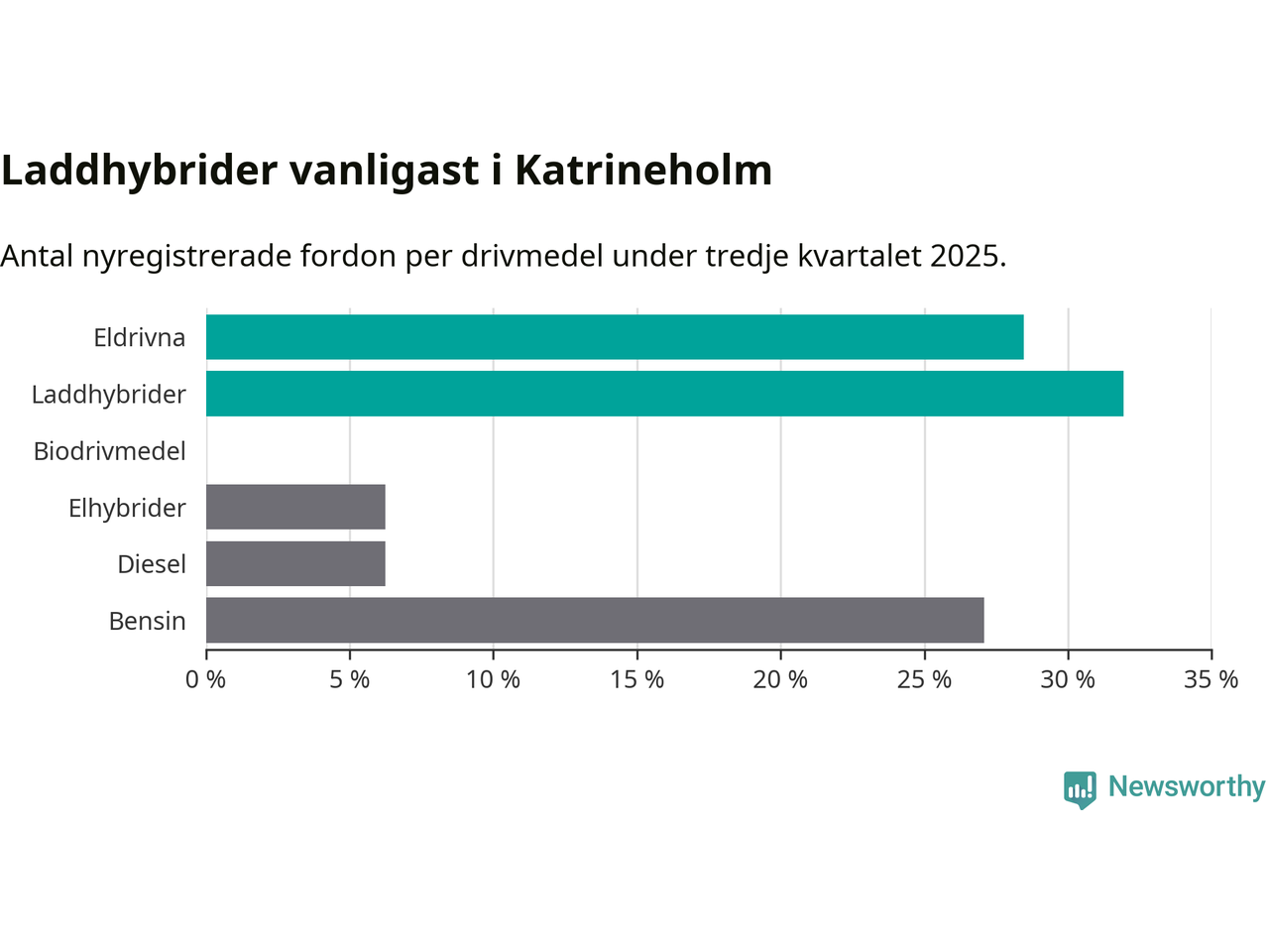 Under tredje kvartalet 2025 var 60 procent av alla nyregistrerade personbilar i Katrineholm laddbara (sammanlagt registrerades 144 nya bilar). Merparten av de laddbara bilarna var så kallade laddhybrider, det vill säga fordon som går att ladda och köra på el, men som även har en förbränningsmotor. 28 procent av alla nya bilar var rena elbilar.