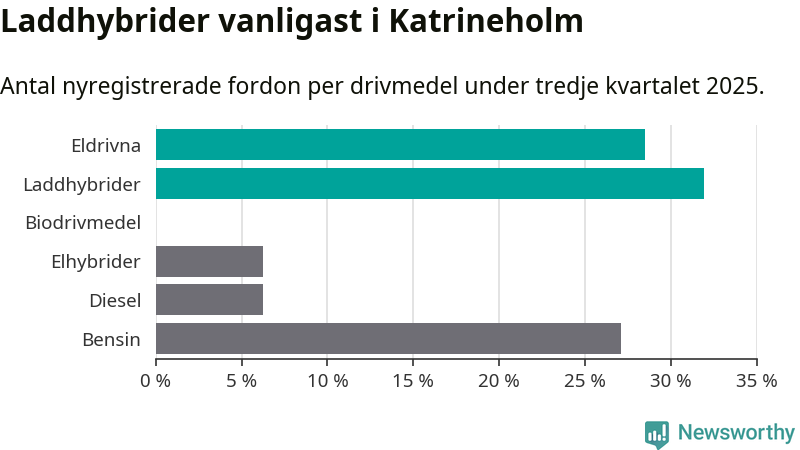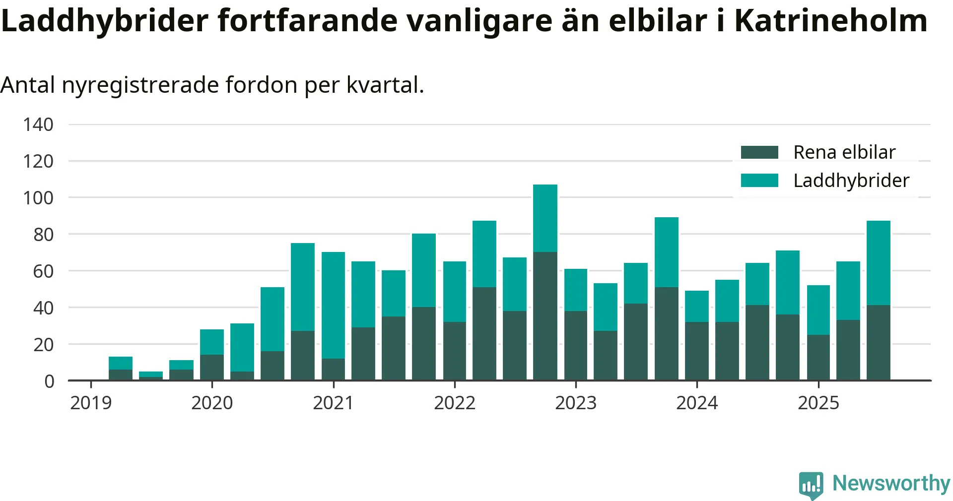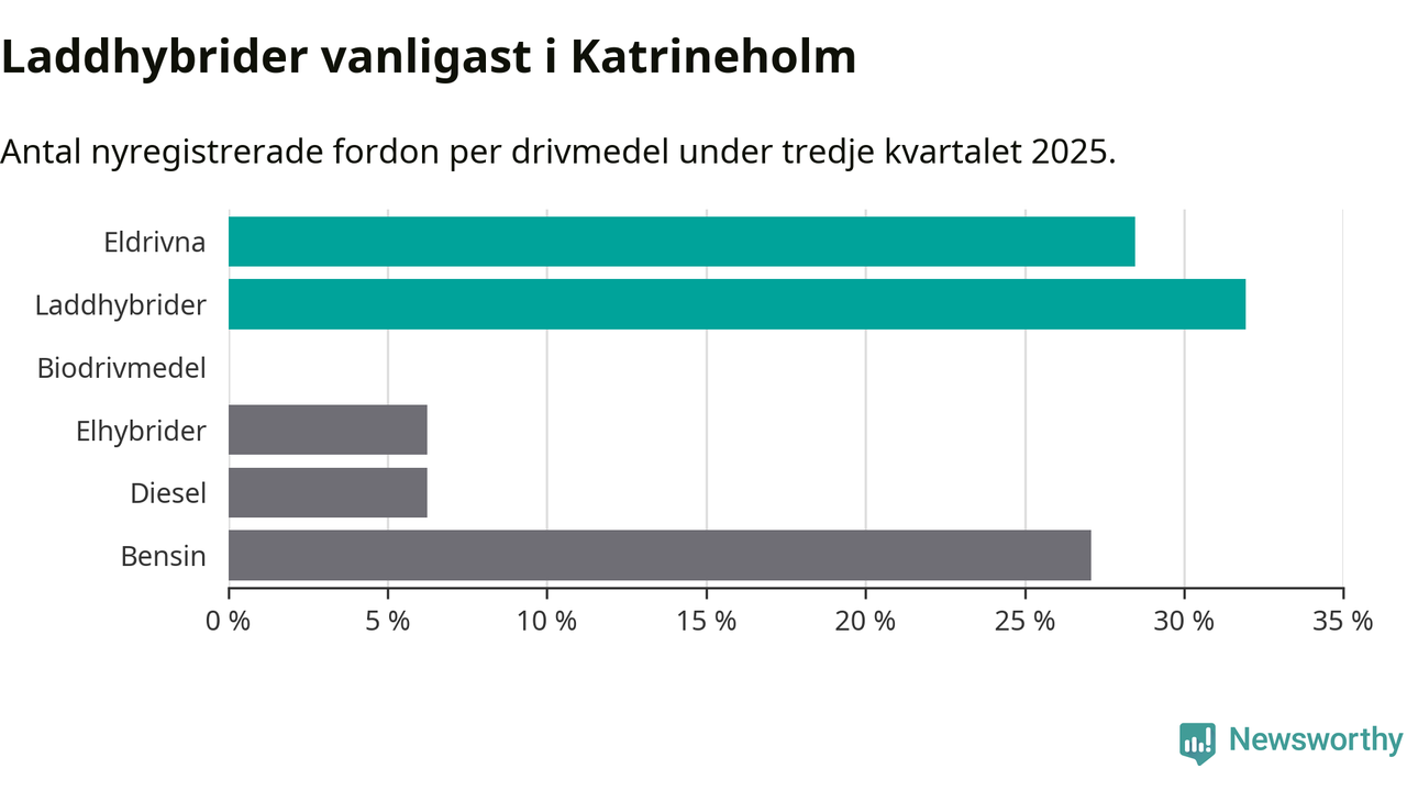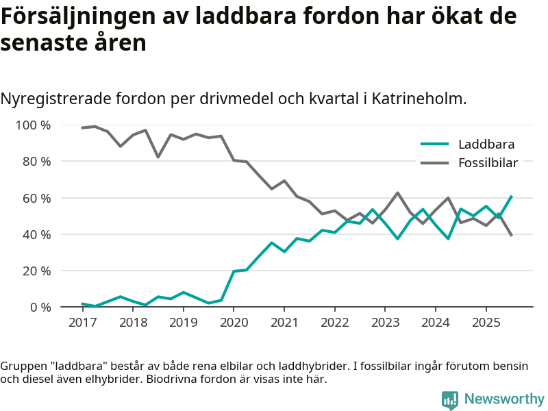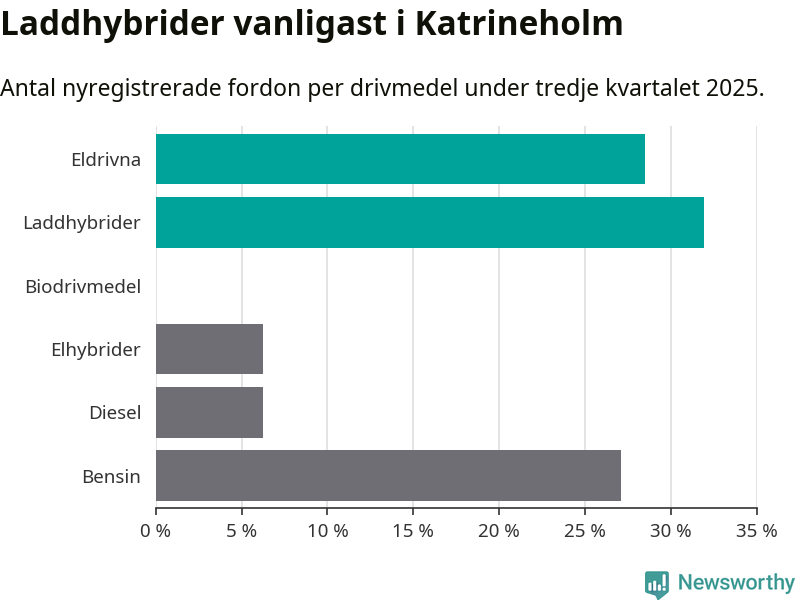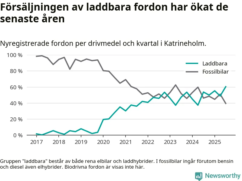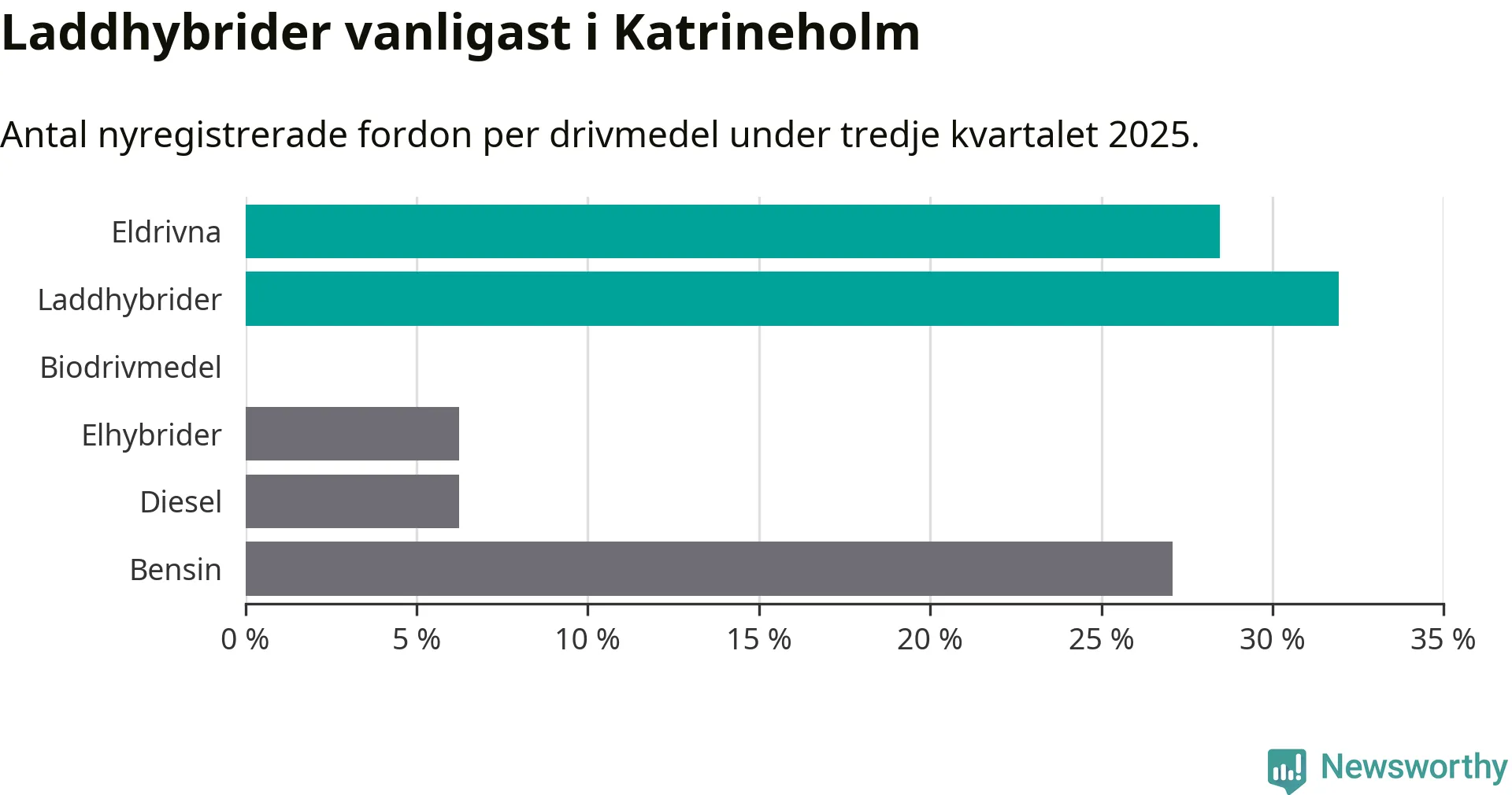 Under tredje kvartalet 2025 var 60 procent av alla nyregistrerade personbilar i Katrineholm laddbara (sammanlagt registrerades 144 nya bilar). Merparten av de laddbara bilarna var så kallade laddhybrider, det vill säga fordon som går att ladda och köra på el, men som även har en förbränningsmotor. 28 procent av alla nya bilar var rena elbilar.
