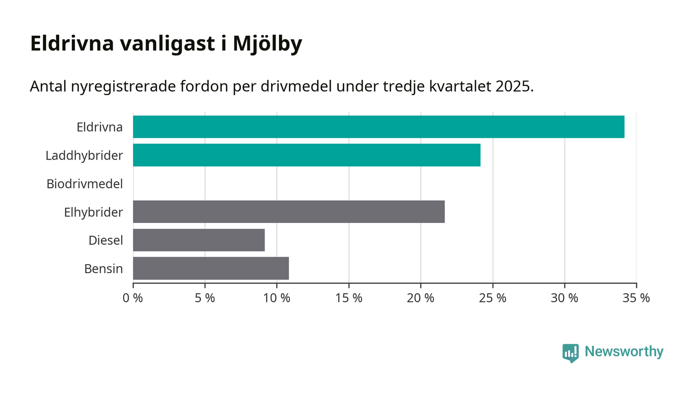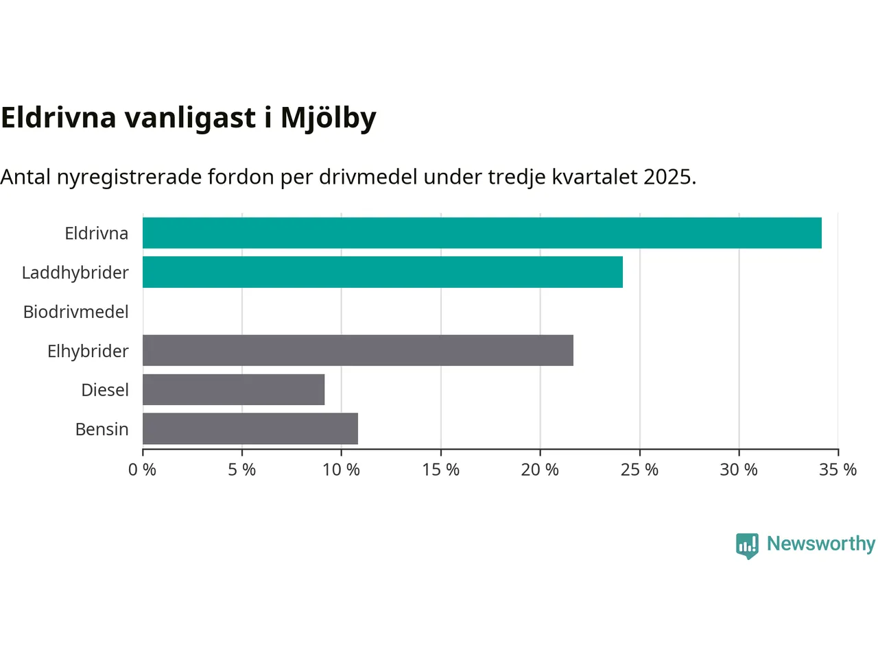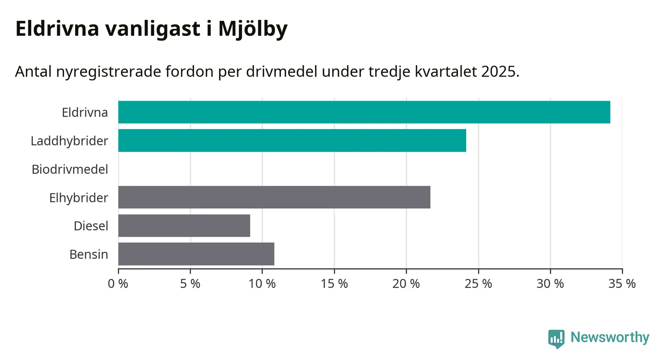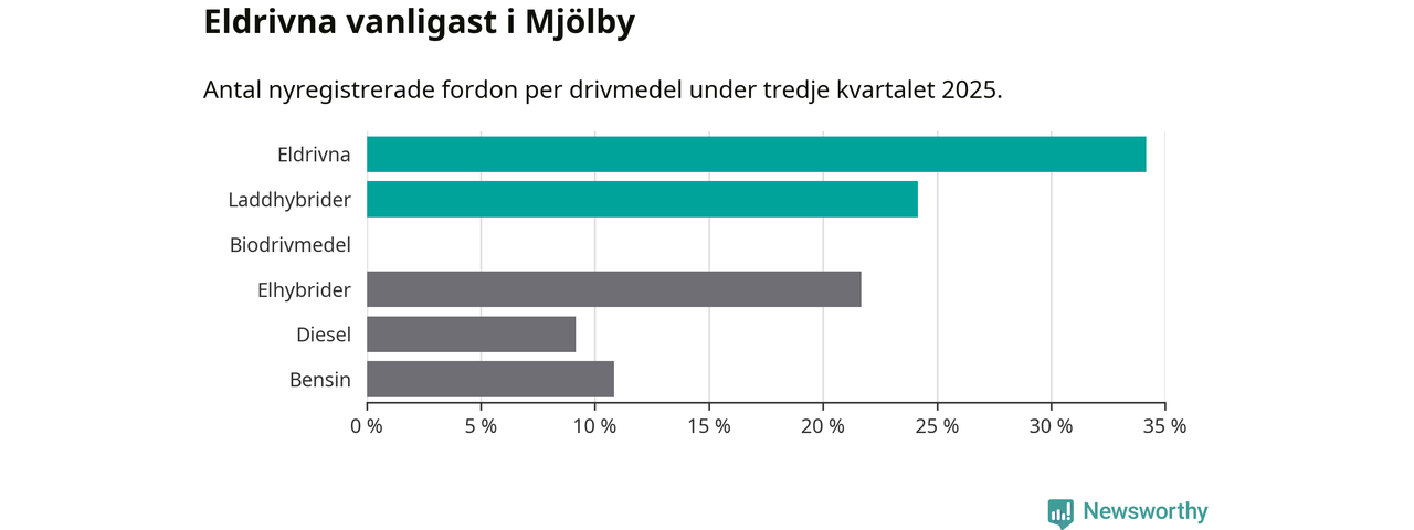 Under tredje kvartalet 2025 var 58 procent av alla nyregistrerade personbilar i Mjölby laddbara (sammanlagt registrerades 120 nya bilar). Merparten av de laddbara bilarna var rena elbilar (34 procent av alla).