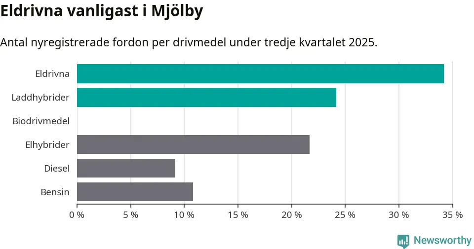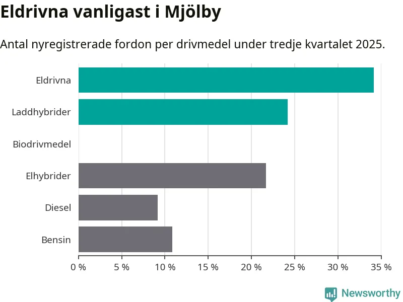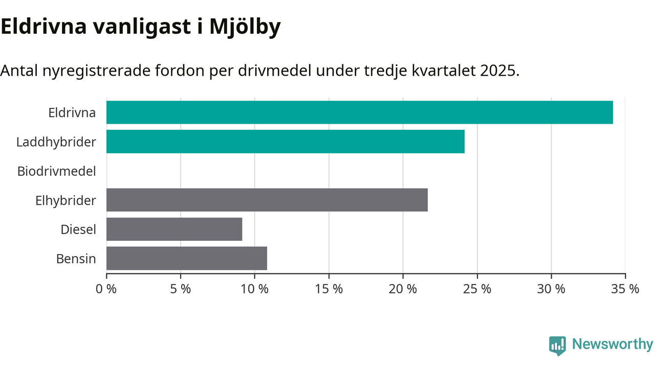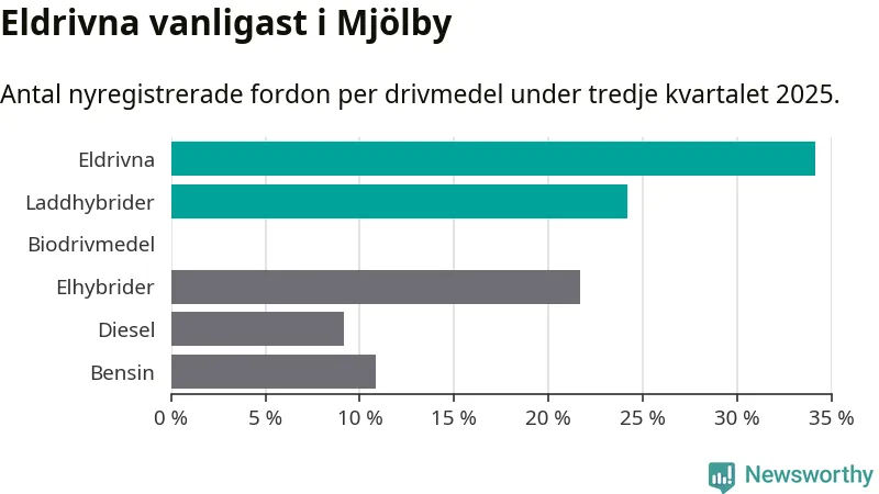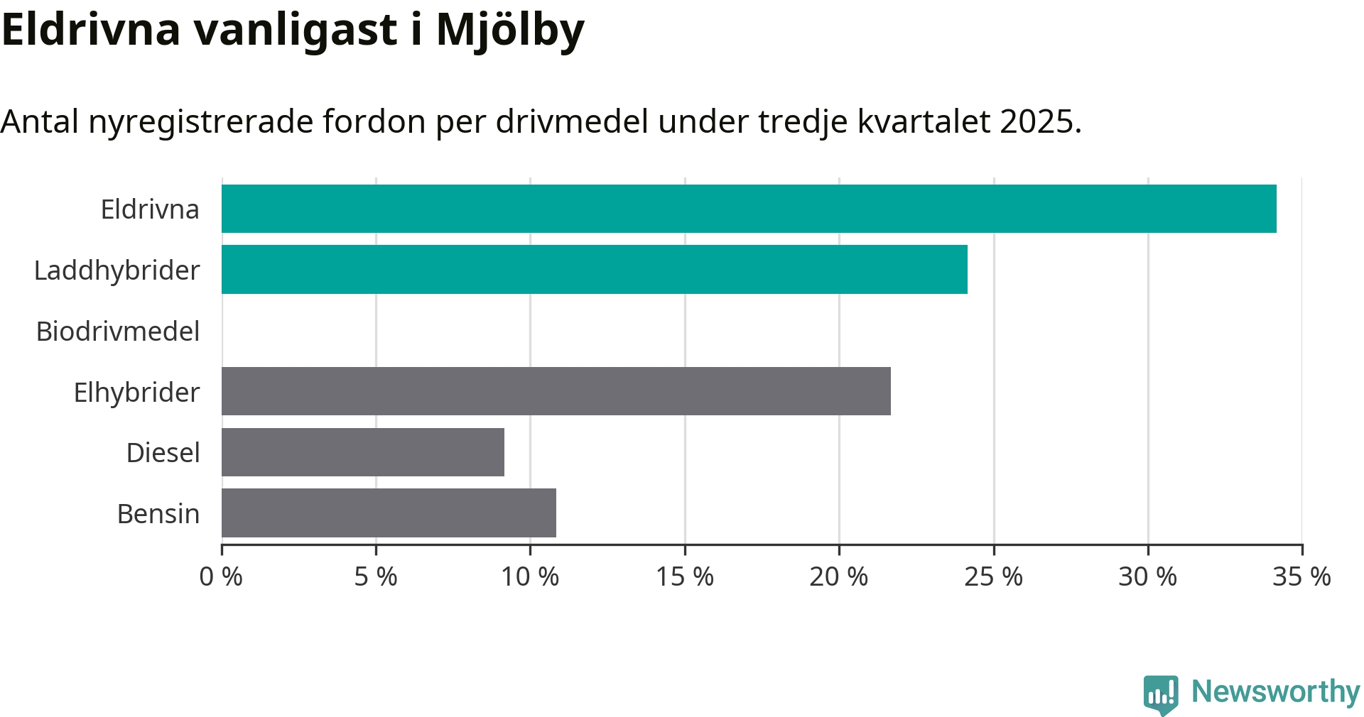 Under tredje kvartalet 2025 var 58 procent av alla nyregistrerade personbilar i Mjölby laddbara (sammanlagt registrerades 120 nya bilar). Merparten av de laddbara bilarna var rena elbilar (34 procent av alla).