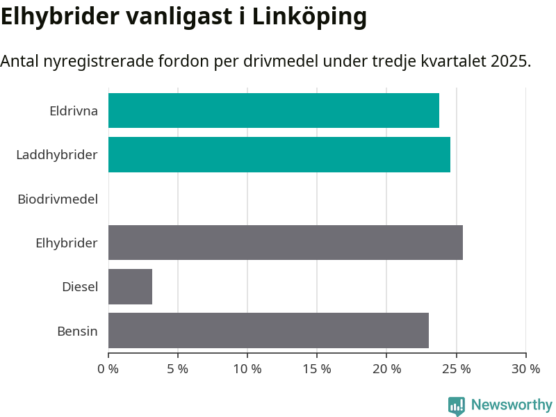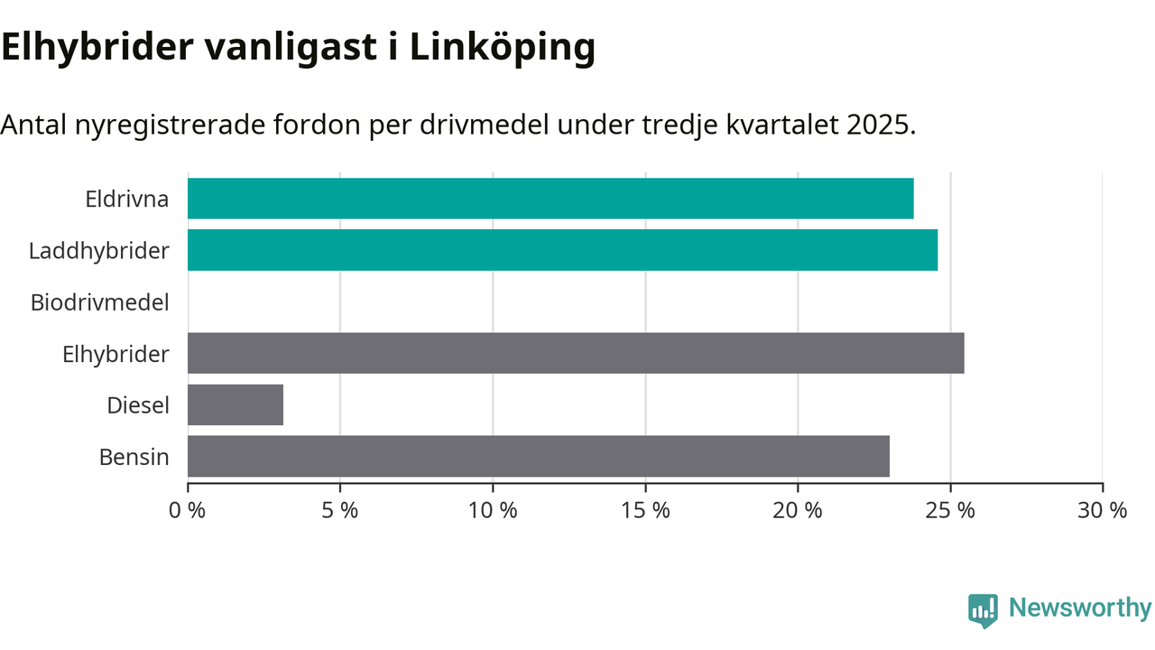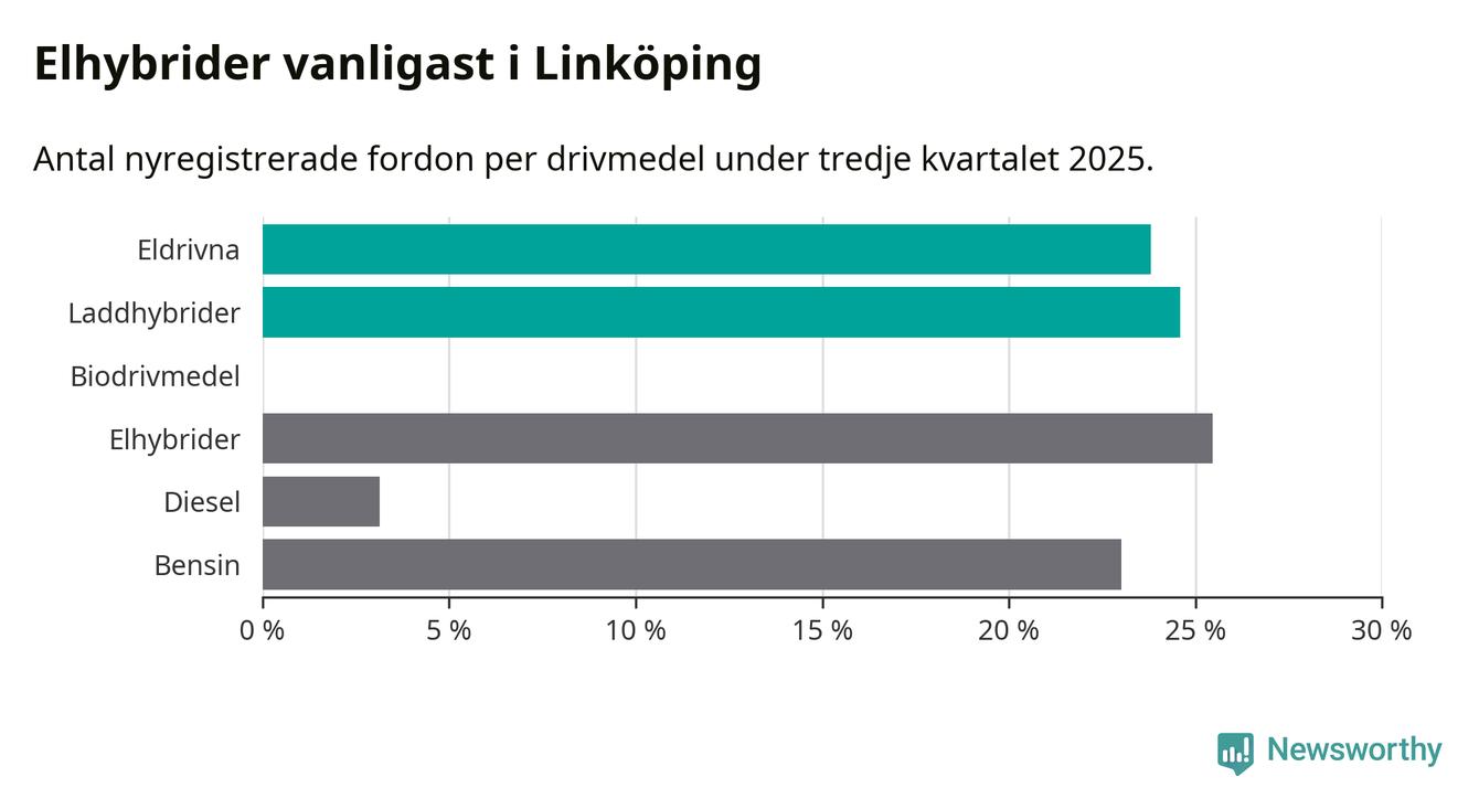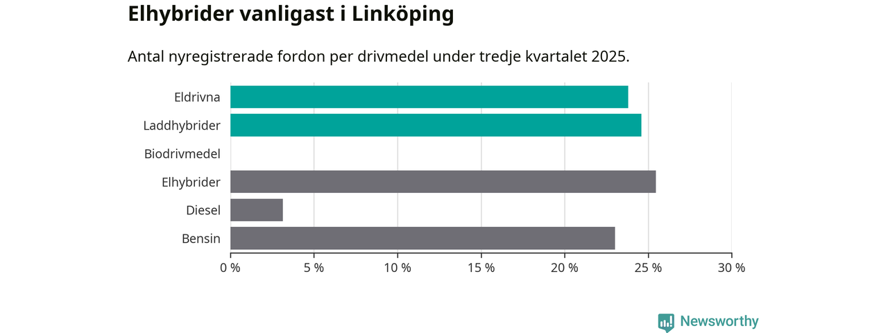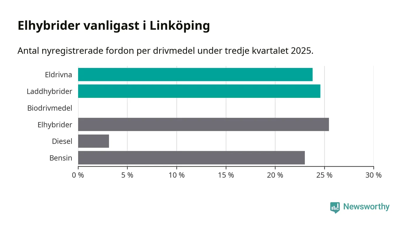 Under tredje kvartalet 2025 var 48 procent av alla nyregistrerade personbilar i Linköping laddbara (sammanlagt registrerades 1 143 nya bilar). Merparten av de laddbara bilarna var så kallade laddhybrider, det vill säga fordon som går att ladda och köra på el, men som även har en förbränningsmotor. 24 procent av alla nya bilar var rena elbilar.