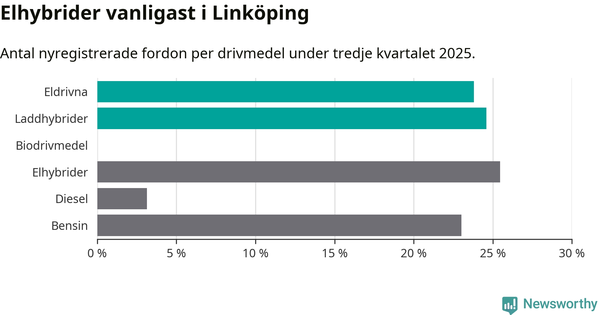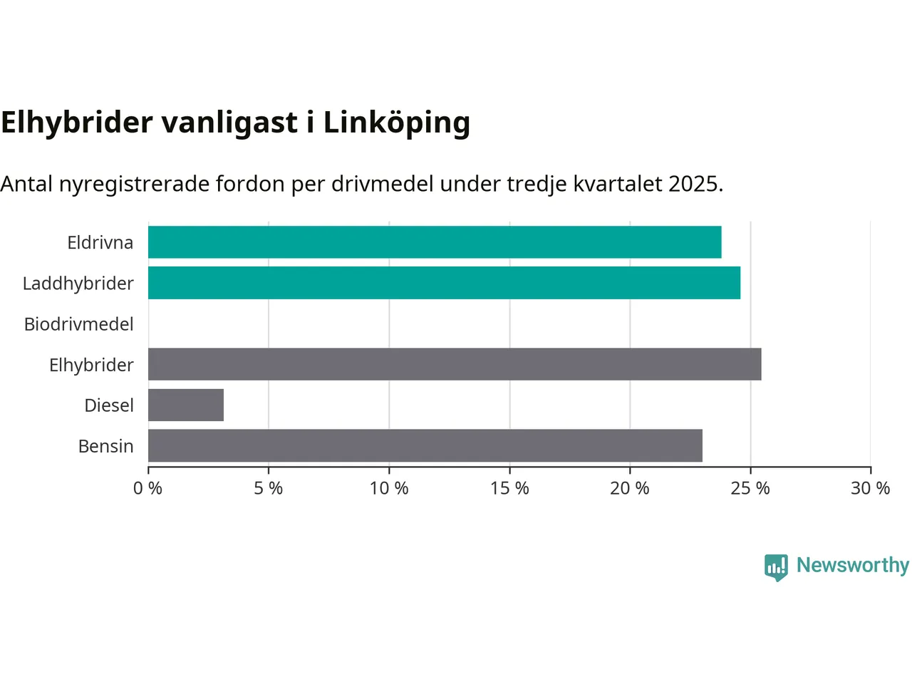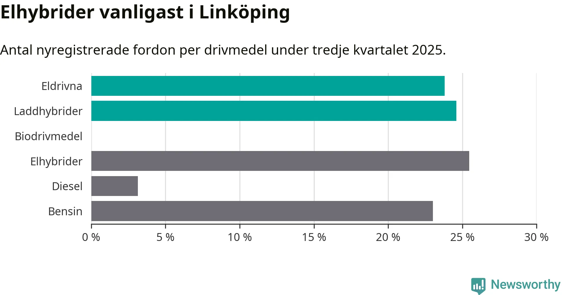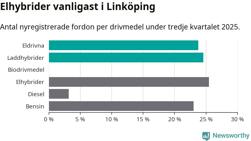 Under tredje kvartalet 2025 var 48 procent av alla nyregistrerade personbilar i Linköping laddbara (sammanlagt registrerades 1 143 nya bilar). Merparten av de laddbara bilarna var så kallade laddhybrider, det vill säga fordon som går att ladda och köra på el, men som även har en förbränningsmotor. 24 procent av alla nya bilar var rena elbilar.