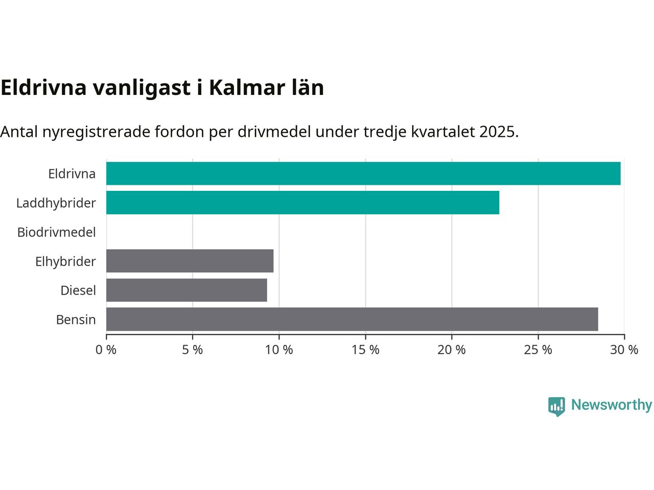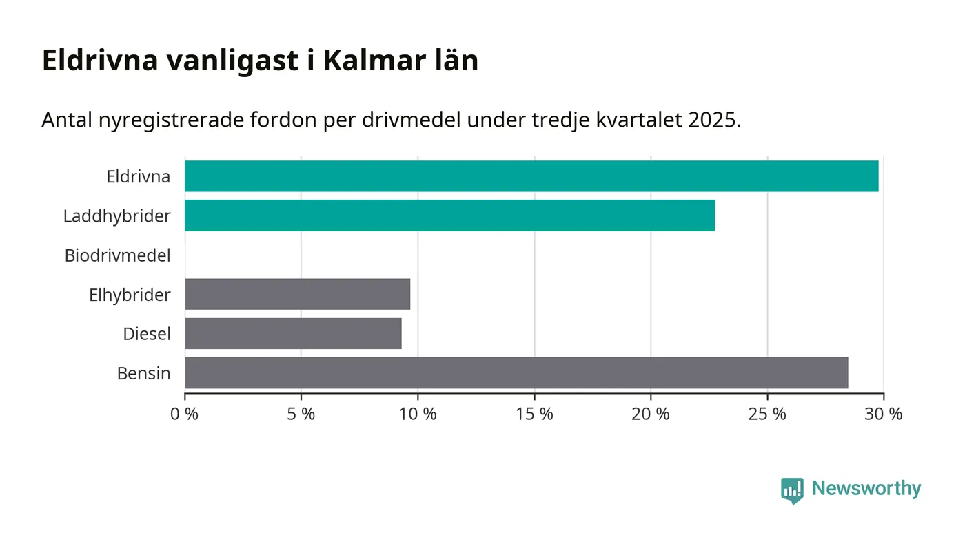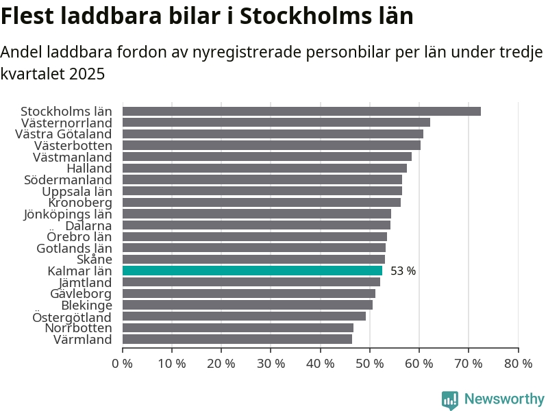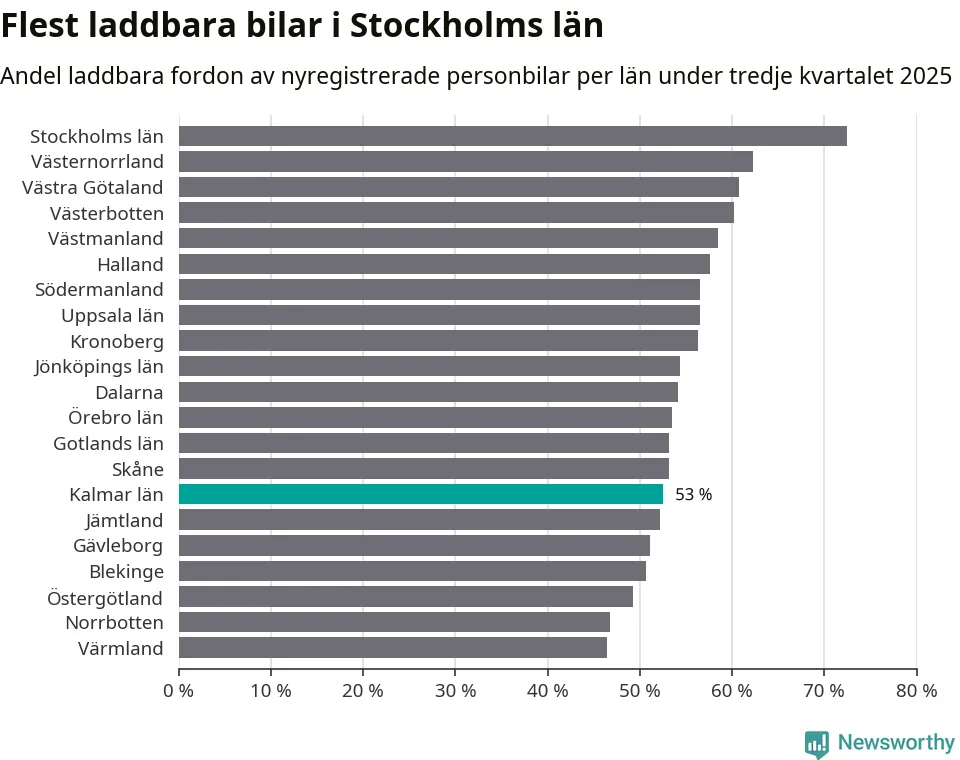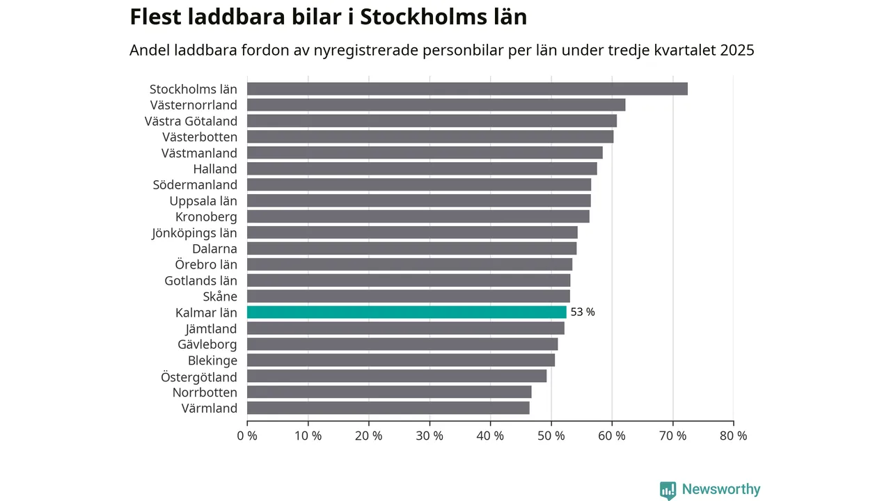Under tredje kvartalet 2025 var 53 procent av alla nyregistrerade personbilar i Kalmar län laddbara (sammanlagt registrerades 1 085 nya bilar). Merparten av de laddbara bilarna var rena elbilar (30 procent av alla).