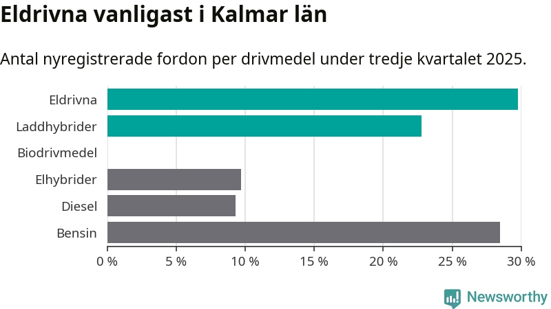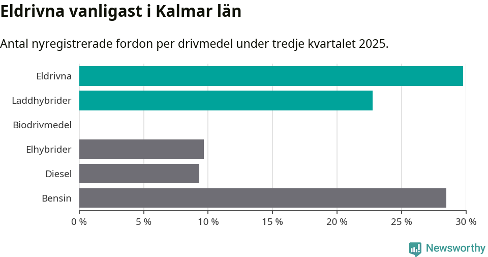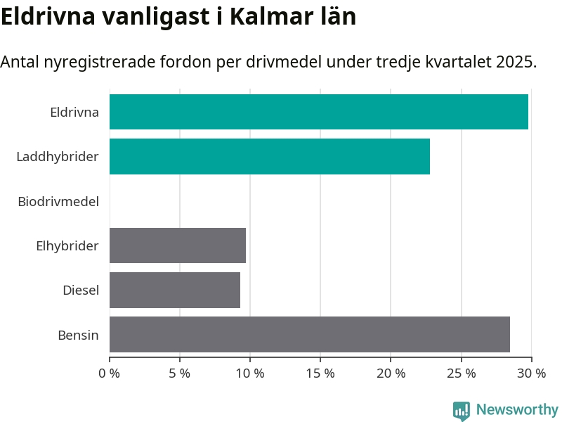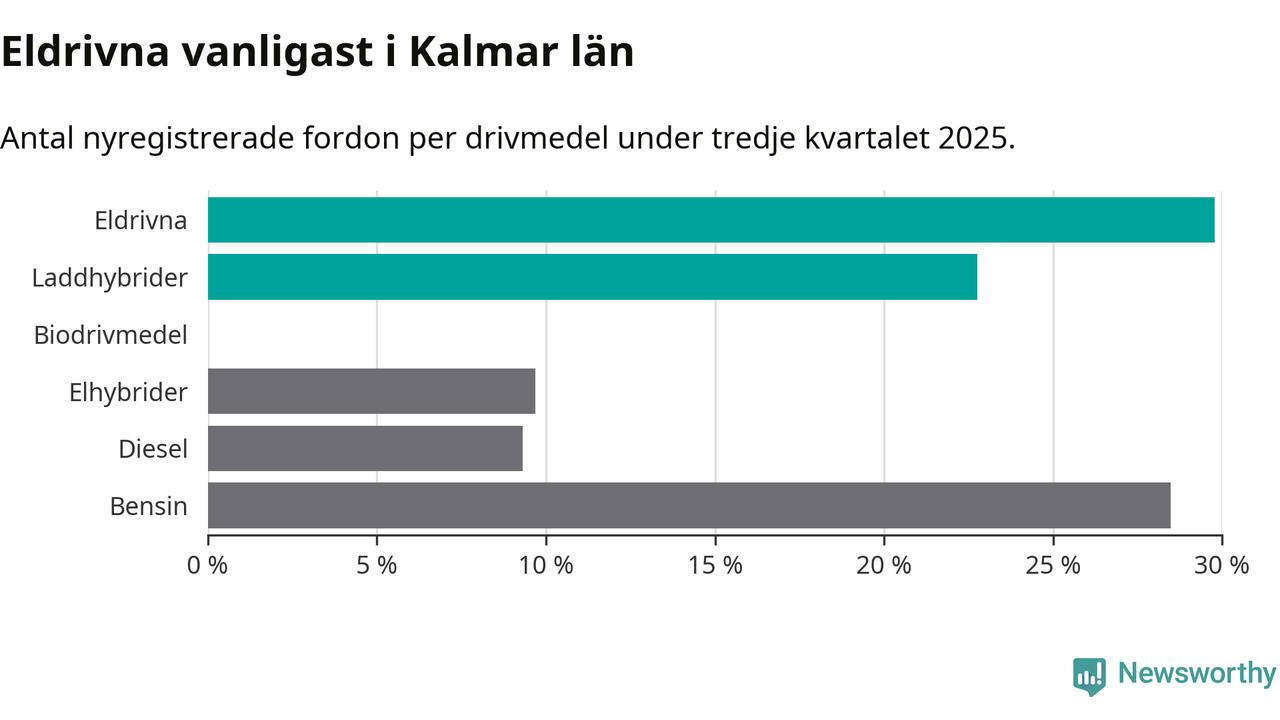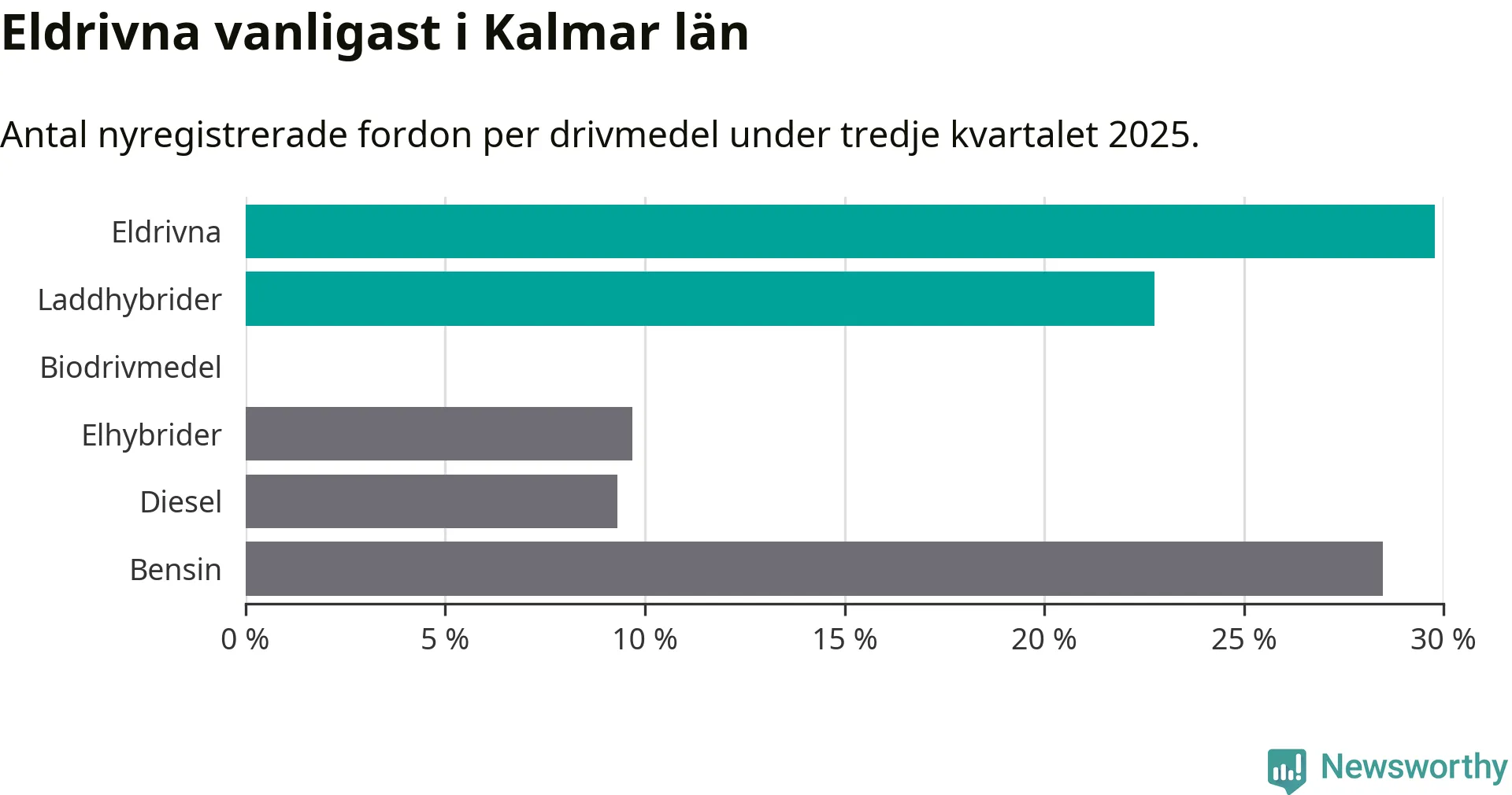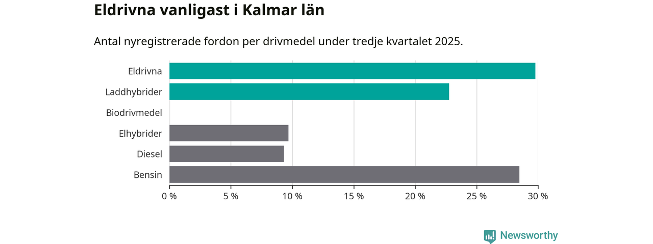 Under tredje kvartalet 2025 var 53 procent av alla nyregistrerade personbilar i Kalmar län laddbara (sammanlagt registrerades 1 085 nya bilar). Merparten av de laddbara bilarna var rena elbilar (30 procent av alla).