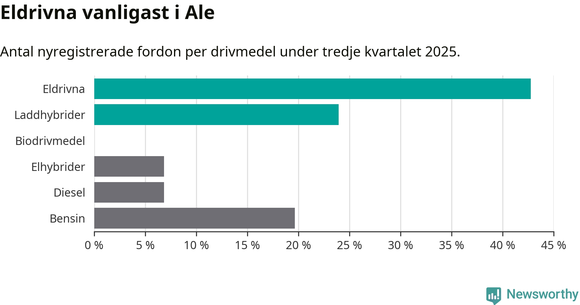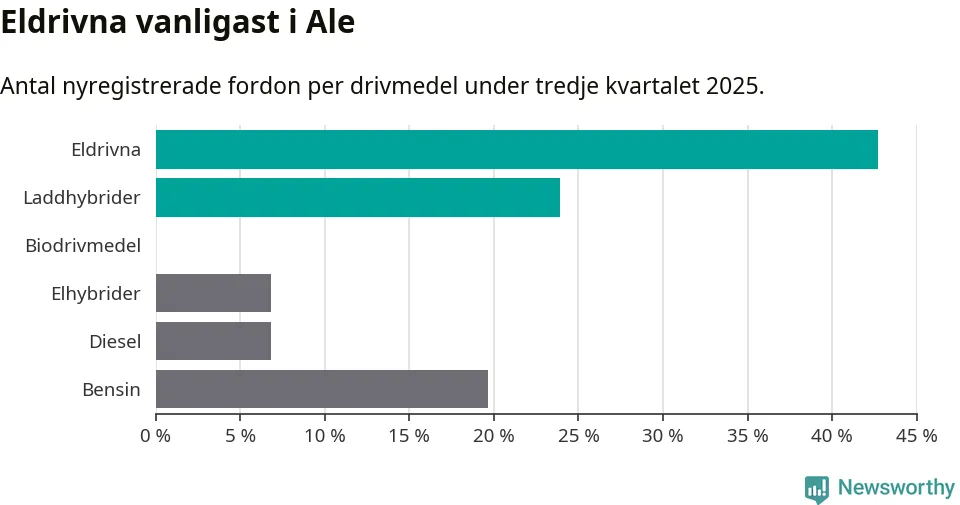 Under tredje kvartalet 2025 var 67 procent av alla nyregistrerade personbilar i Ale laddbara (sammanlagt registrerades 117 nya bilar). Merparten av de laddbara bilarna var rena elbilar (43 procent av alla).