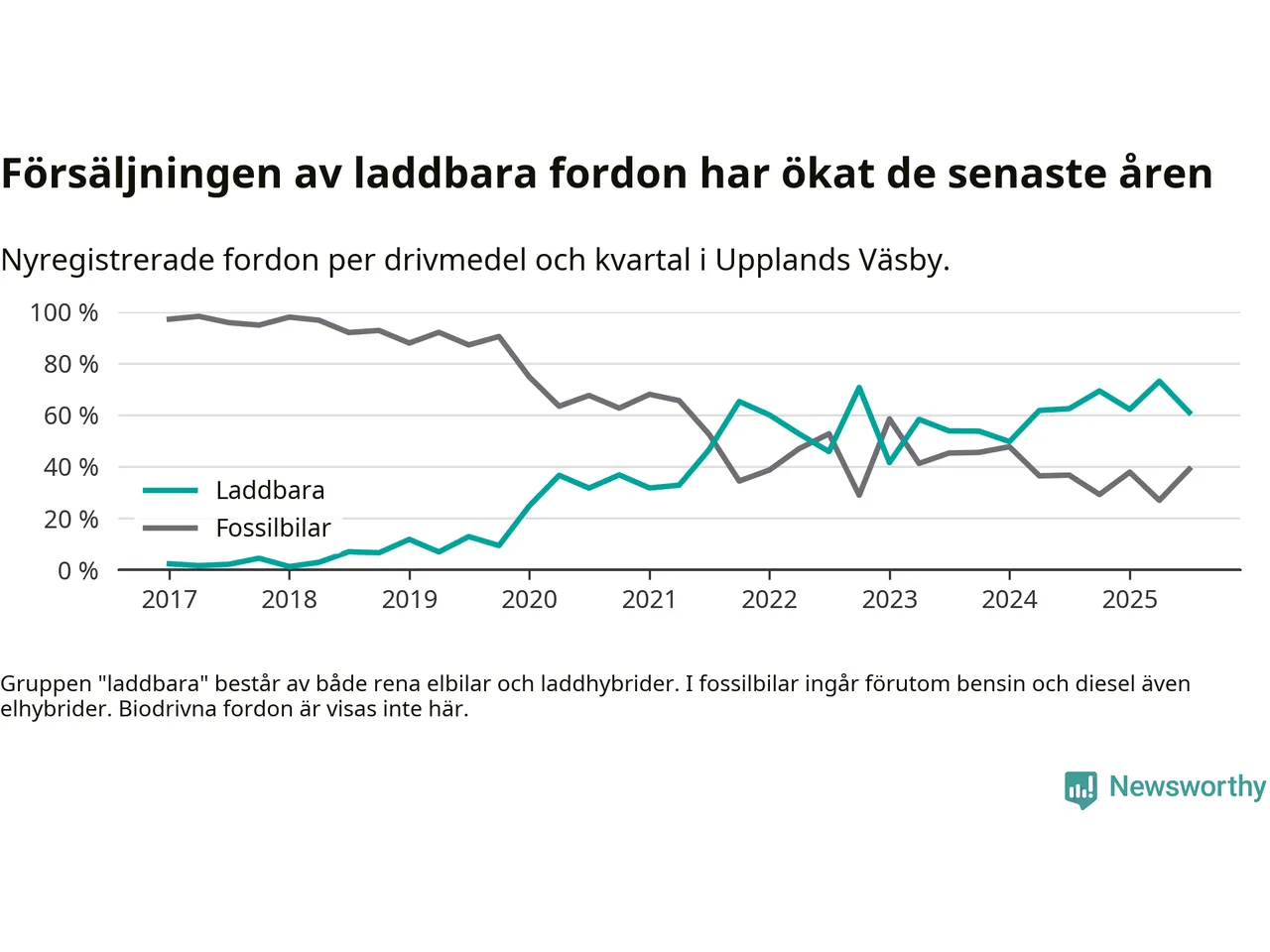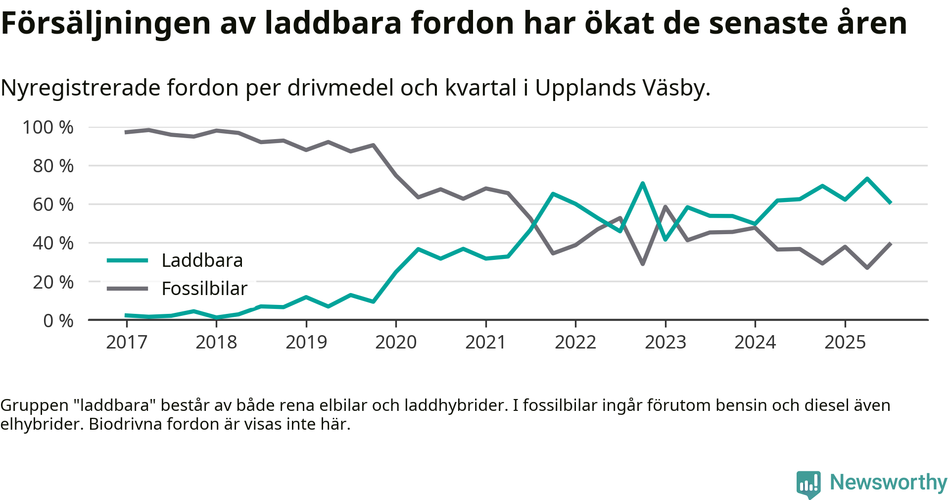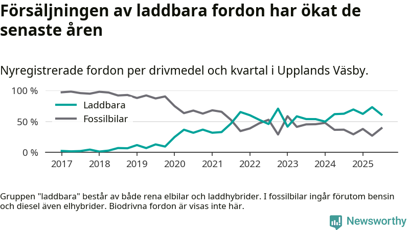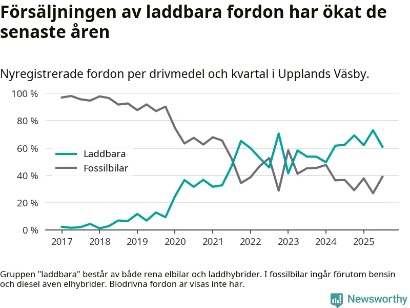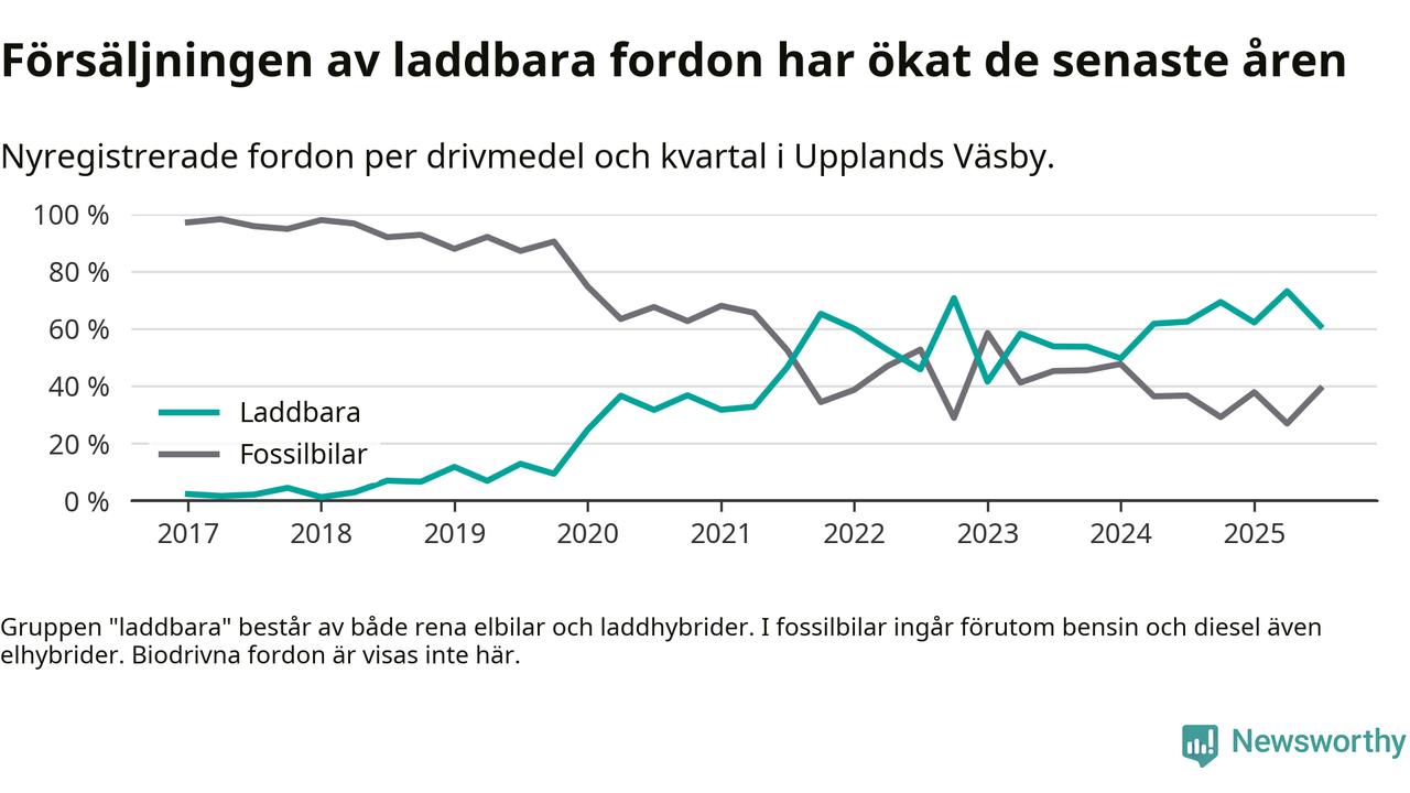 I Upplands Väsby minskade andelen laddbara bilar under tredje kvartalet jämfört med kvartalet innan. Nyregistreringen peakade under andra kvartalet 2025 då 73 procent av de nya bilarna var laddbara.