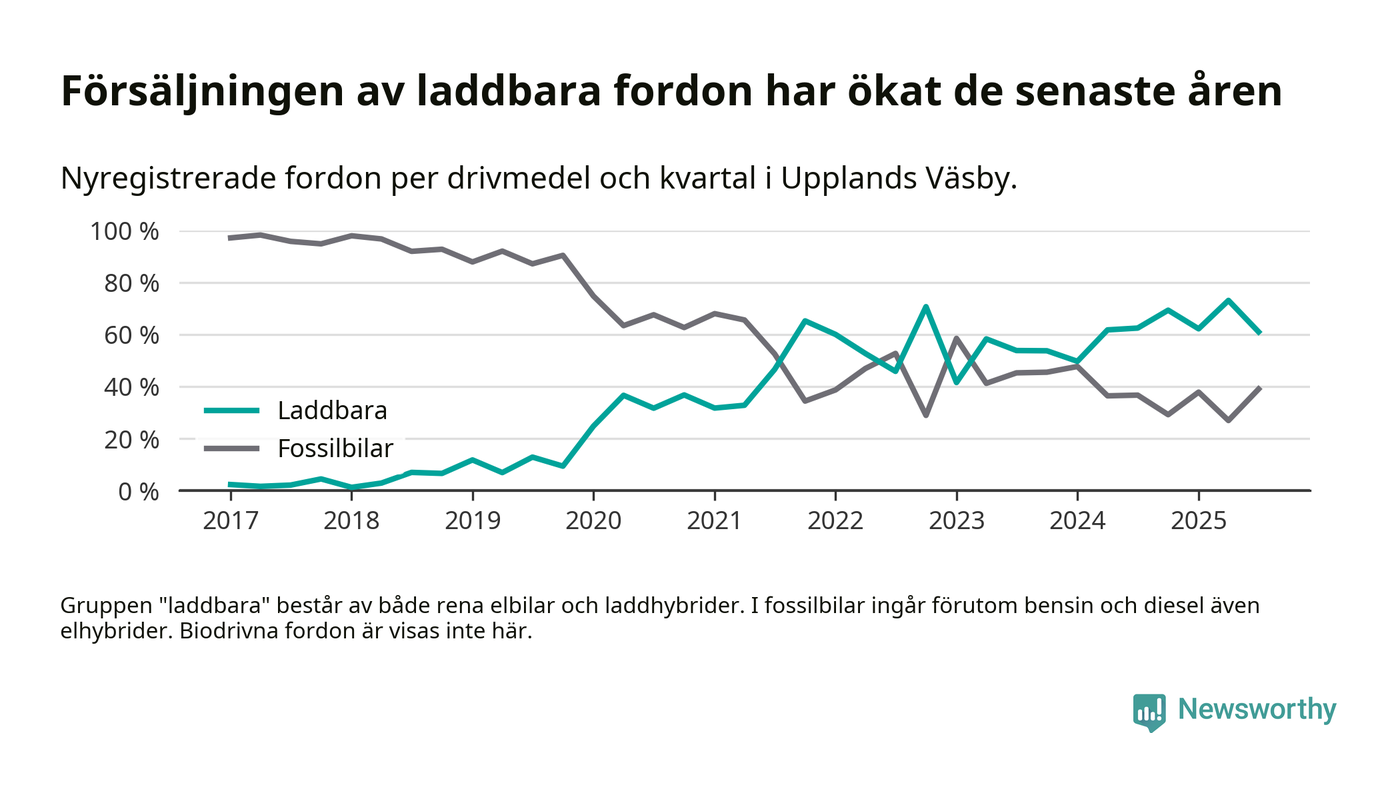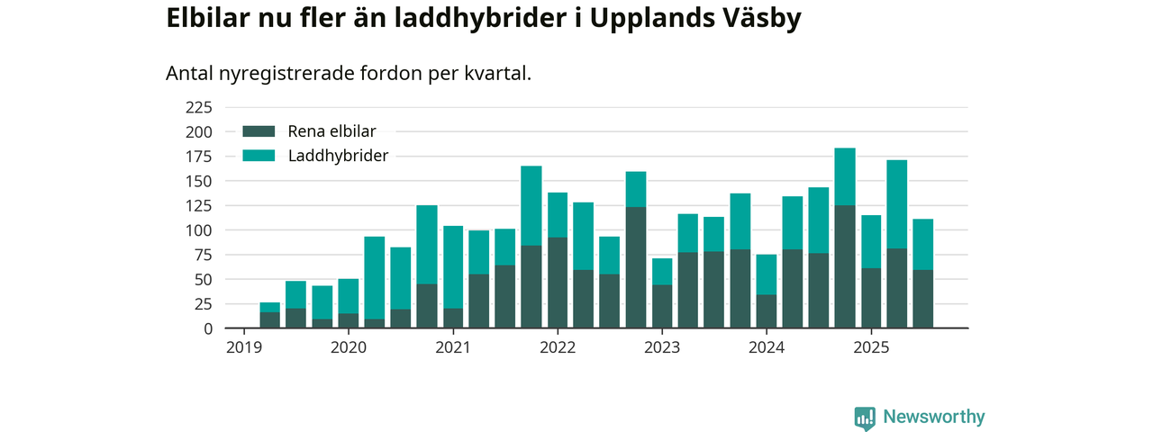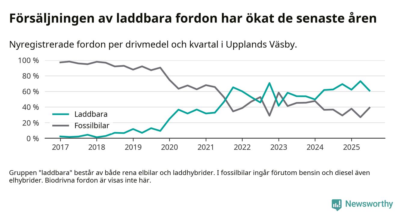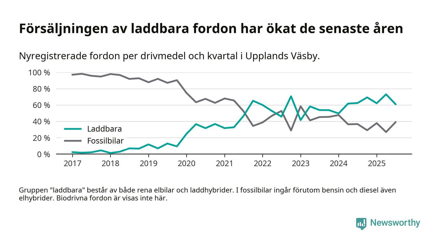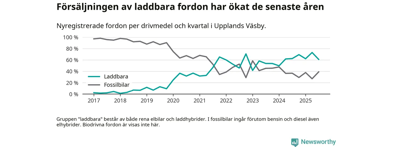 Under tredje kvartalet 2025 var 61 procent av alla nyregistrerade personbilar i Upplands Väsby laddbara (sammanlagt registrerades 182 nya bilar). Merparten av de laddbara bilarna var rena elbilar (32 procent av alla).