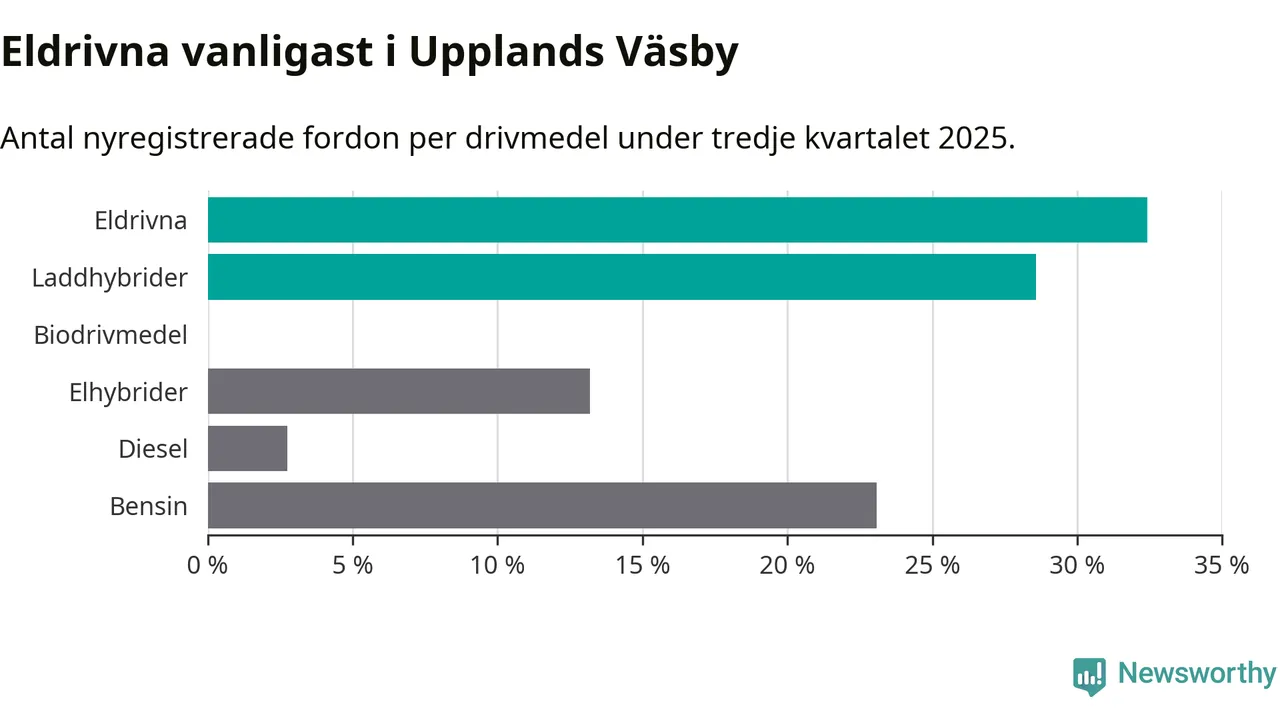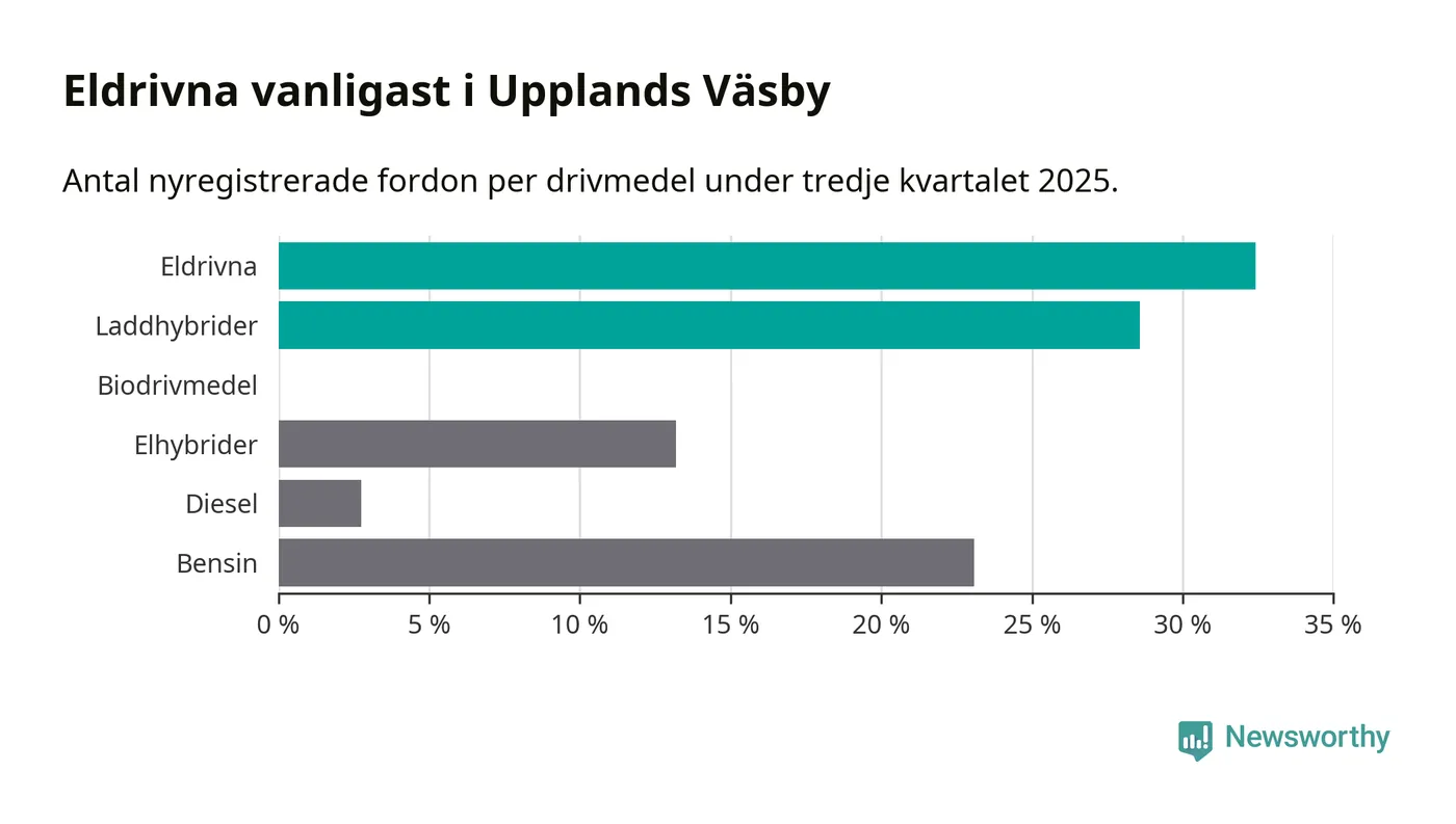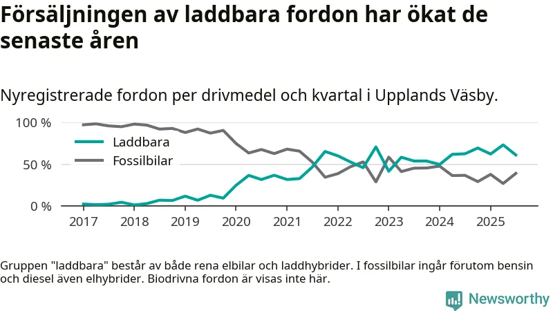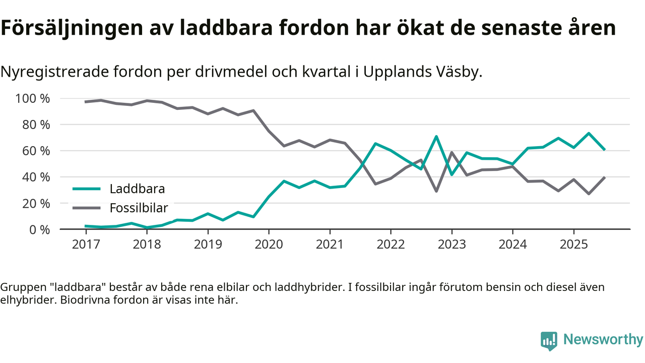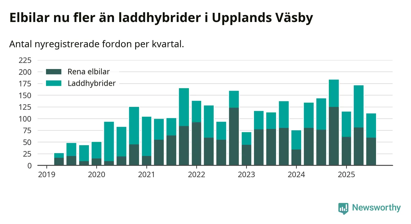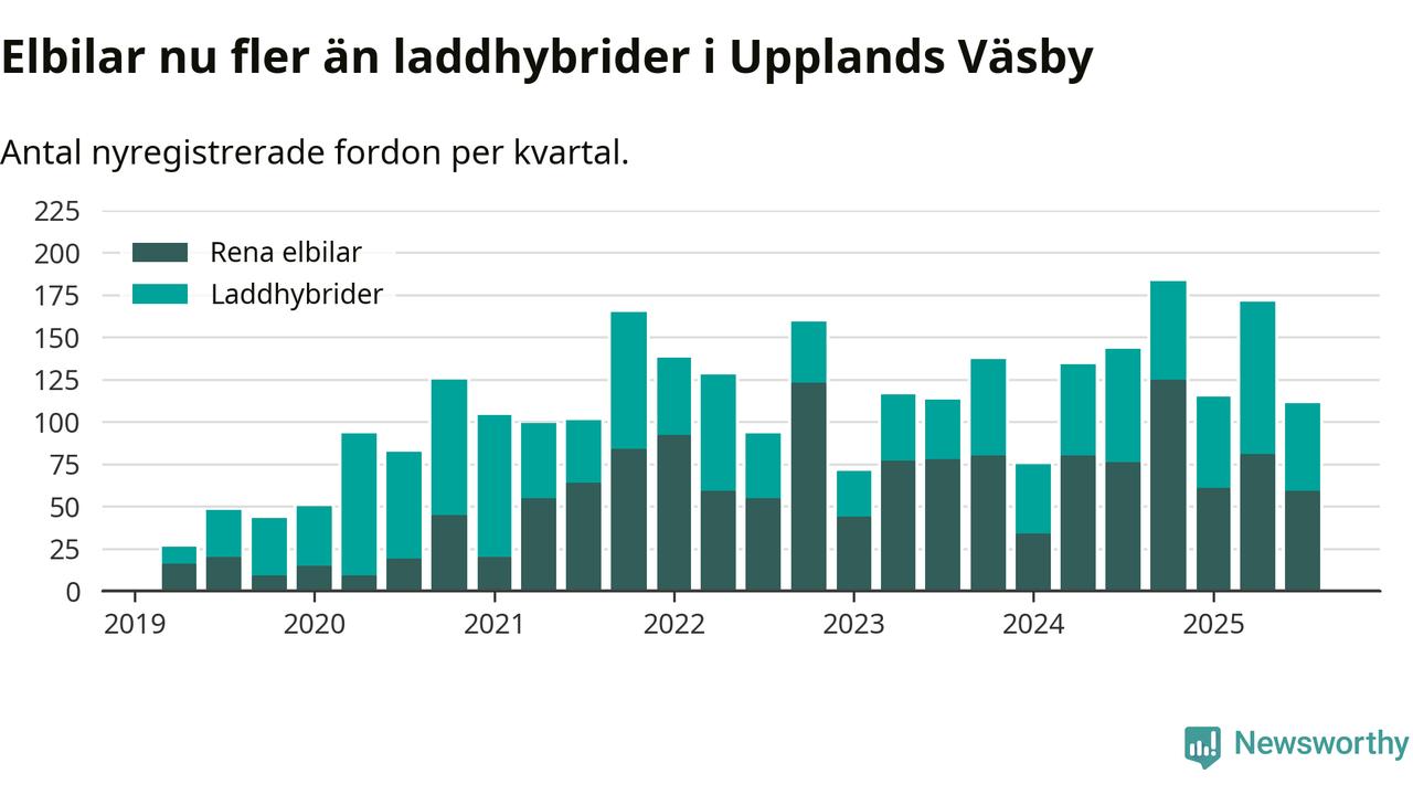 Under tredje kvartalet 2025 var 61 procent av alla nyregistrerade personbilar i Upplands Väsby laddbara (sammanlagt registrerades 182 nya bilar). Merparten av de laddbara bilarna var rena elbilar (32 procent av alla).