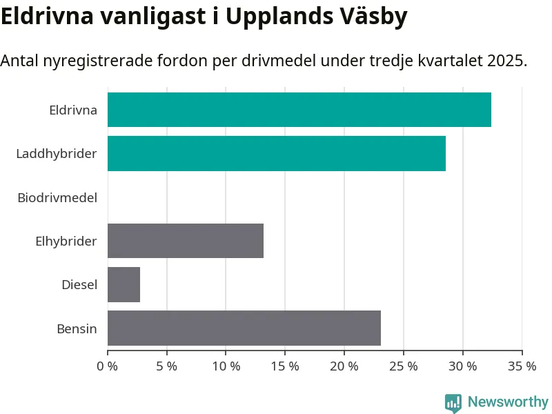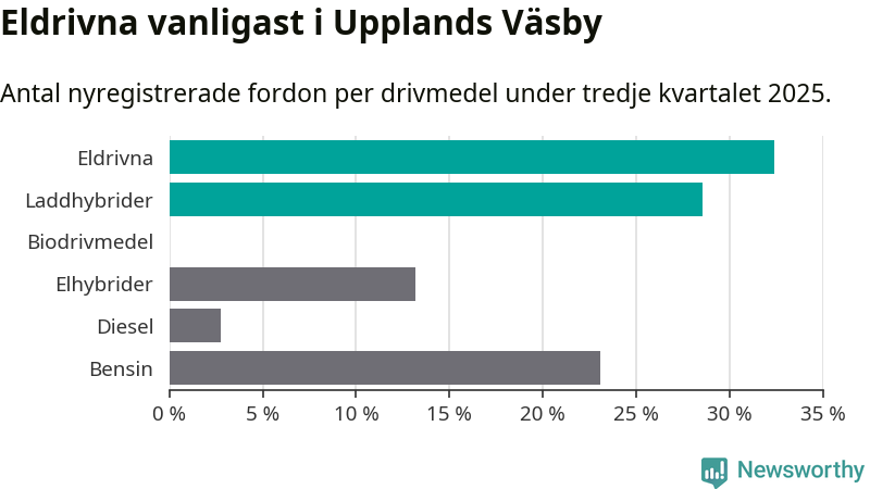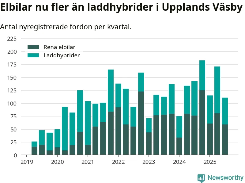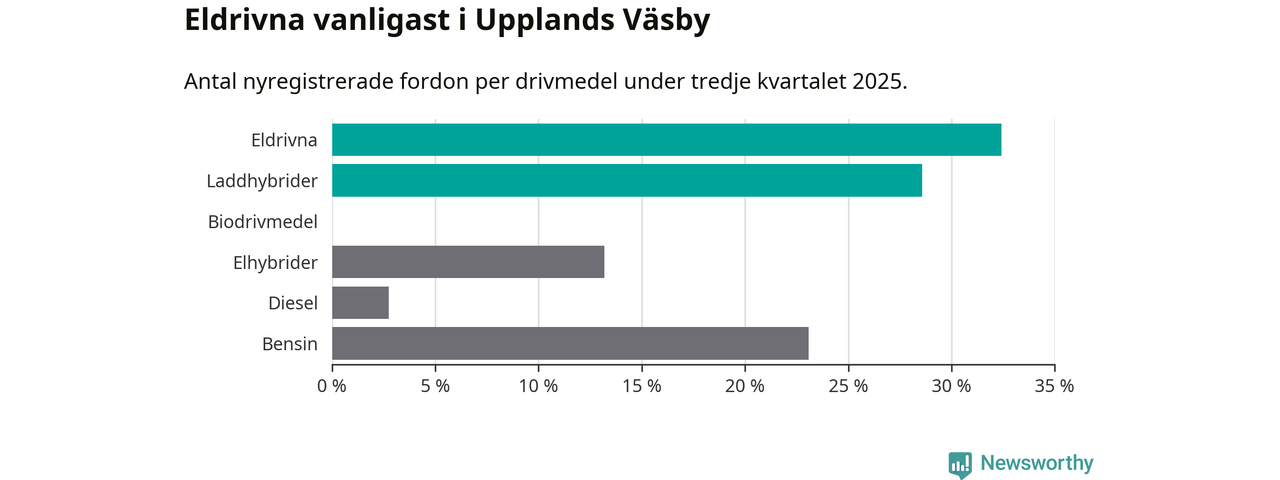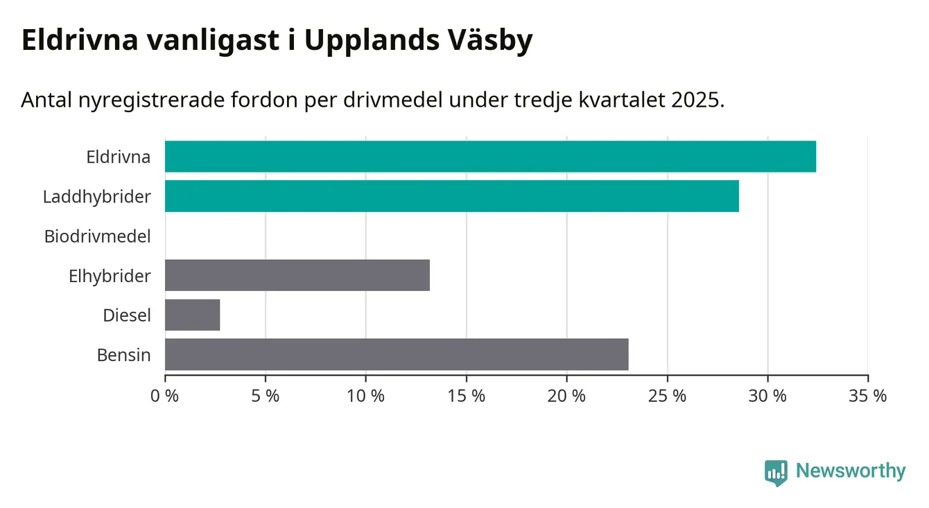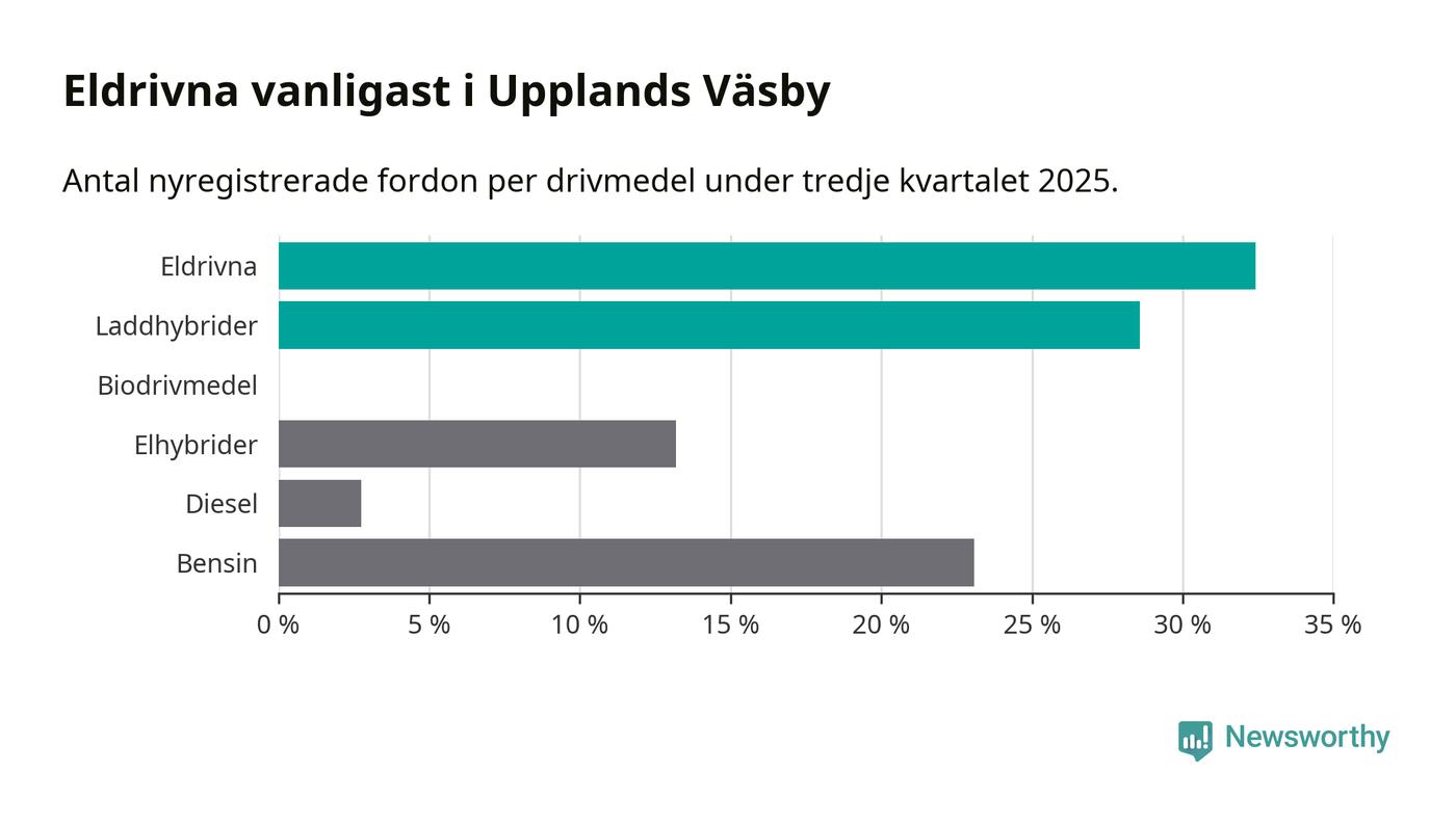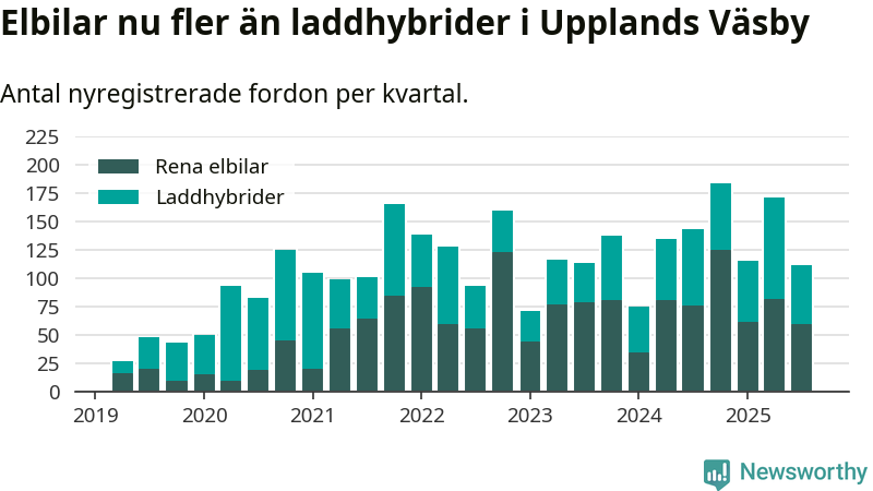 Under tredje kvartalet 2025 var 61 procent av alla nyregistrerade personbilar i Upplands Väsby laddbara (sammanlagt registrerades 182 nya bilar). Merparten av de laddbara bilarna var rena elbilar (32 procent av alla).