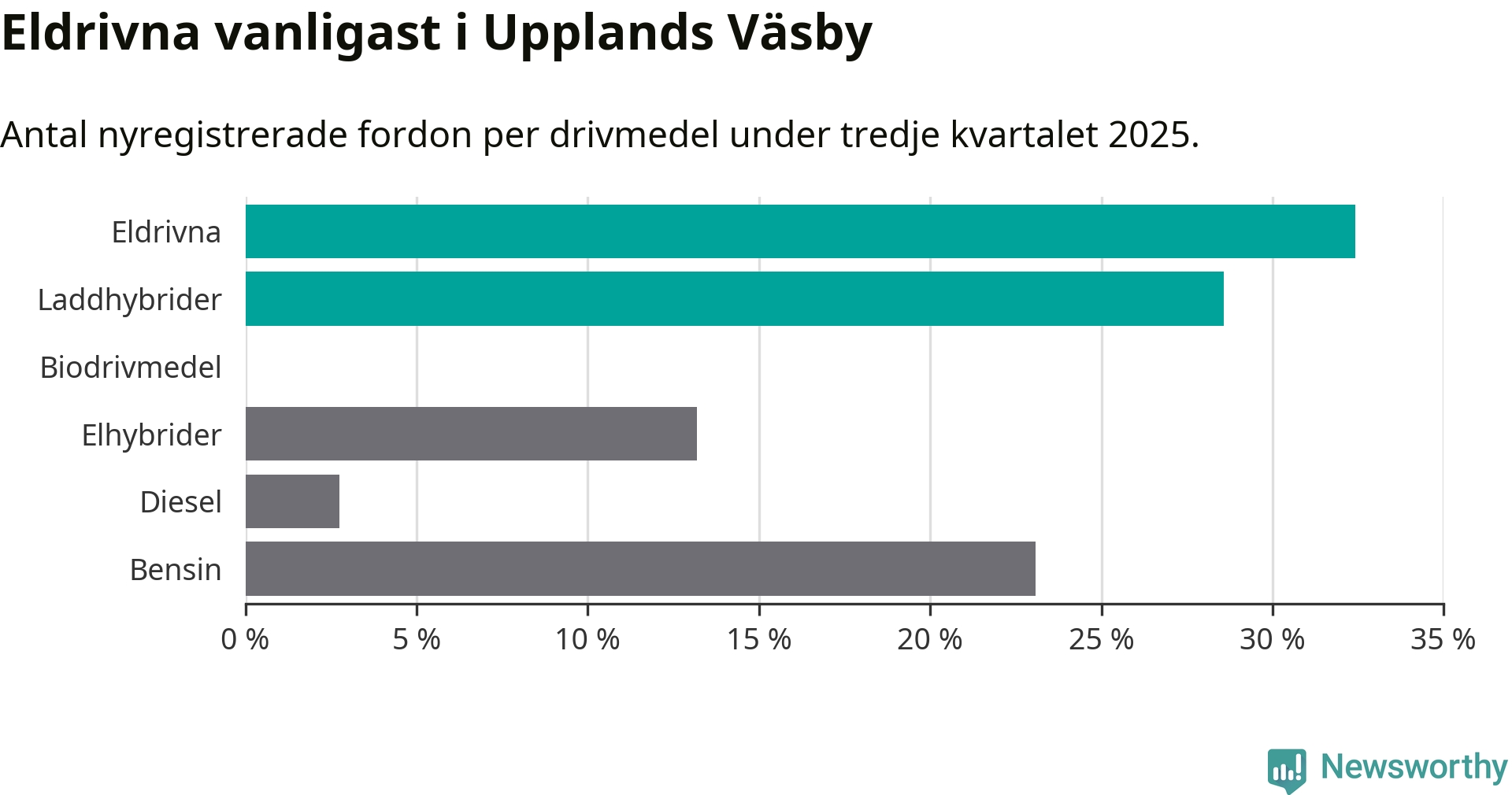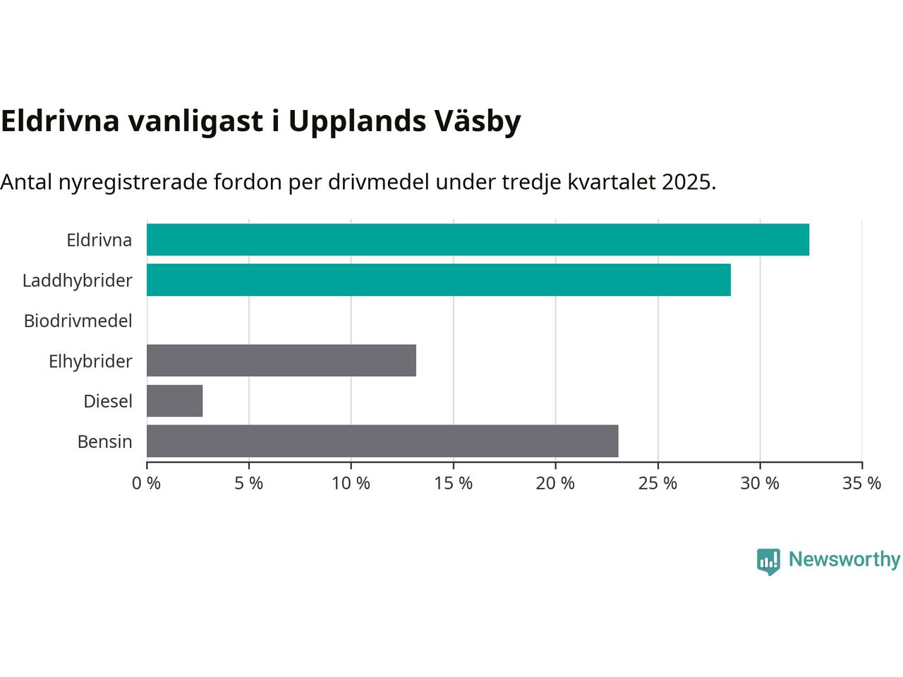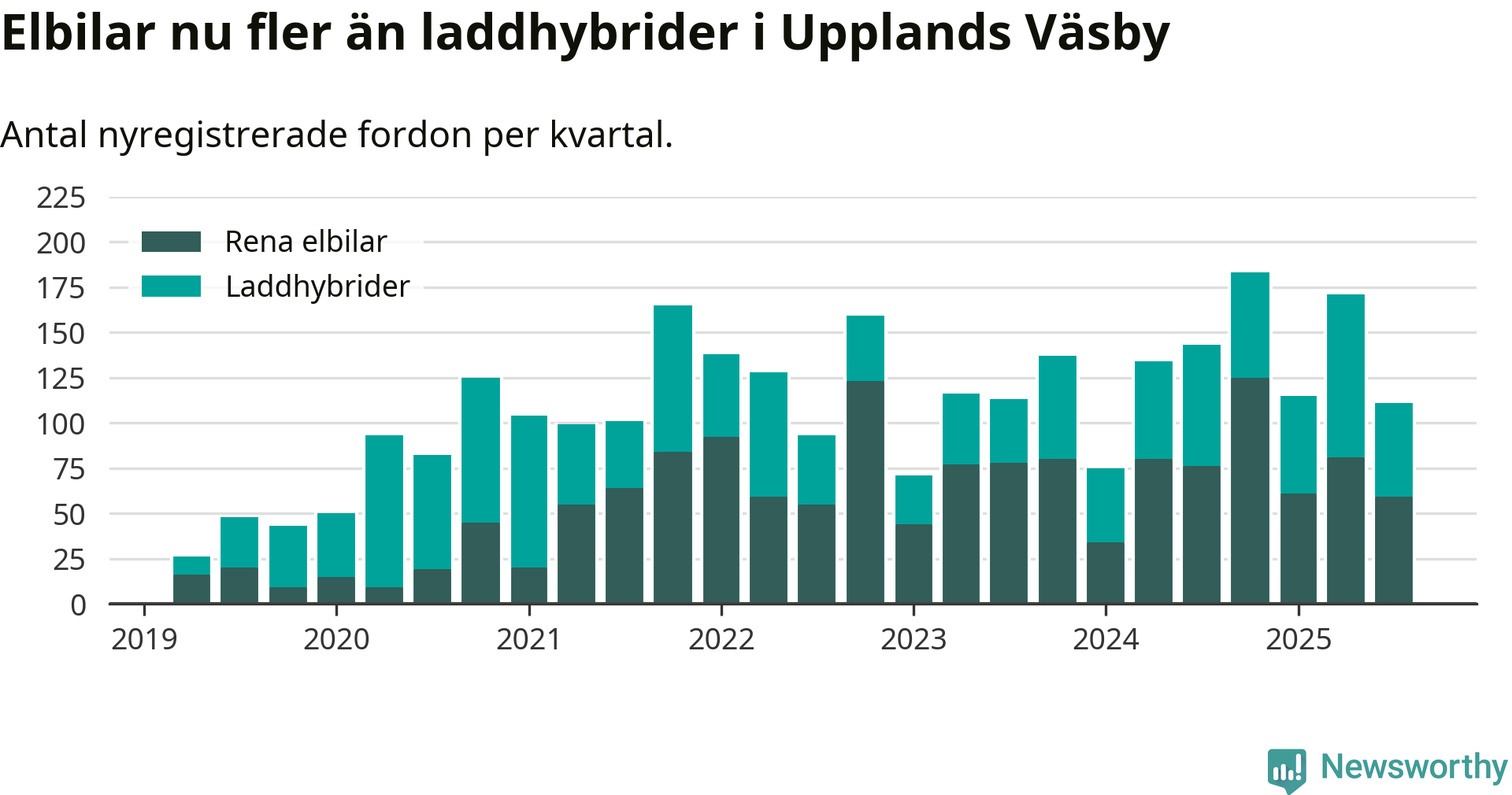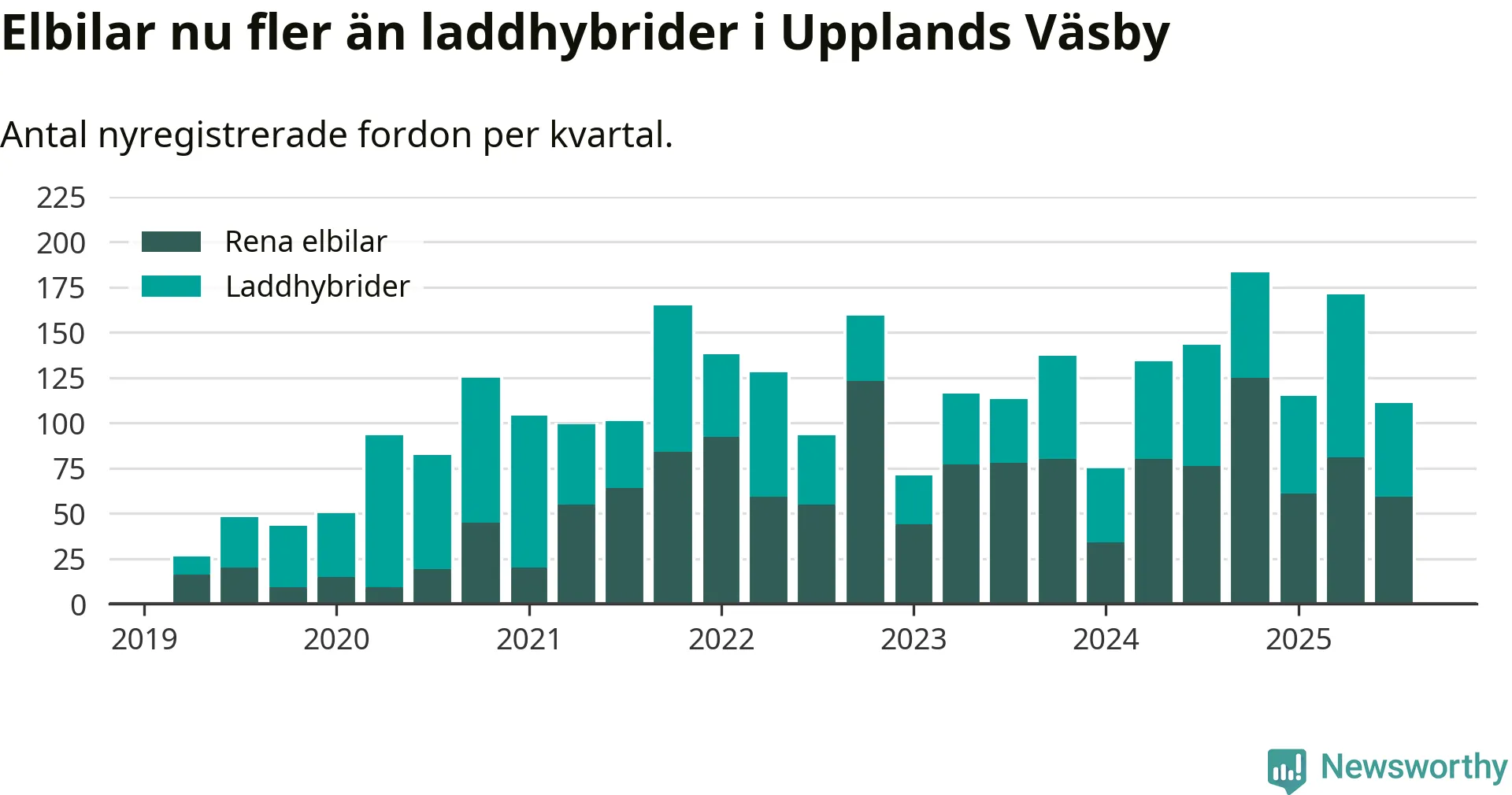 Under tredje kvartalet 2025 var 61 procent av alla nyregistrerade personbilar i Upplands Väsby laddbara (sammanlagt registrerades 182 nya bilar). Merparten av de laddbara bilarna var rena elbilar (32 procent av alla).