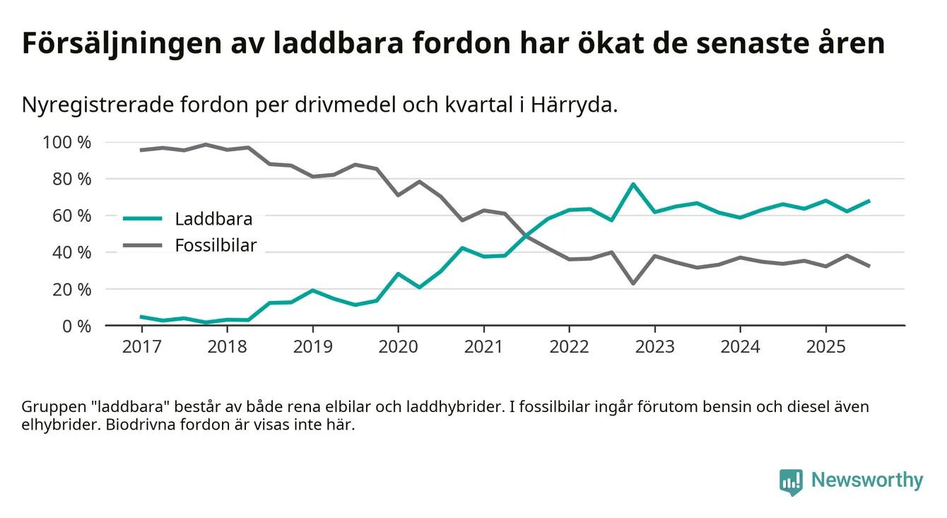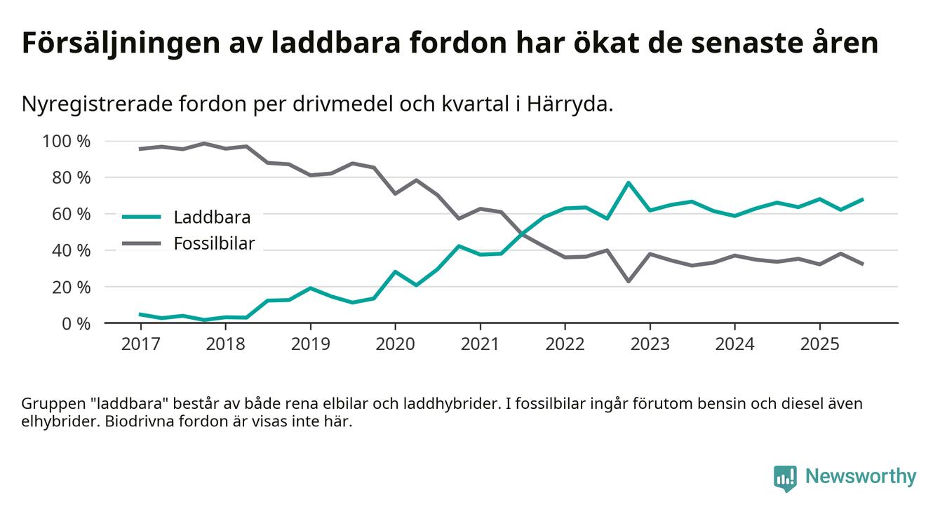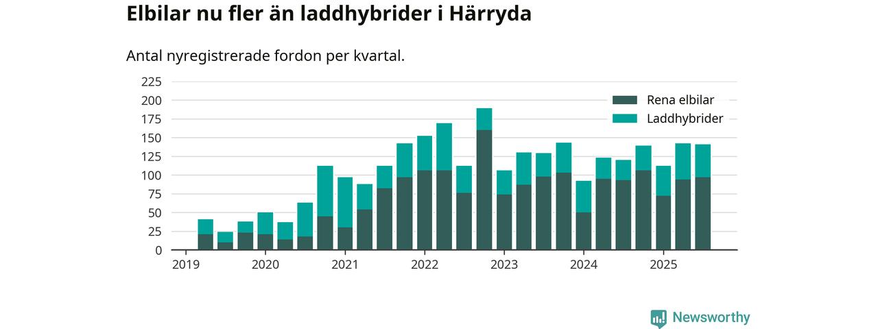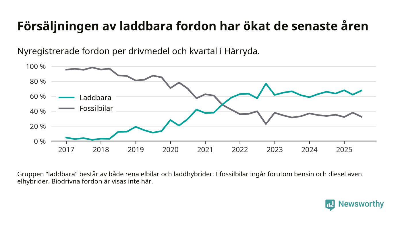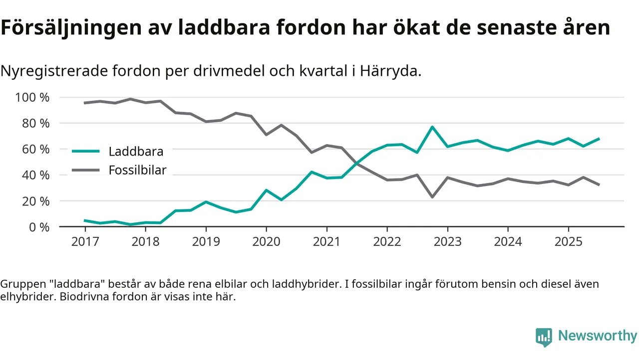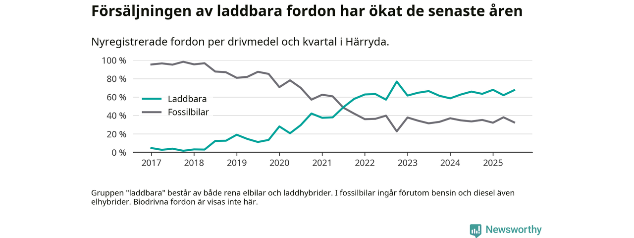 Under tredje kvartalet 2025 var 67 procent av alla nyregistrerade personbilar i Härryda laddbara (sammanlagt registrerades 209 nya bilar). Merparten av de laddbara bilarna var rena elbilar (46 procent av alla).