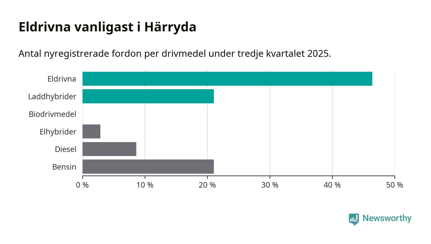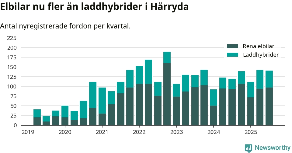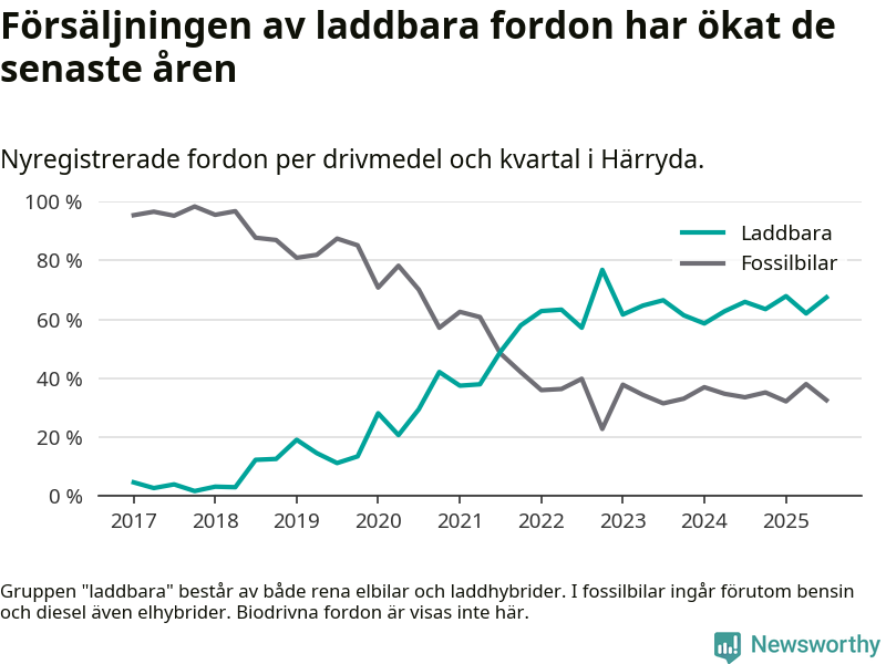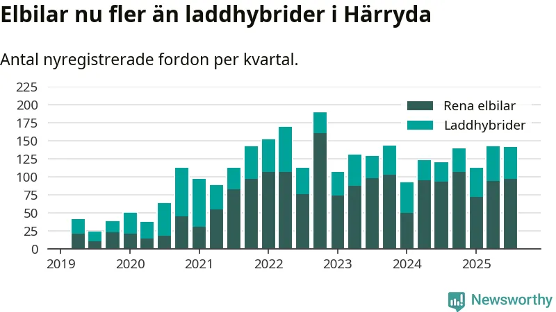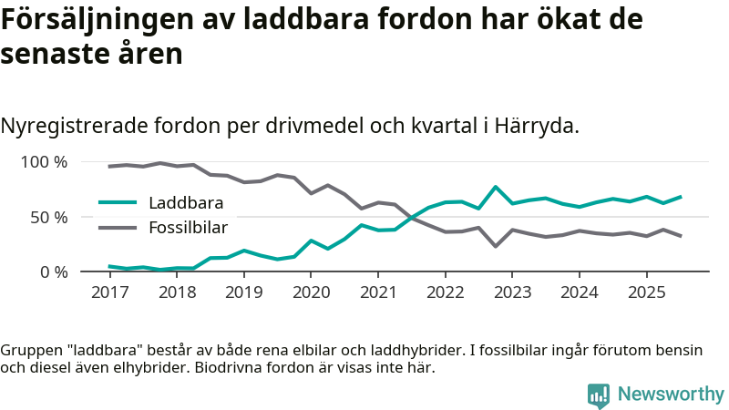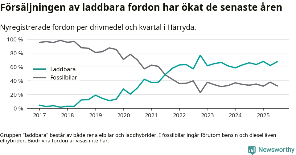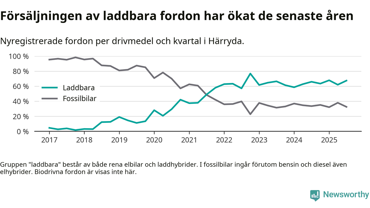 Under tredje kvartalet 2025 var 67 procent av alla nyregistrerade personbilar i Härryda laddbara (sammanlagt registrerades 209 nya bilar). Merparten av de laddbara bilarna var rena elbilar (46 procent av alla).