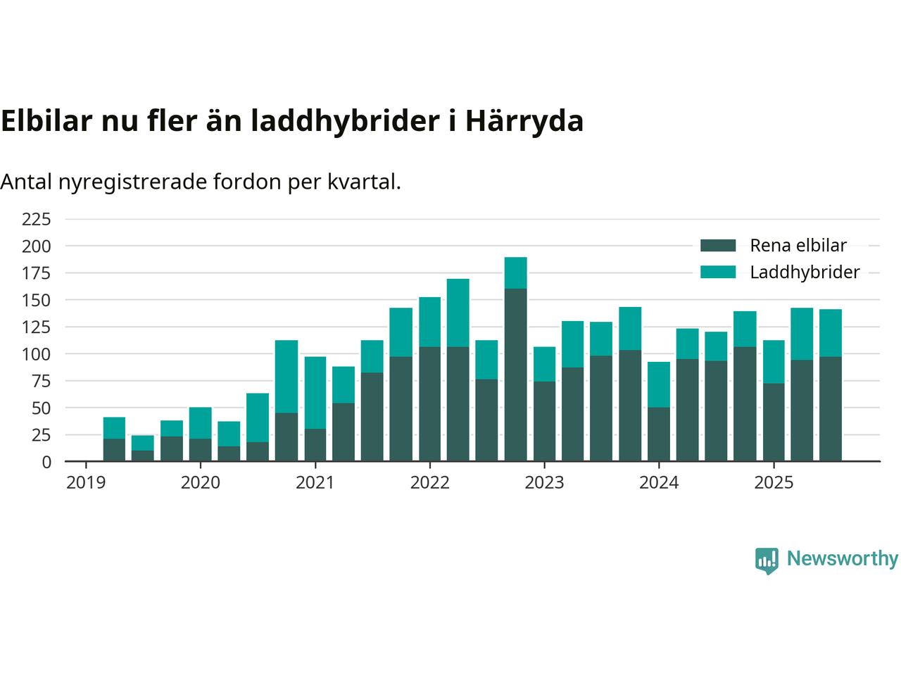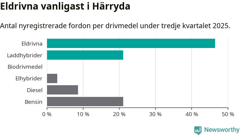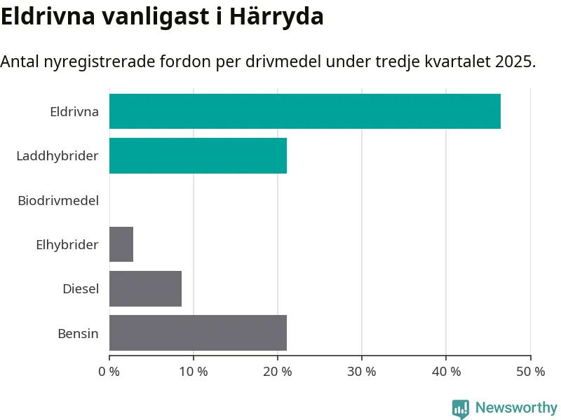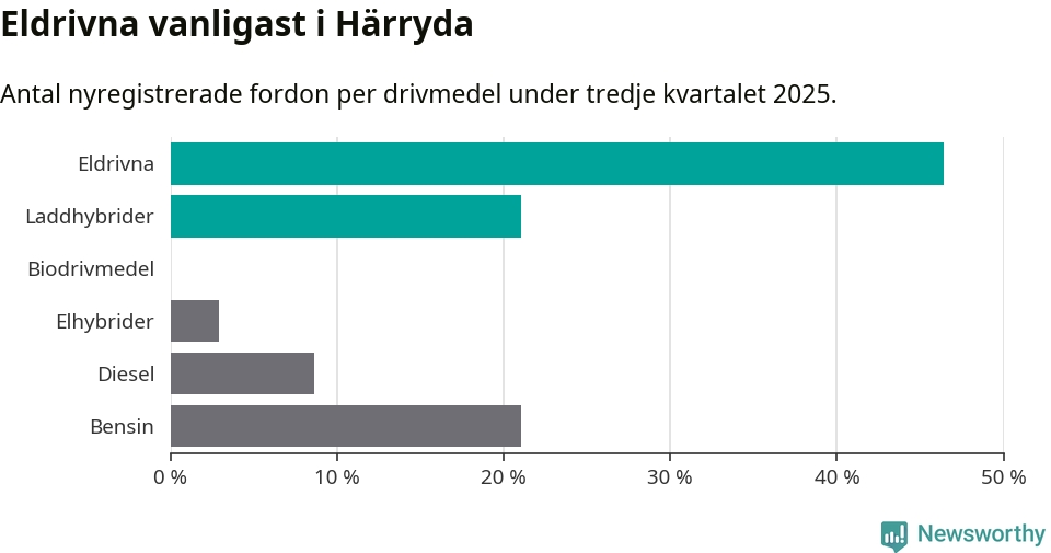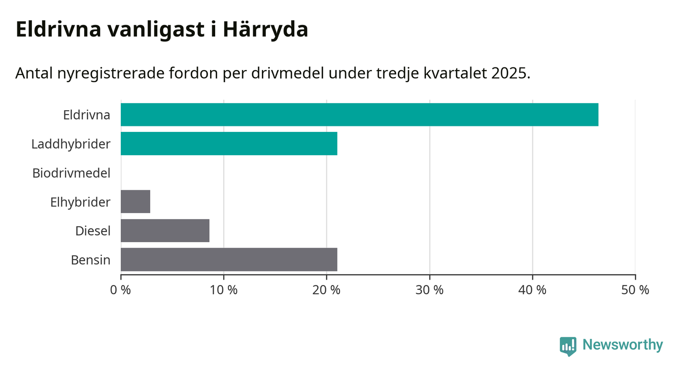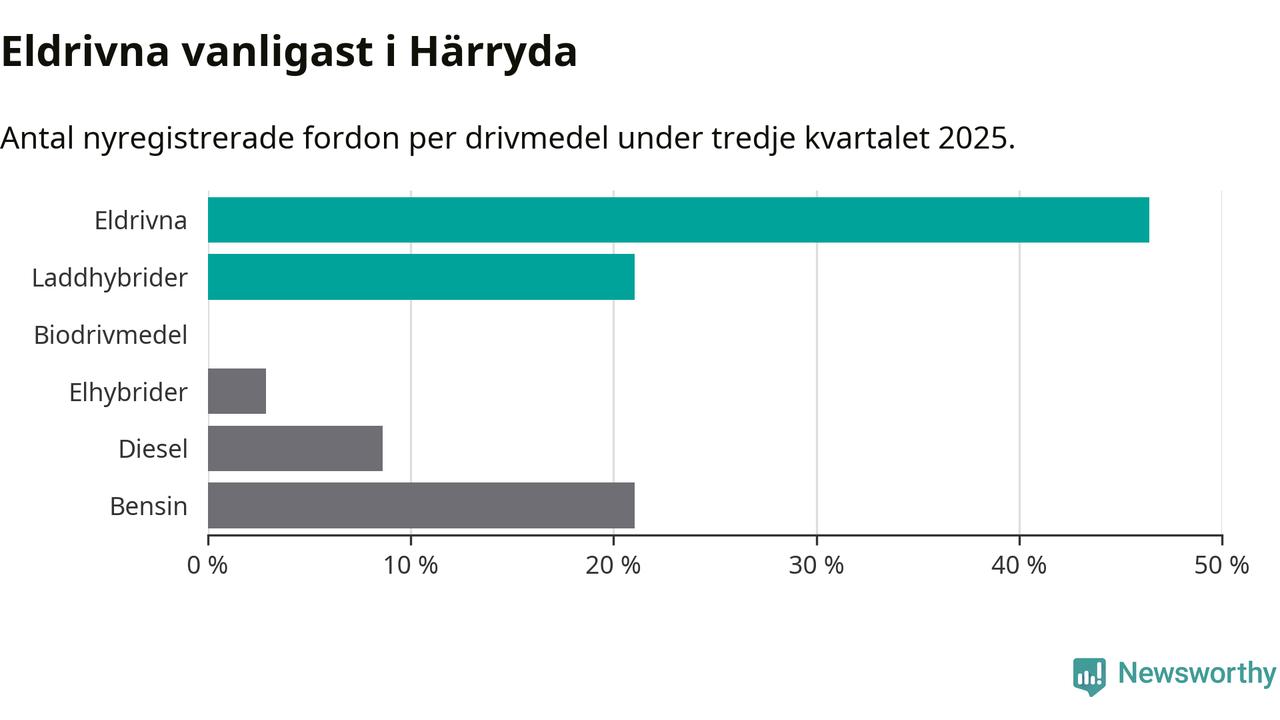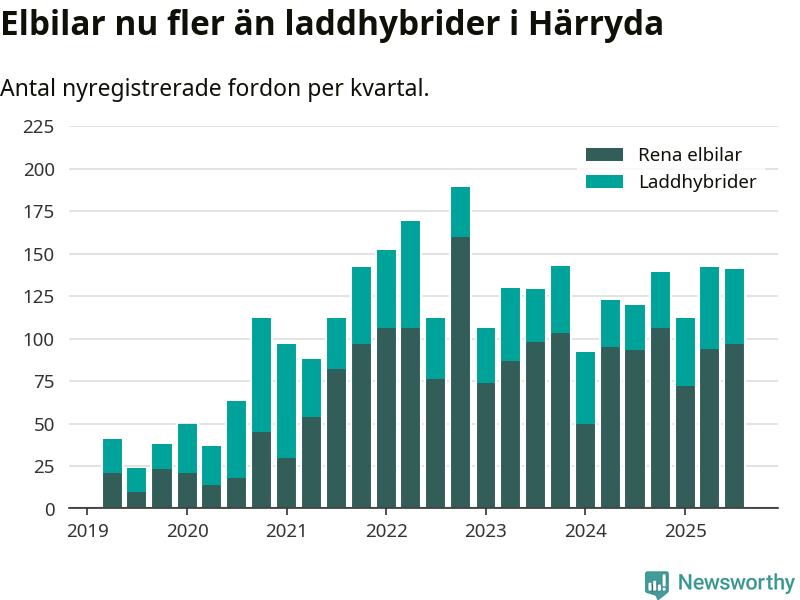 Under tredje kvartalet 2025 var 67 procent av alla nyregistrerade personbilar i Härryda laddbara (sammanlagt registrerades 209 nya bilar). Merparten av de laddbara bilarna var rena elbilar (46 procent av alla).