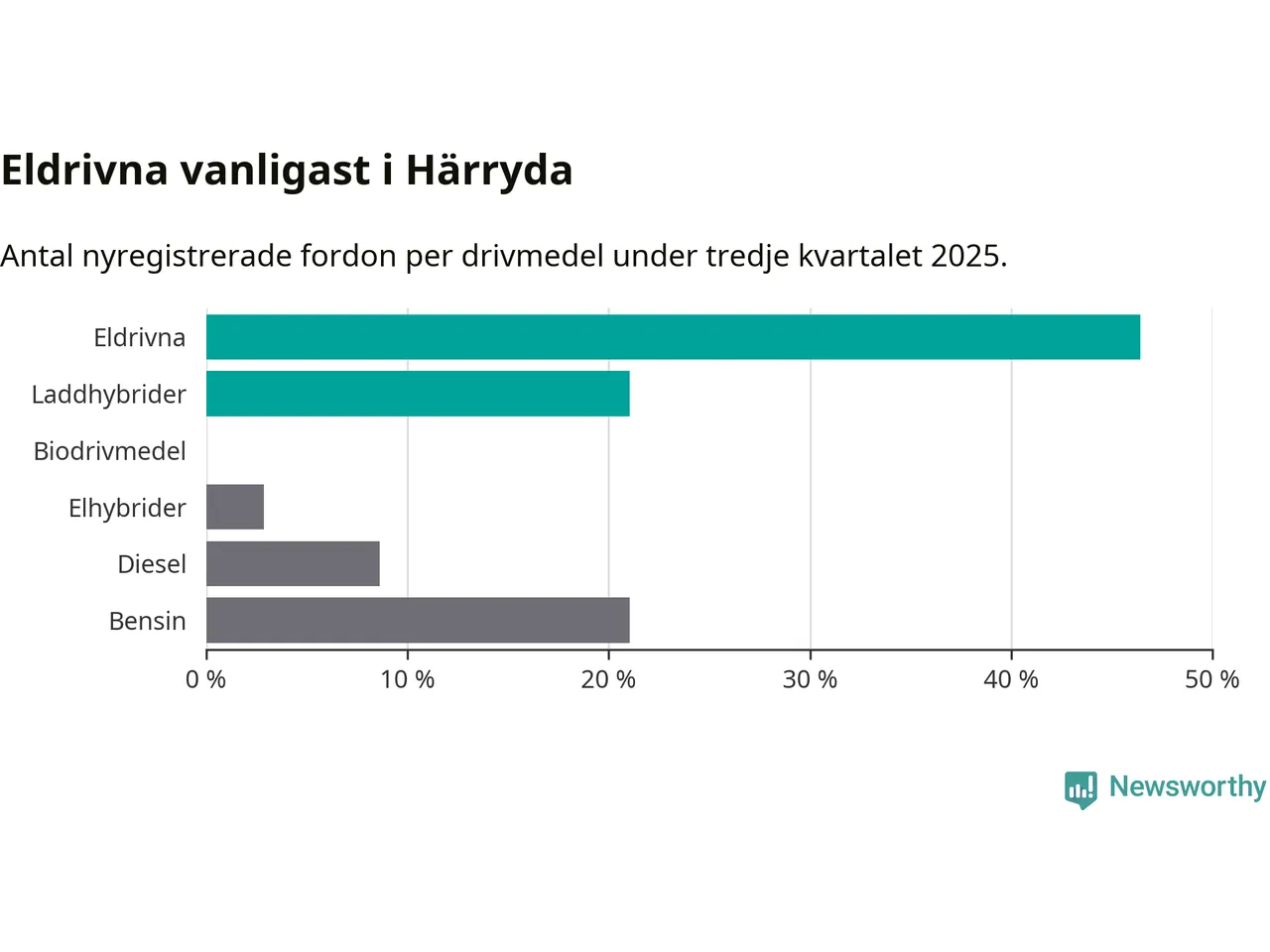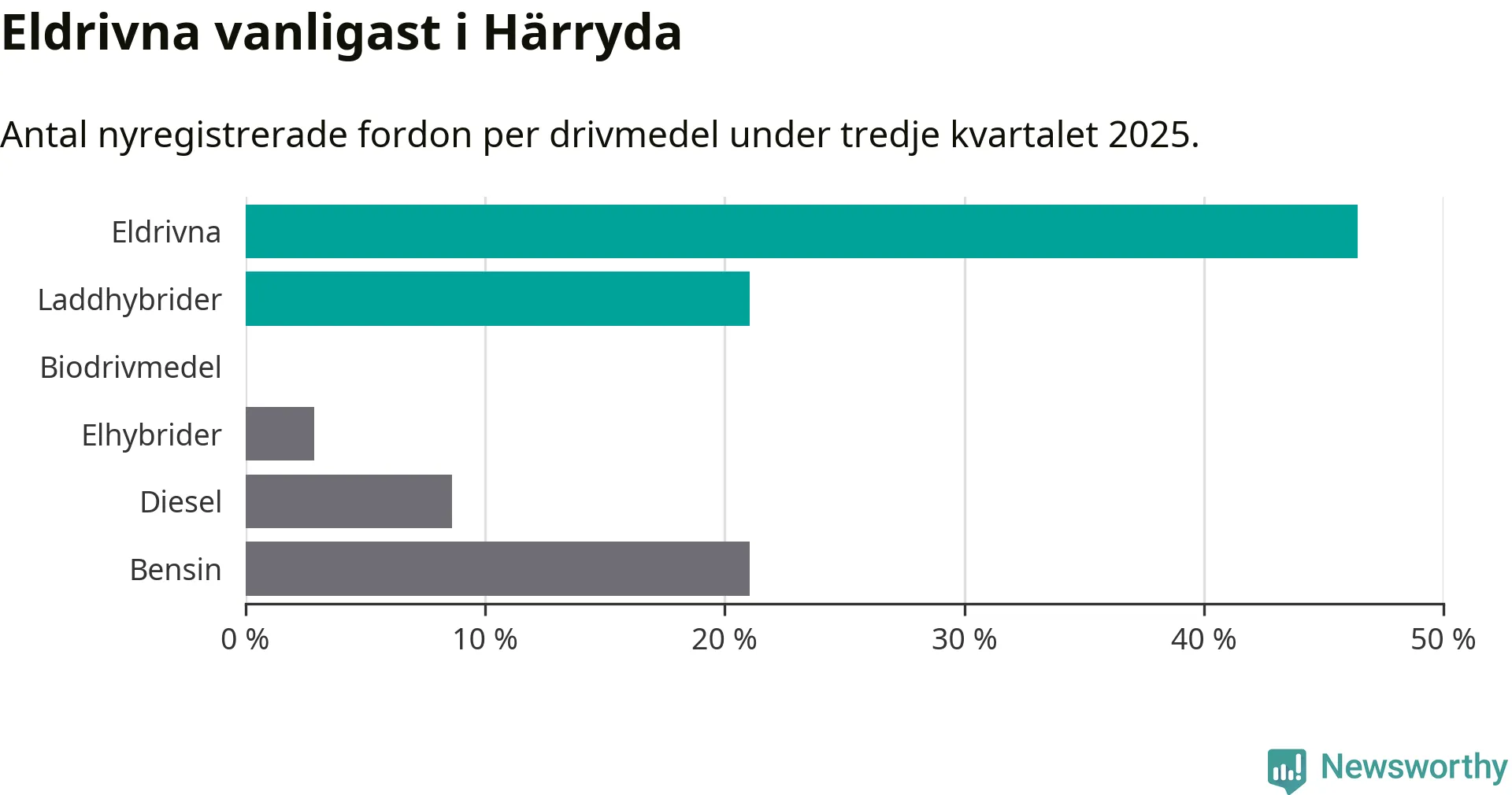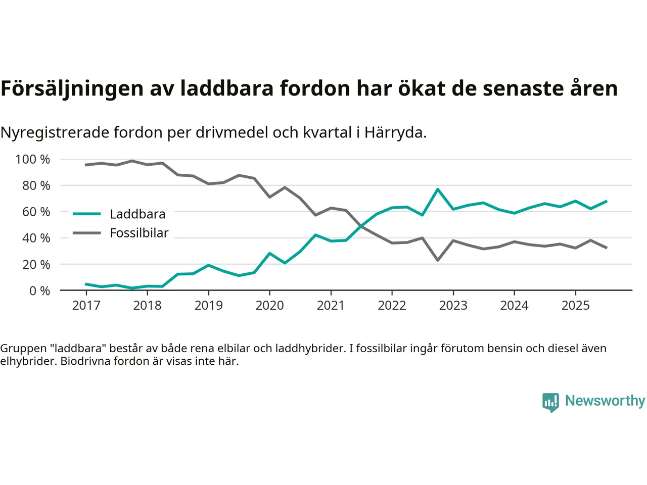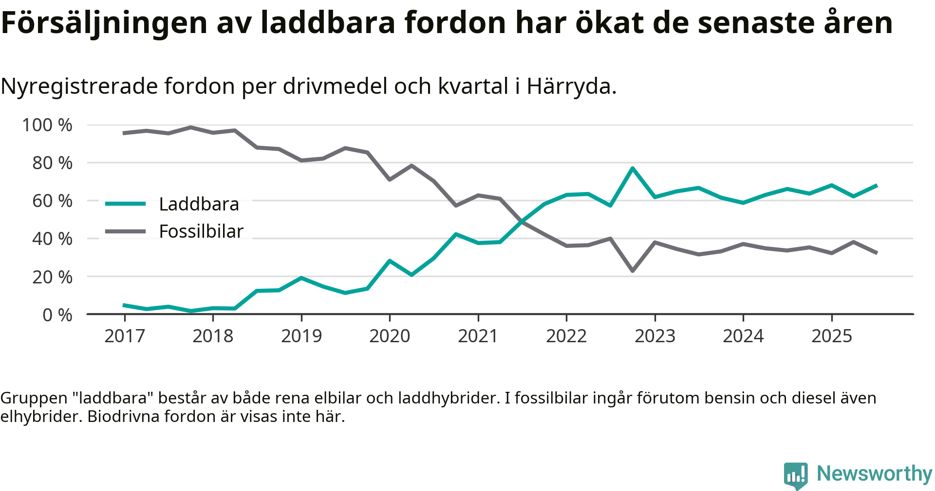 Under tredje kvartalet 2025 var 67 procent av alla nyregistrerade personbilar i Härryda laddbara (sammanlagt registrerades 209 nya bilar). Merparten av de laddbara bilarna var rena elbilar (46 procent av alla).