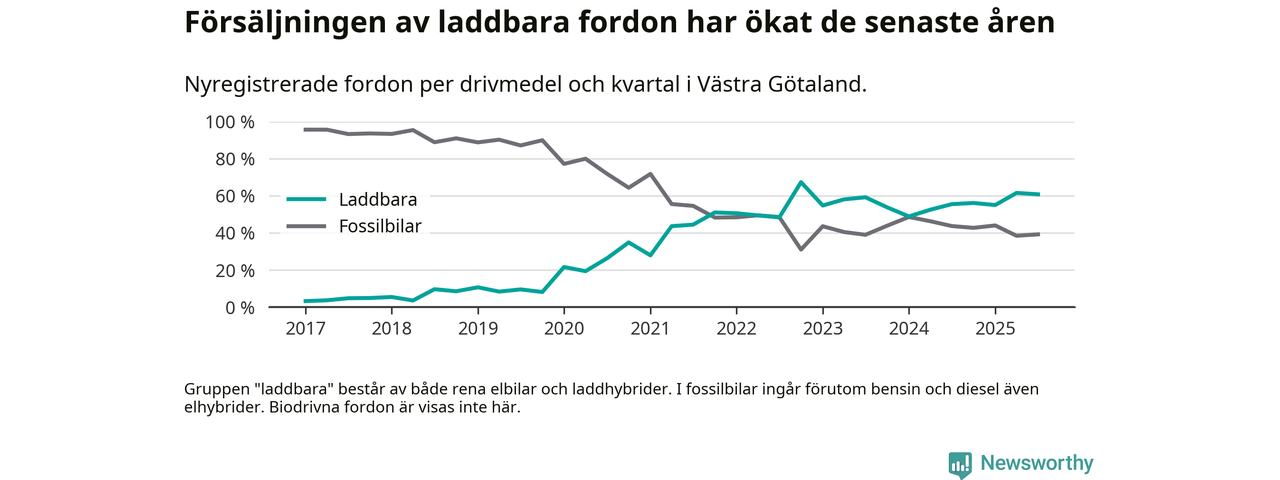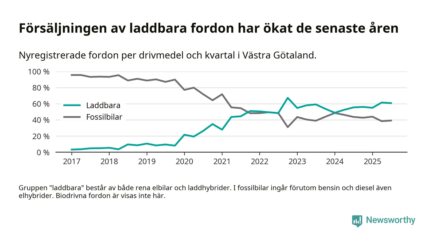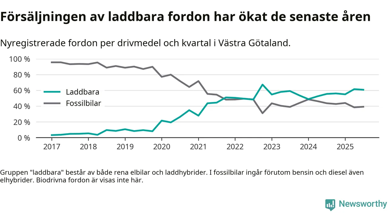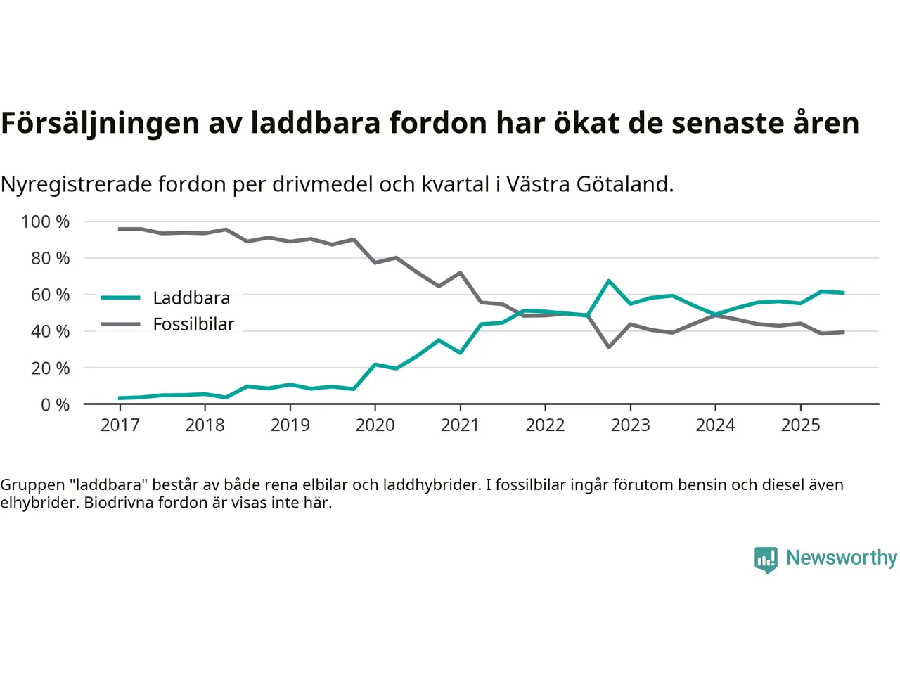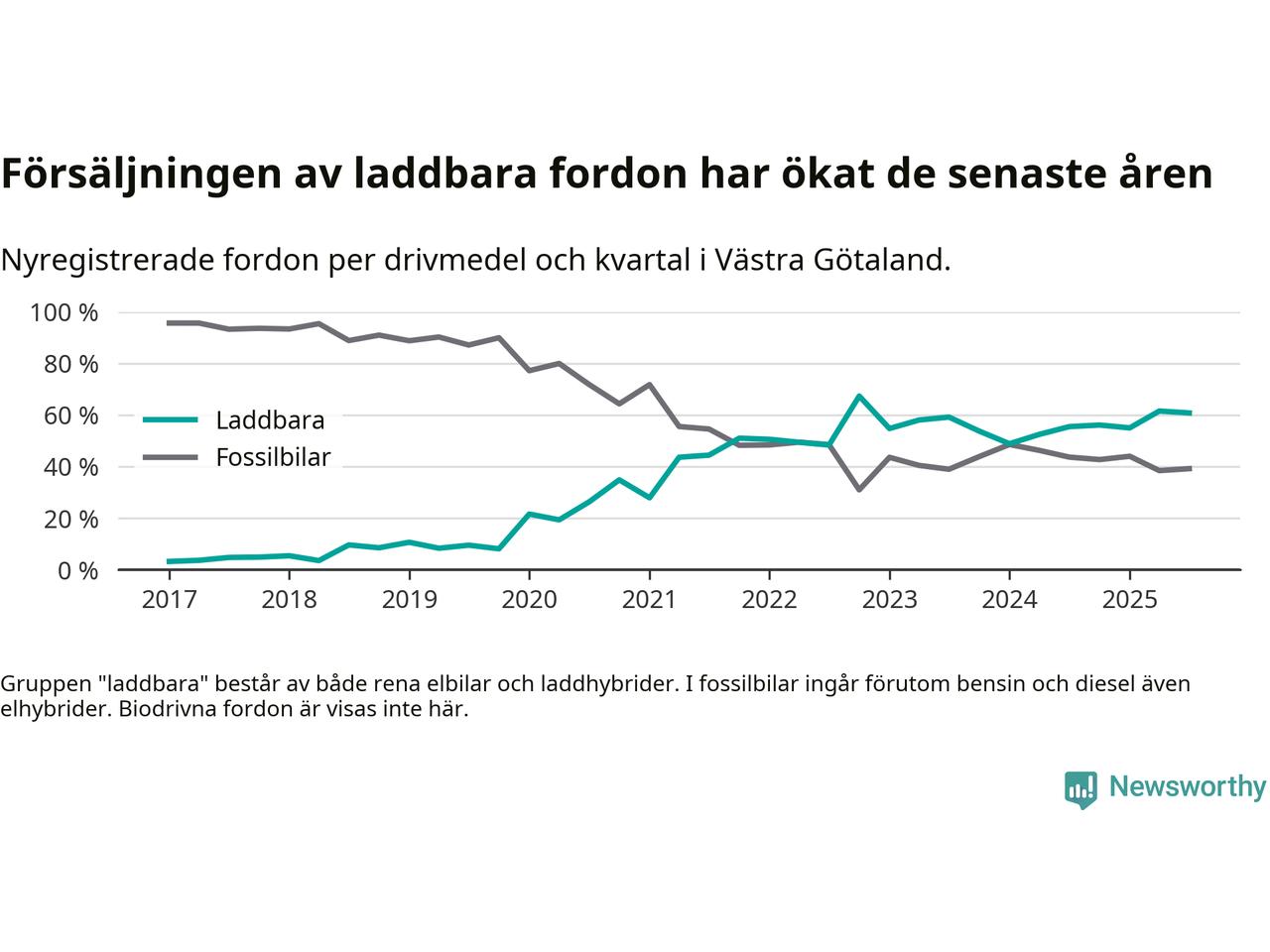 Under tredje kvartalet 2025 var 61 procent av alla nyregistrerade personbilar i Västra Götaland laddbara (sammanlagt registrerades 10 114 nya bilar). Merparten av de laddbara bilarna var rena elbilar (36 procent av alla).