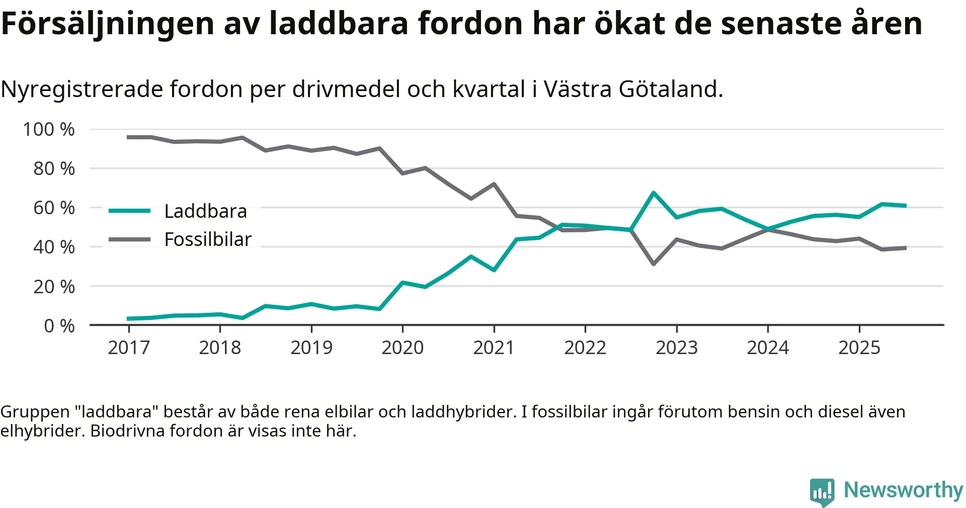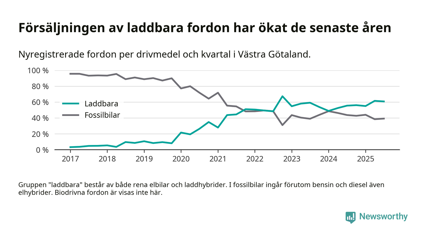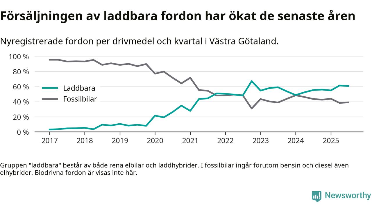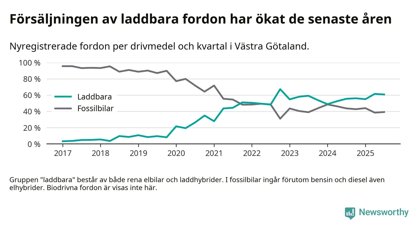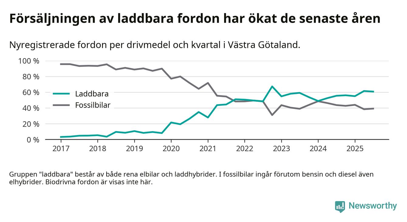 Under tredje kvartalet 2025 var 61 procent av alla nyregistrerade personbilar i Västra Götaland laddbara (sammanlagt registrerades 10 114 nya bilar). Merparten av de laddbara bilarna var rena elbilar (36 procent av alla).