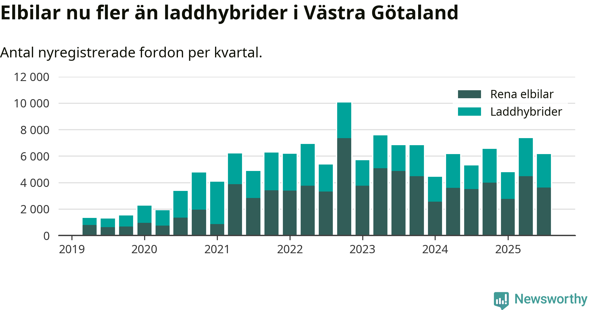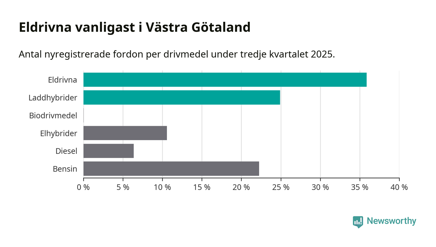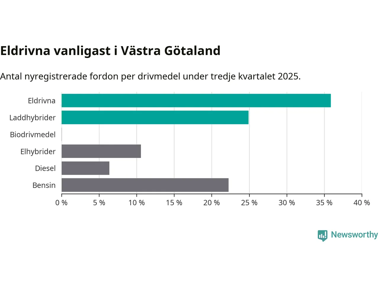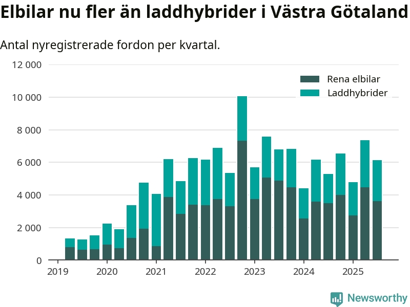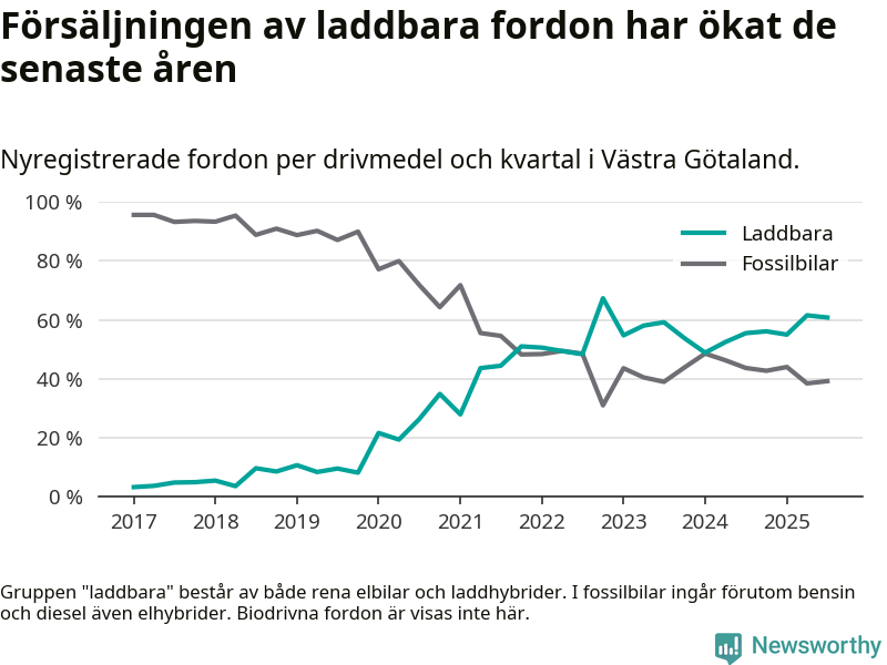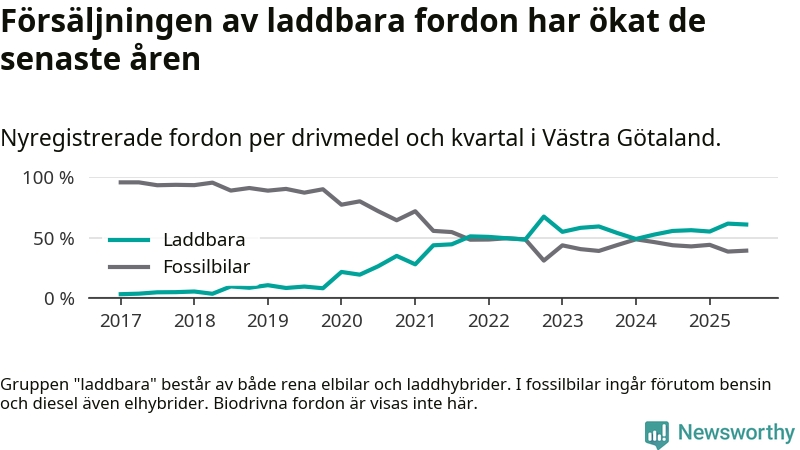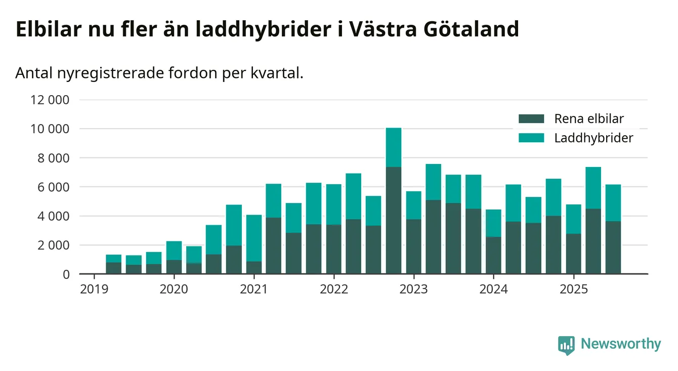 Under tredje kvartalet 2025 var 61 procent av alla nyregistrerade personbilar i Västra Götaland laddbara (sammanlagt registrerades 10 114 nya bilar). Merparten av de laddbara bilarna var rena elbilar (36 procent av alla).