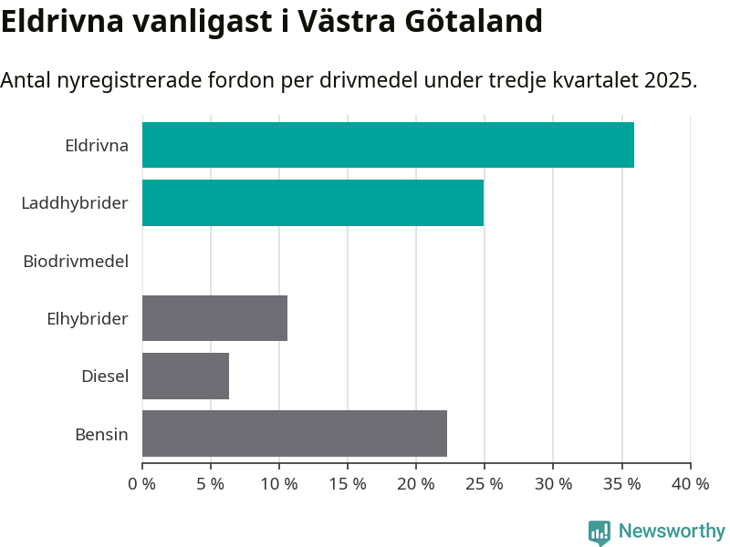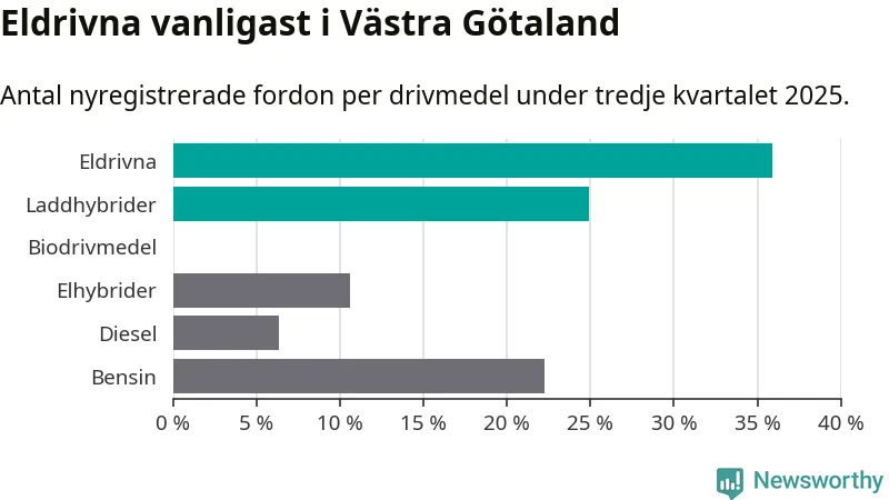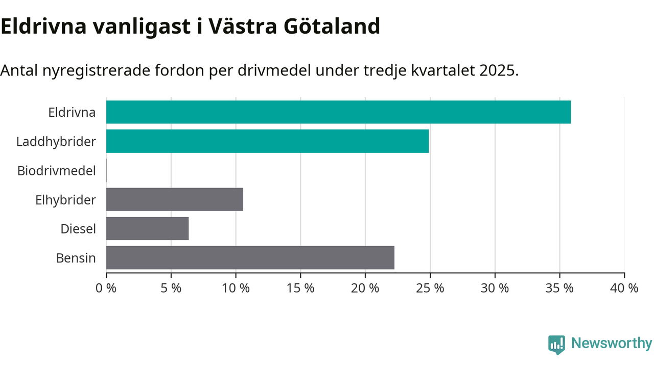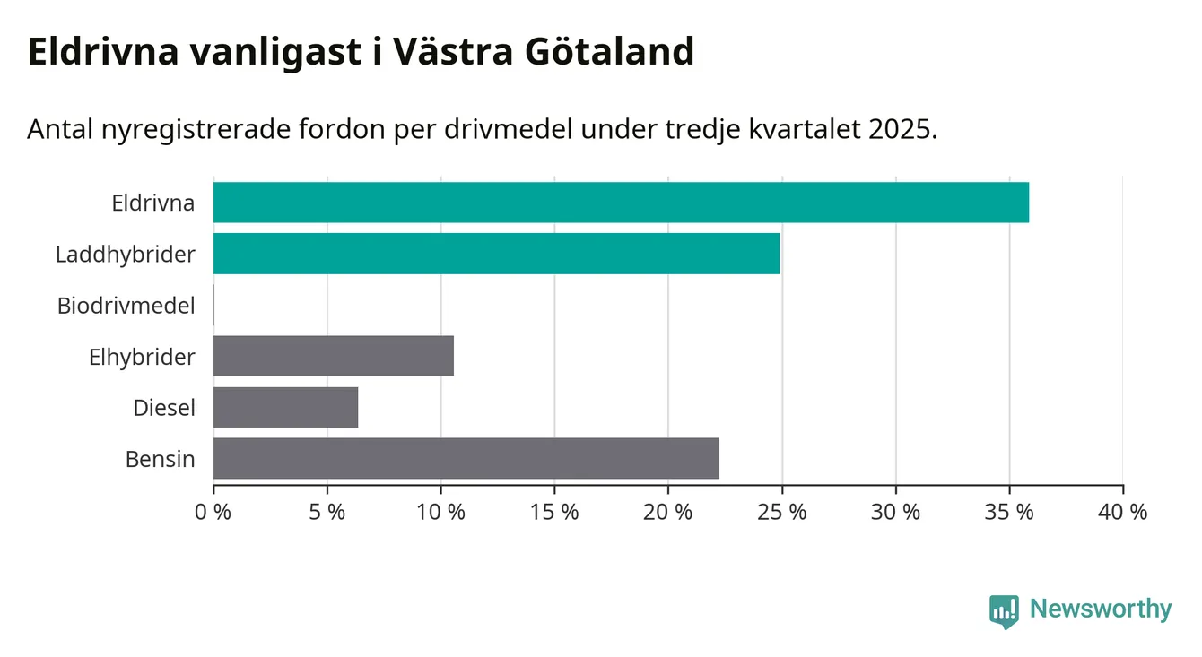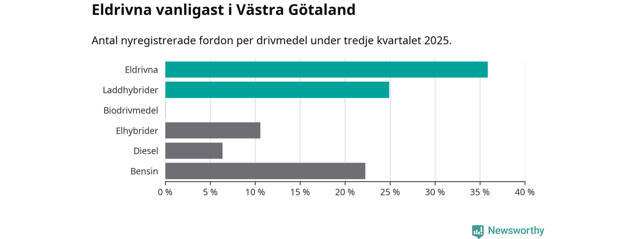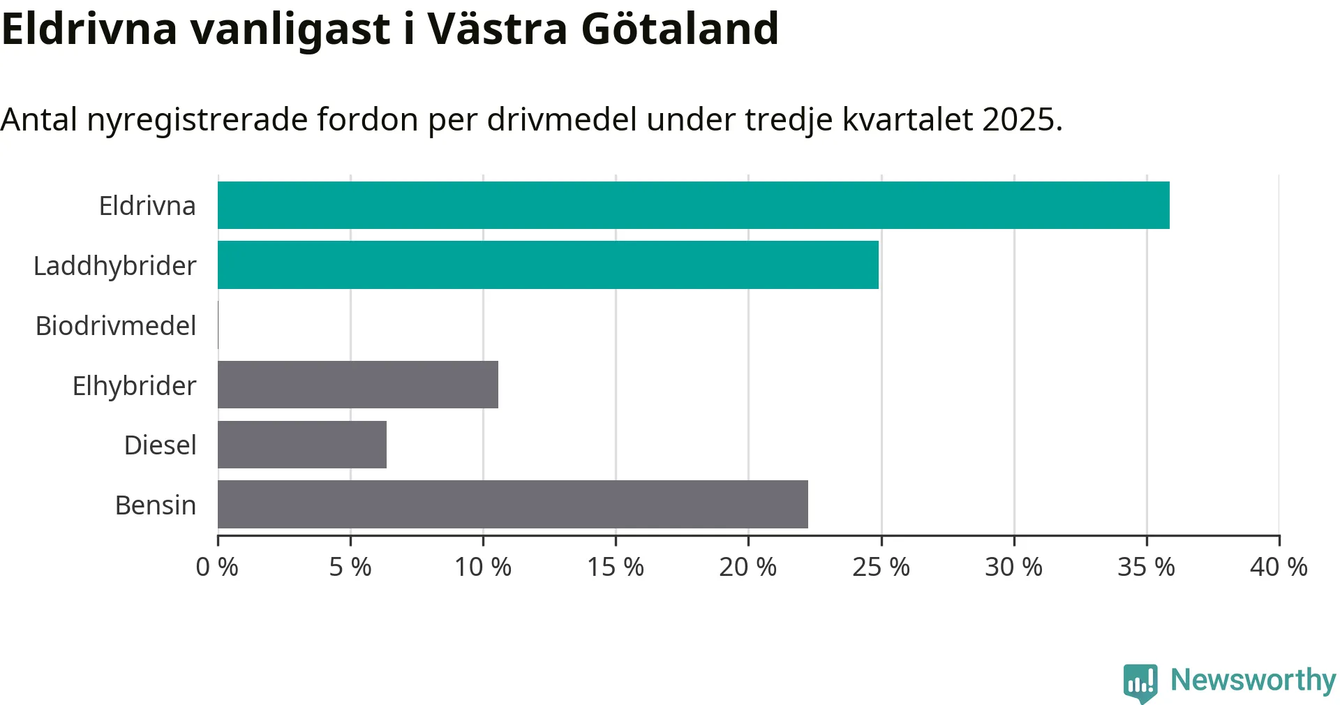 Under tredje kvartalet 2025 var 61 procent av alla nyregistrerade personbilar i Västra Götaland laddbara (sammanlagt registrerades 10 114 nya bilar). Merparten av de laddbara bilarna var rena elbilar (36 procent av alla).