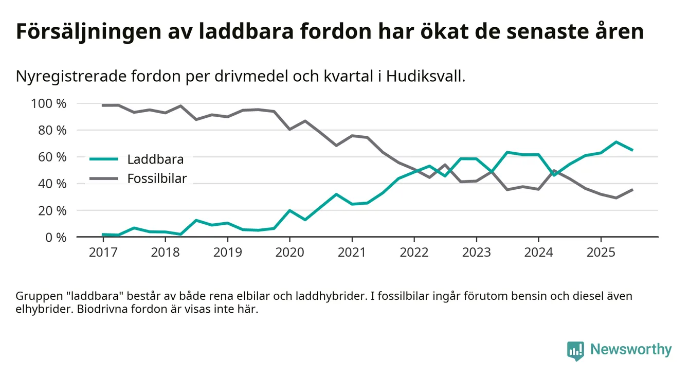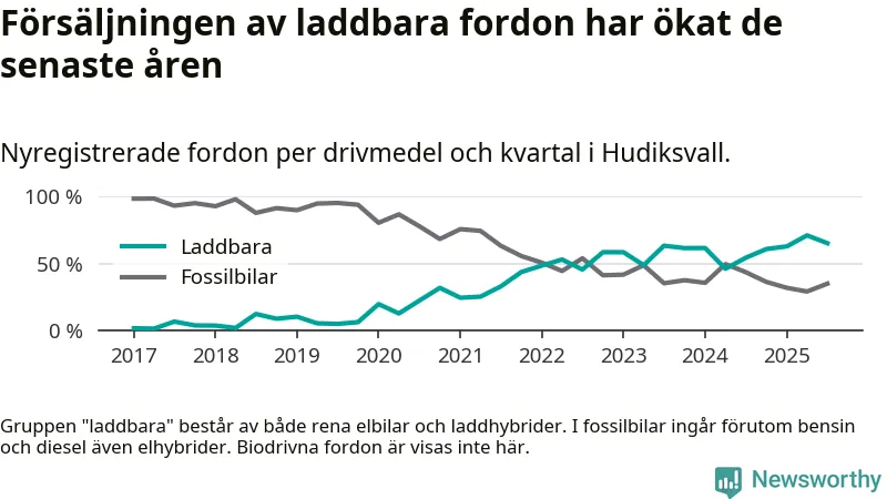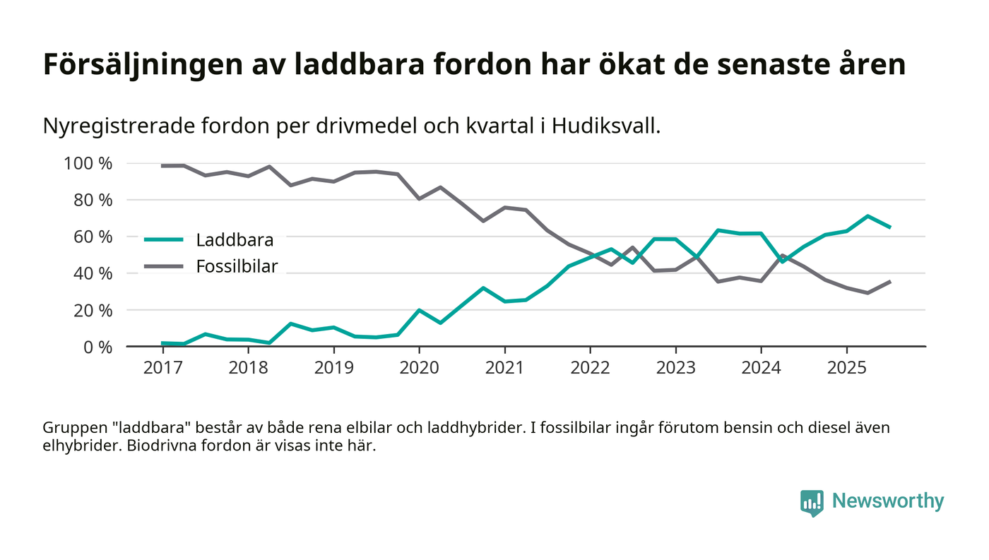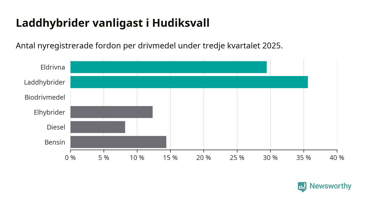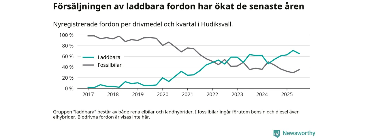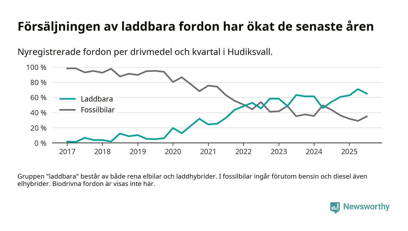 Under tredje kvartalet 2025 var 65 procent av alla nyregistrerade personbilar i Hudiksvall laddbara (sammanlagt registrerades 146 nya bilar). Merparten av de laddbara bilarna var så kallade laddhybrider, det vill säga fordon som går att ladda och köra på el, men som även har en förbränningsmotor. 29 procent av alla nya bilar var rena elbilar.