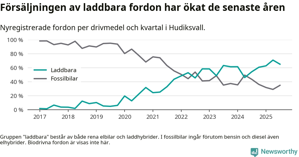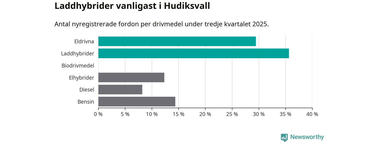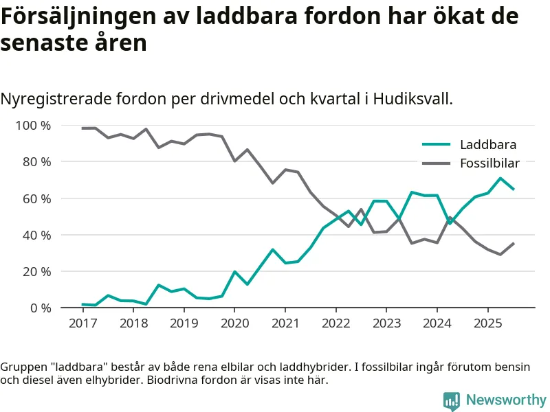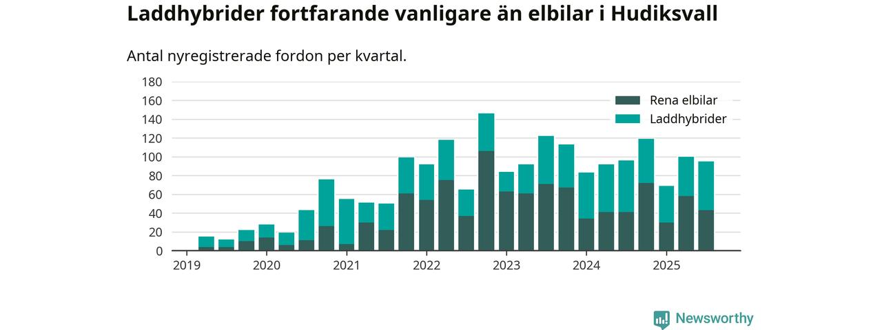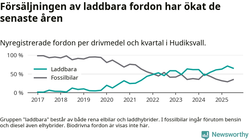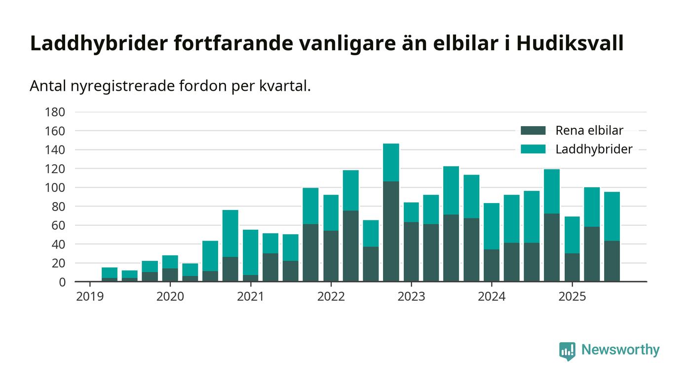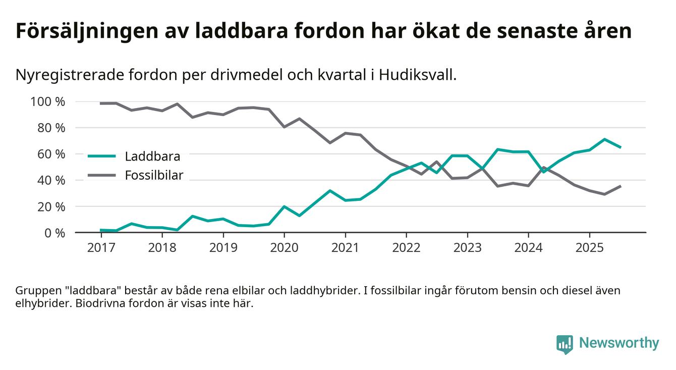 Under tredje kvartalet 2025 var 65 procent av alla nyregistrerade personbilar i Hudiksvall laddbara (sammanlagt registrerades 146 nya bilar). Merparten av de laddbara bilarna var så kallade laddhybrider, det vill säga fordon som går att ladda och köra på el, men som även har en förbränningsmotor. 29 procent av alla nya bilar var rena elbilar.