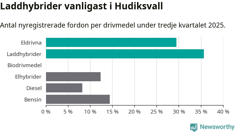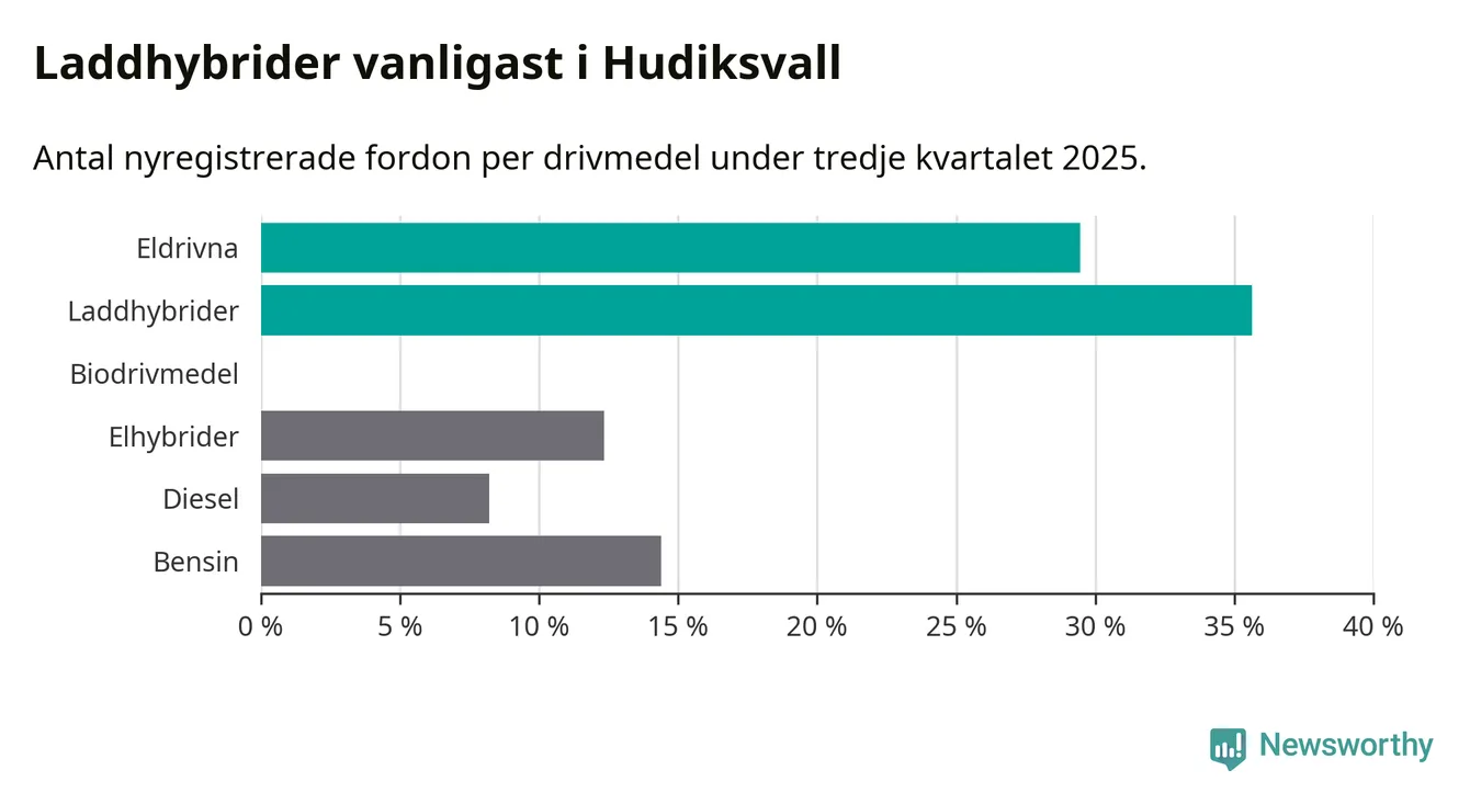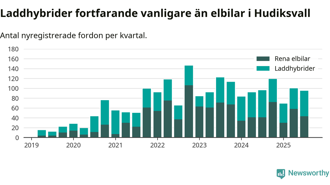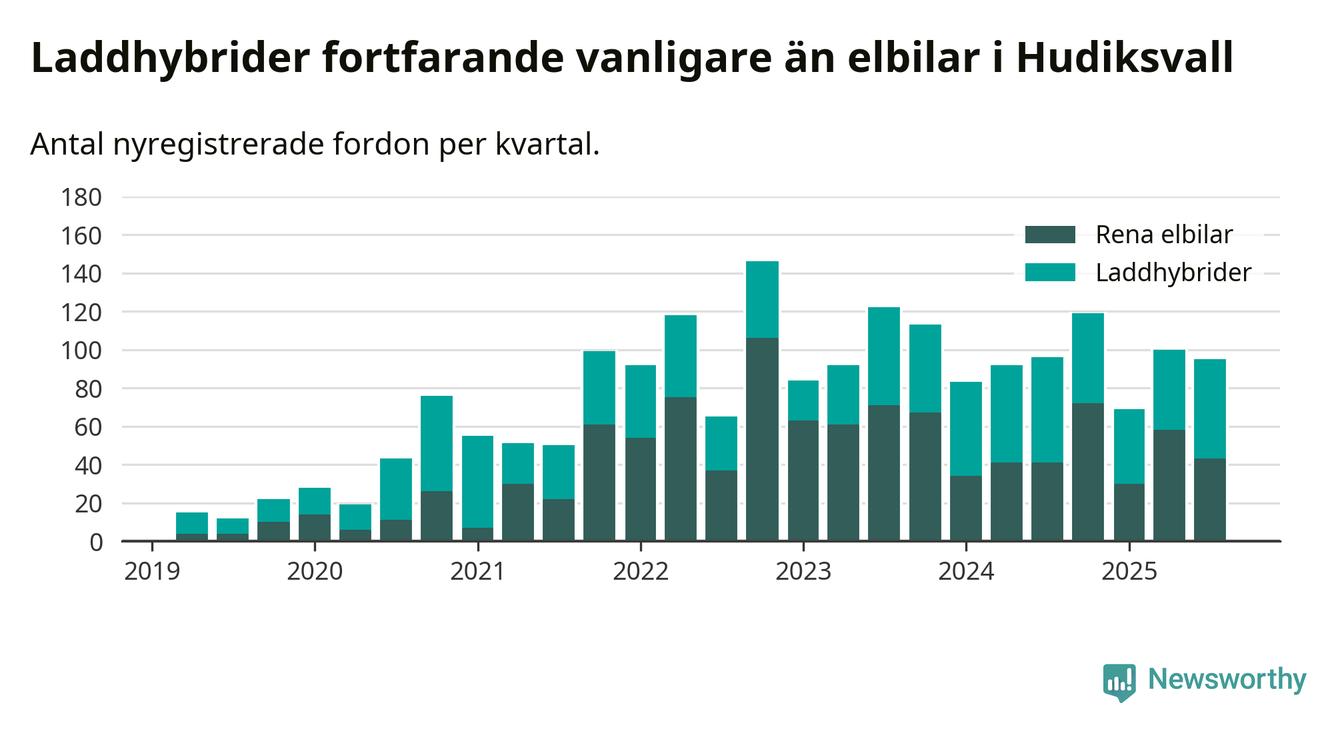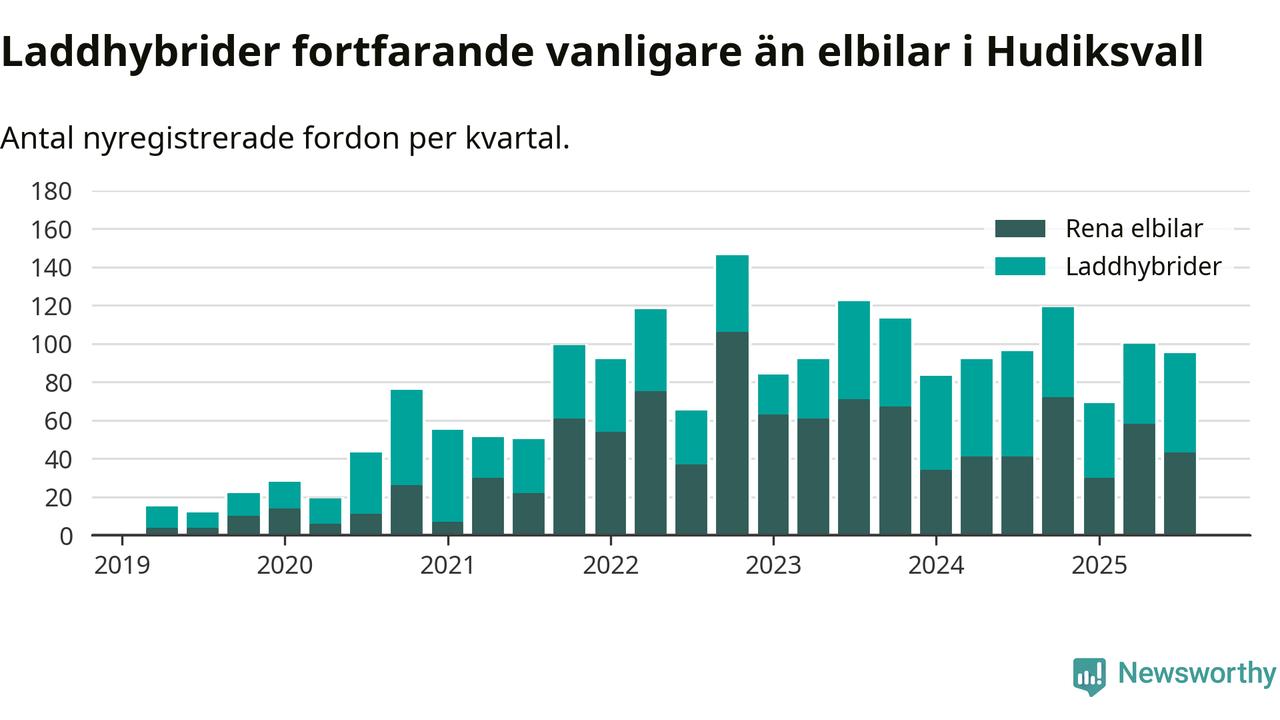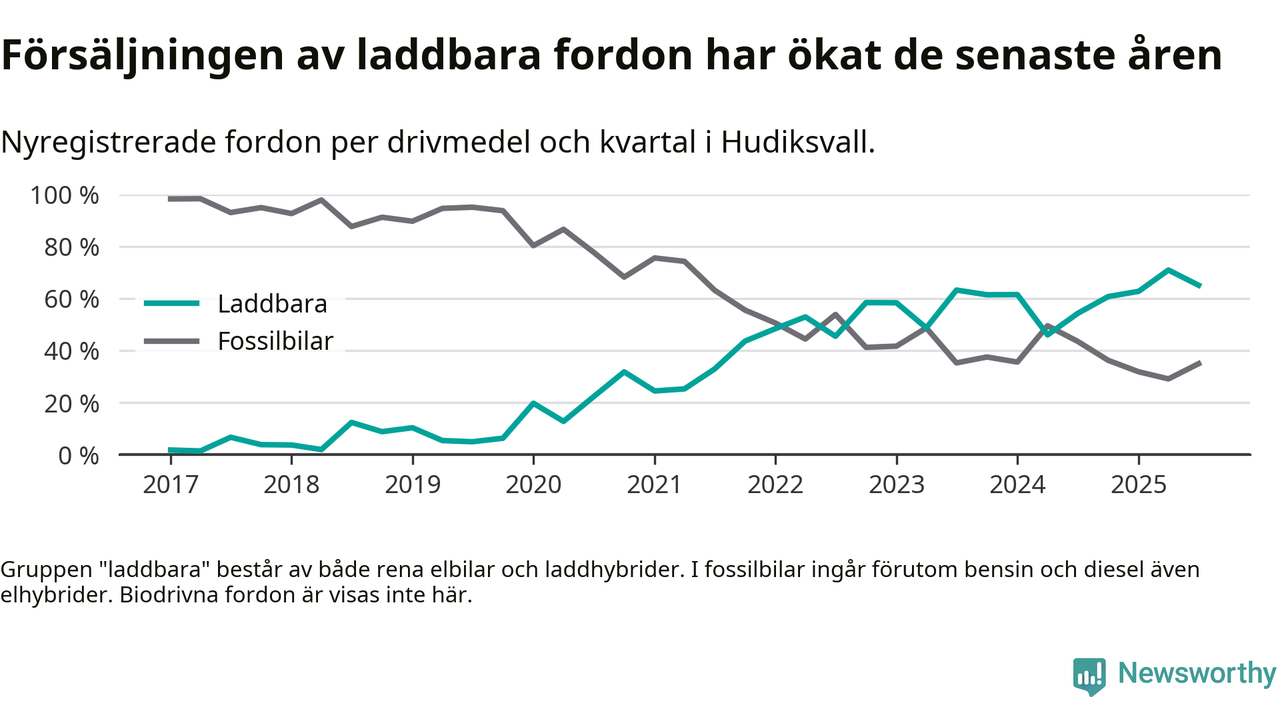 Under tredje kvartalet 2025 var 65 procent av alla nyregistrerade personbilar i Hudiksvall laddbara (sammanlagt registrerades 146 nya bilar). Merparten av de laddbara bilarna var så kallade laddhybrider, det vill säga fordon som går att ladda och köra på el, men som även har en förbränningsmotor. 29 procent av alla nya bilar var rena elbilar.