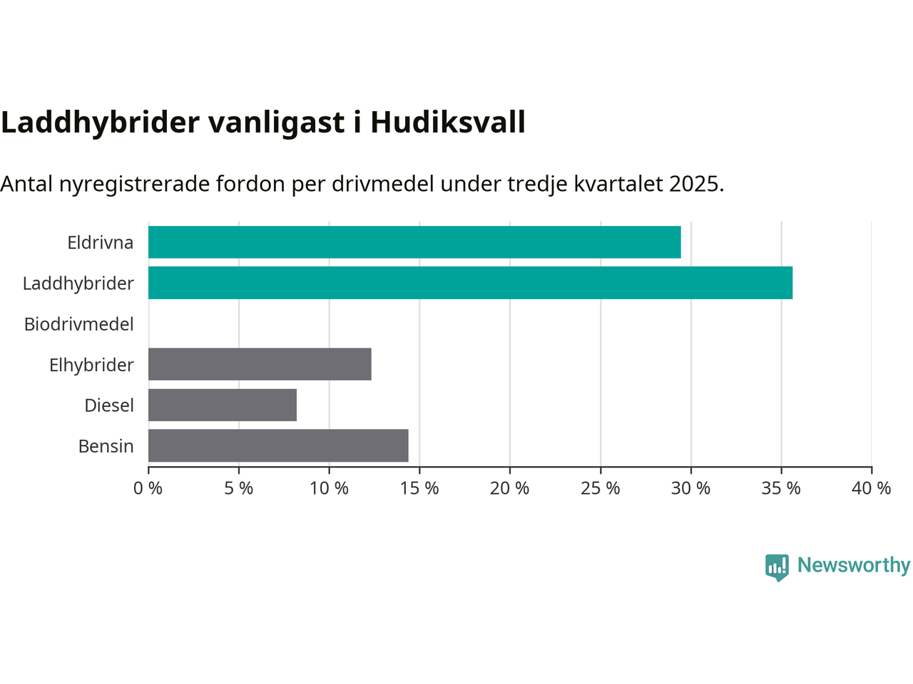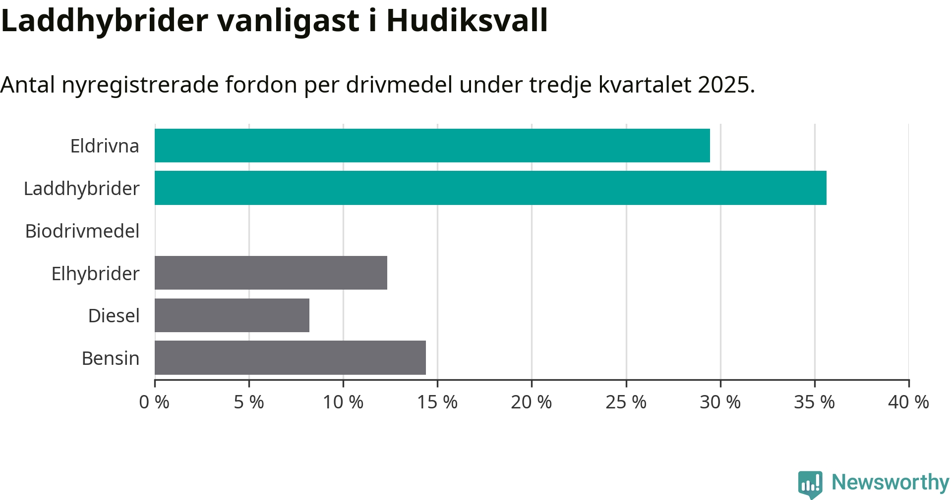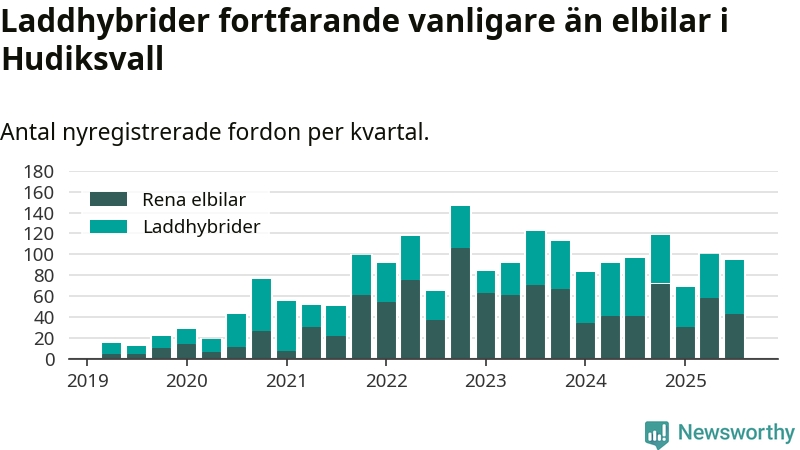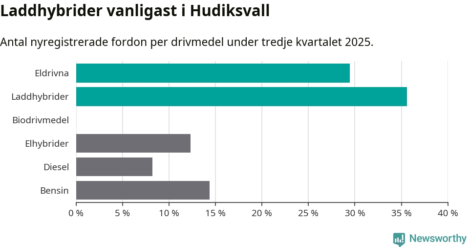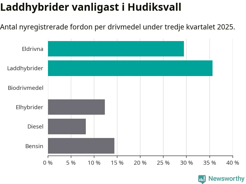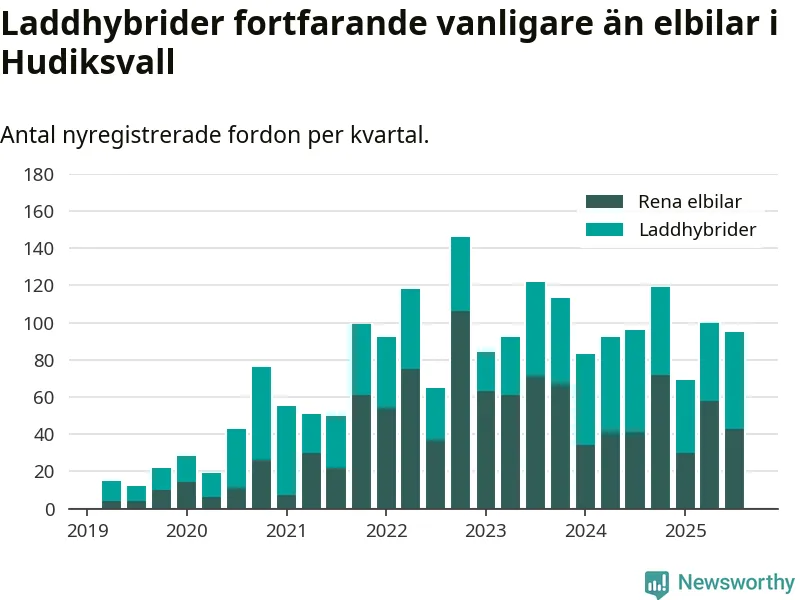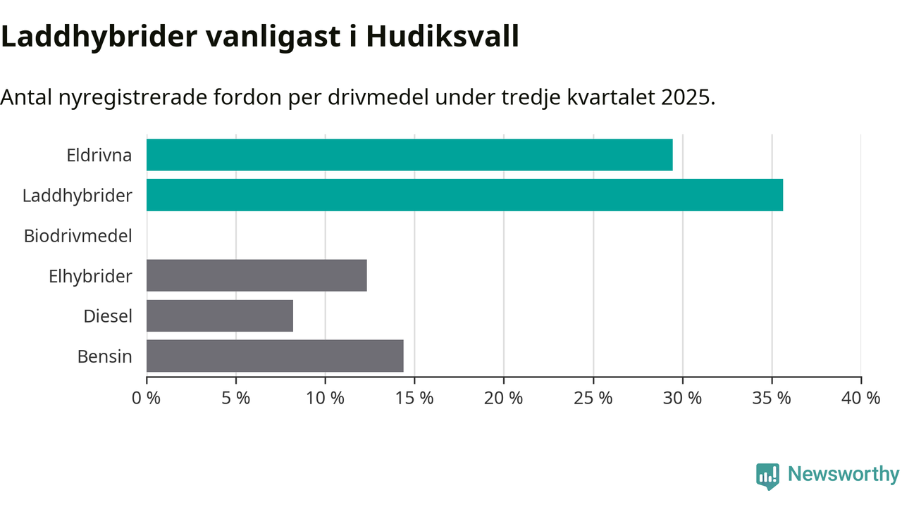 Under tredje kvartalet 2025 var 65 procent av alla nyregistrerade personbilar i Hudiksvall laddbara (sammanlagt registrerades 146 nya bilar). Merparten av de laddbara bilarna var så kallade laddhybrider, det vill säga fordon som går att ladda och köra på el, men som även har en förbränningsmotor. 29 procent av alla nya bilar var rena elbilar.