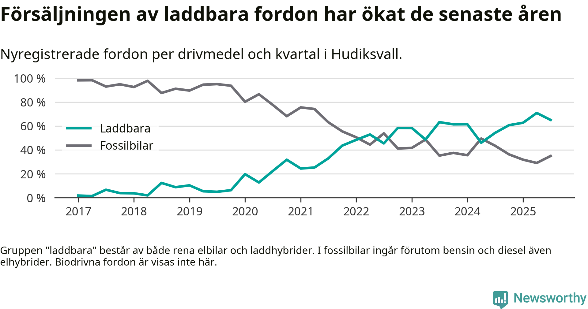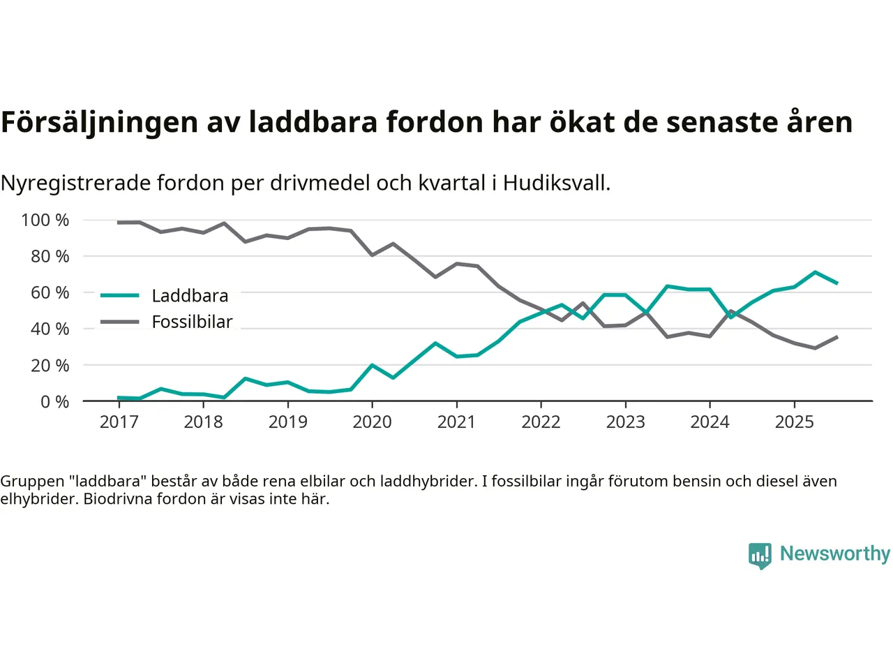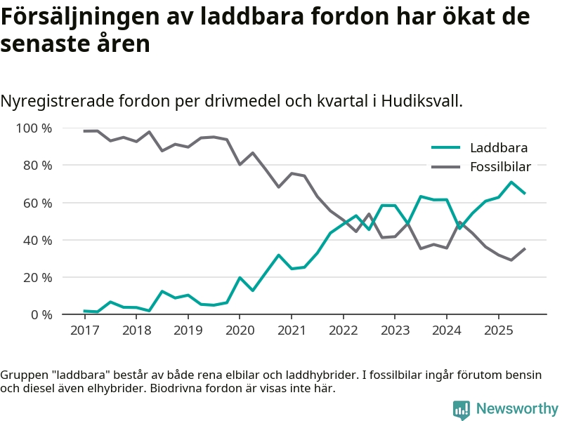 I Hudiksvall minskade andelen laddbara bilar under tredje kvartalet jämfört med kvartalet innan. Det är första gången sedan andra kvartalet 2024 som andelen minskar. Nyregistreringen peakade under andra kvartalet 2025 då 71 procent av de nya bilarna var laddbara.