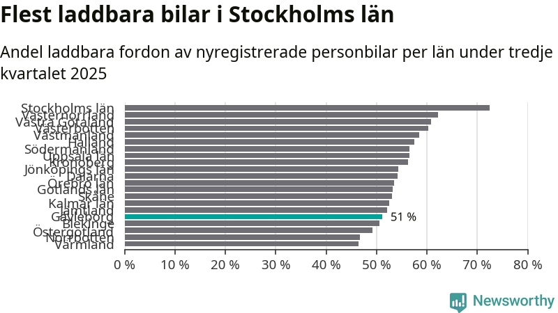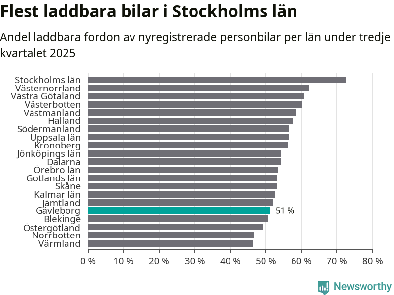 I hela landet var 62 procent av alla nya bilar laddbara under tredje kvartalet. Det är något färre än föregående kvartal (−0,5 procentenheter). I Gävleborgs län var 51 procent av de nya bilarna laddbara, vilket är färre än föregående kvartal (−2,1 procentenheter).