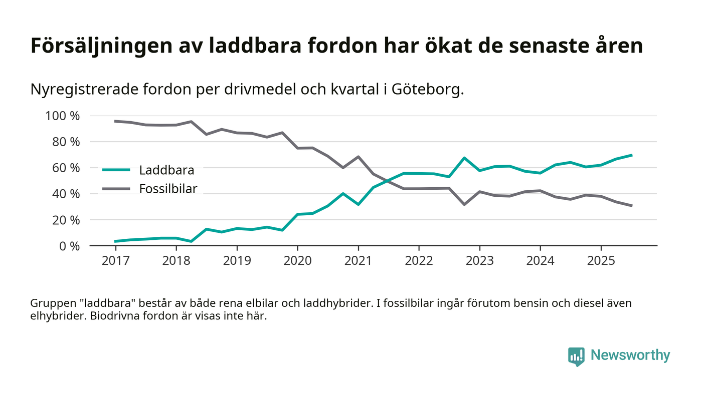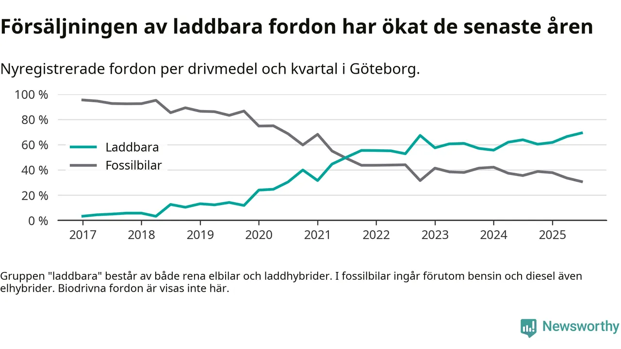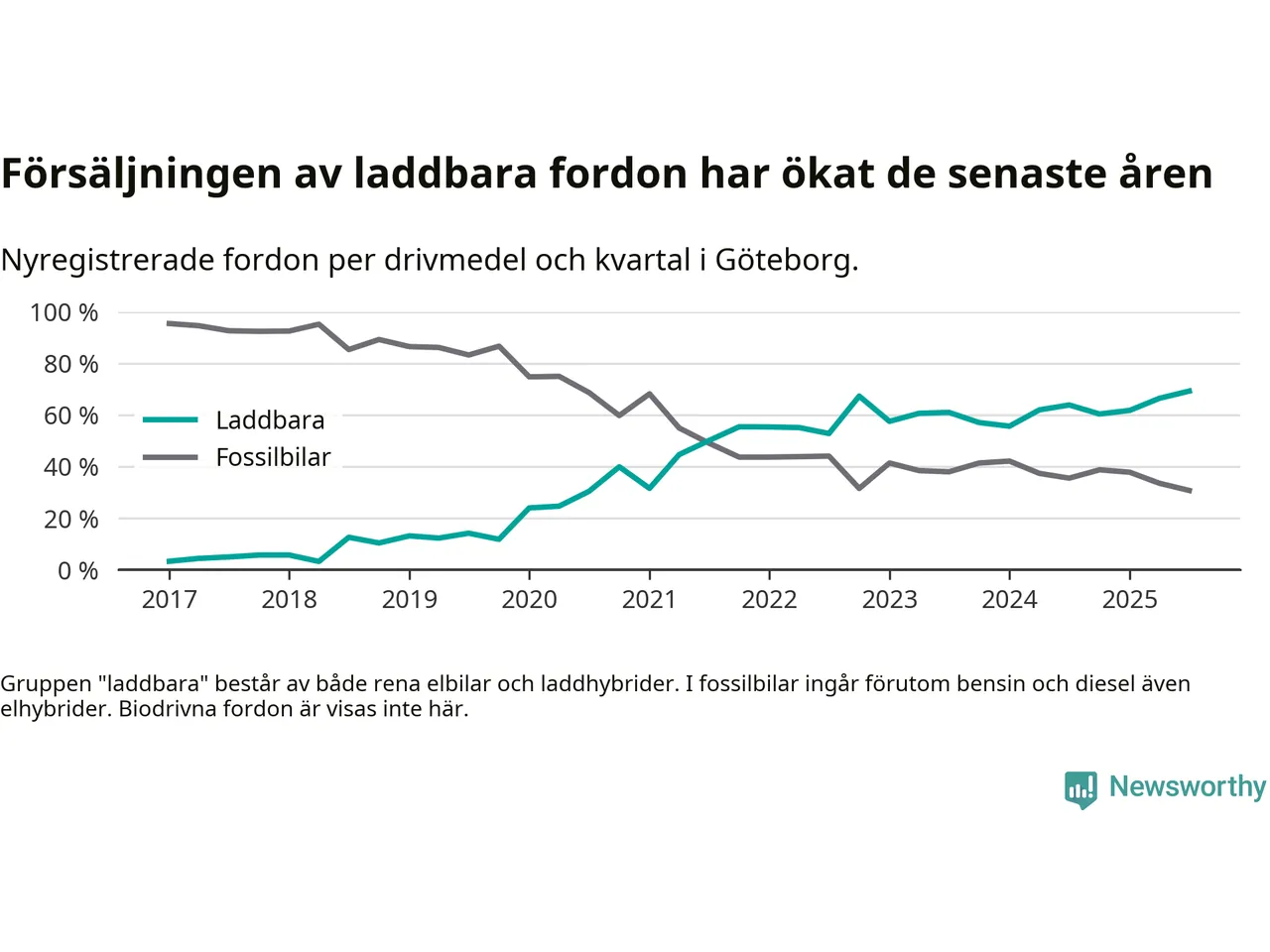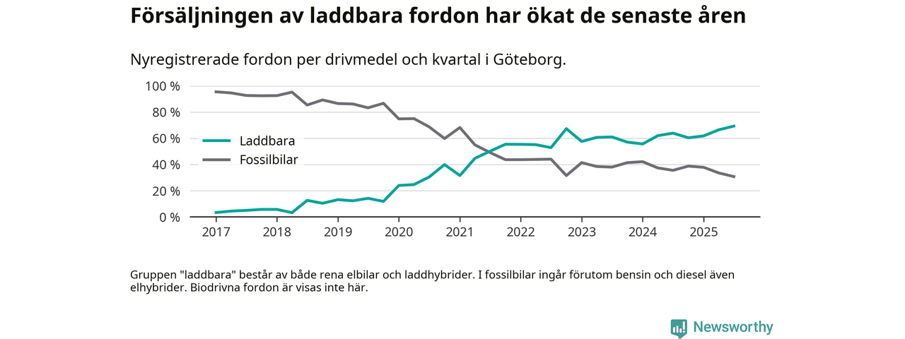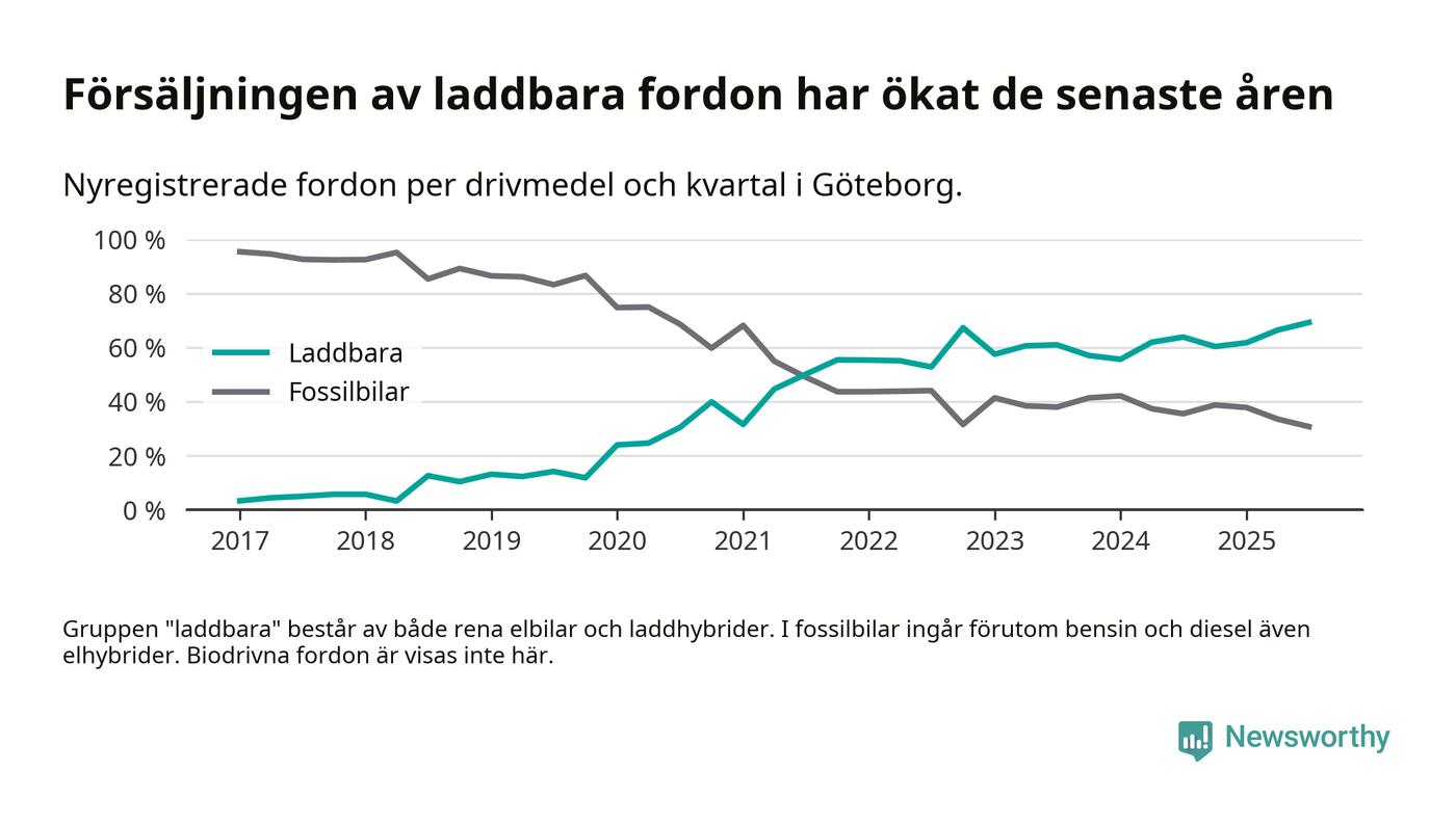 Under tredje kvartalet 2025 var 69 procent av alla nyregistrerade personbilar i Göteborg laddbara (sammanlagt registrerades 3 728 nya bilar). Merparten av de laddbara bilarna var rena elbilar (43 procent av alla).