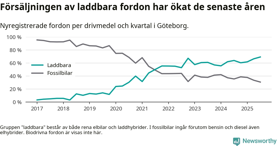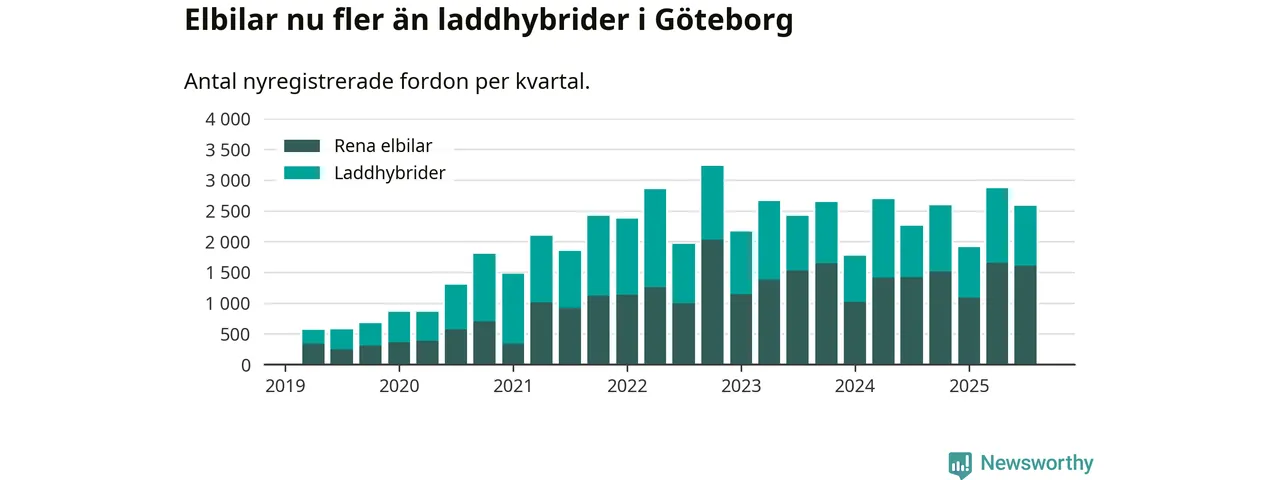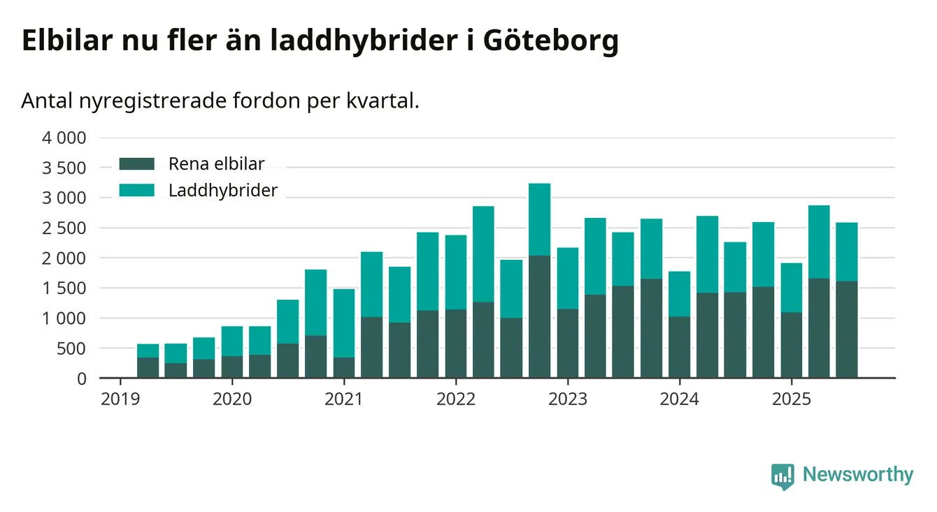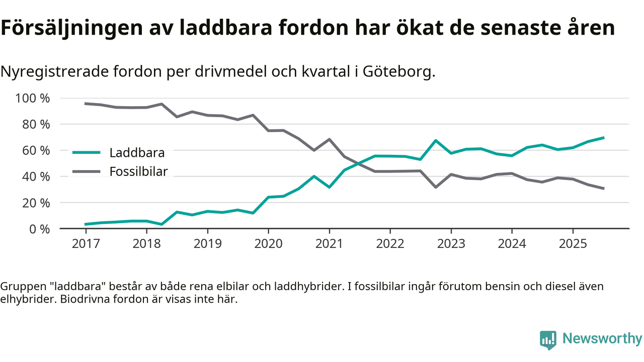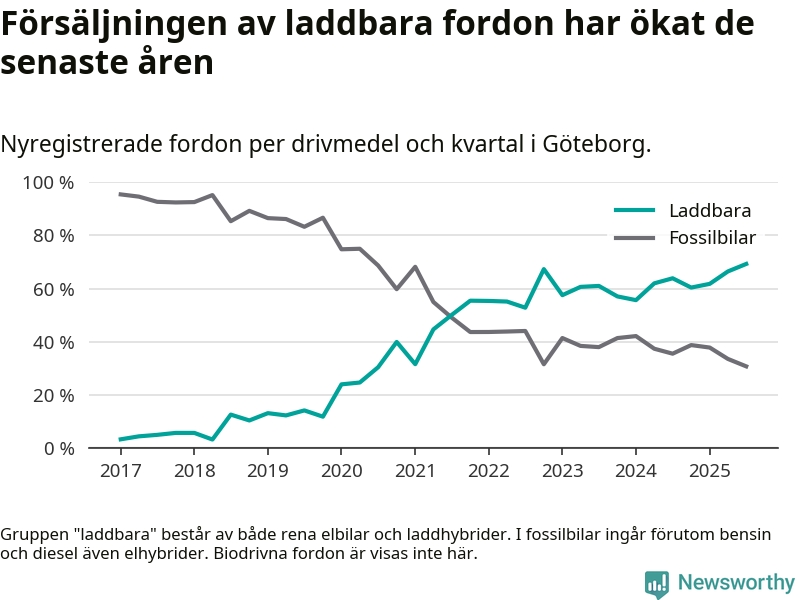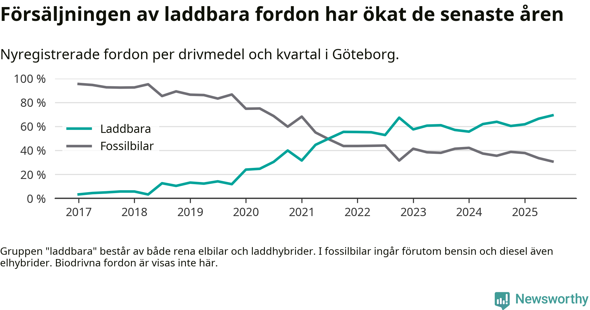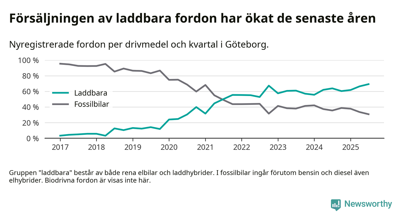Under tredje kvartalet 2025 var 69 procent av alla nyregistrerade personbilar i Göteborg laddbara (sammanlagt registrerades 3 728 nya bilar). Merparten av de laddbara bilarna var rena elbilar (43 procent av alla).