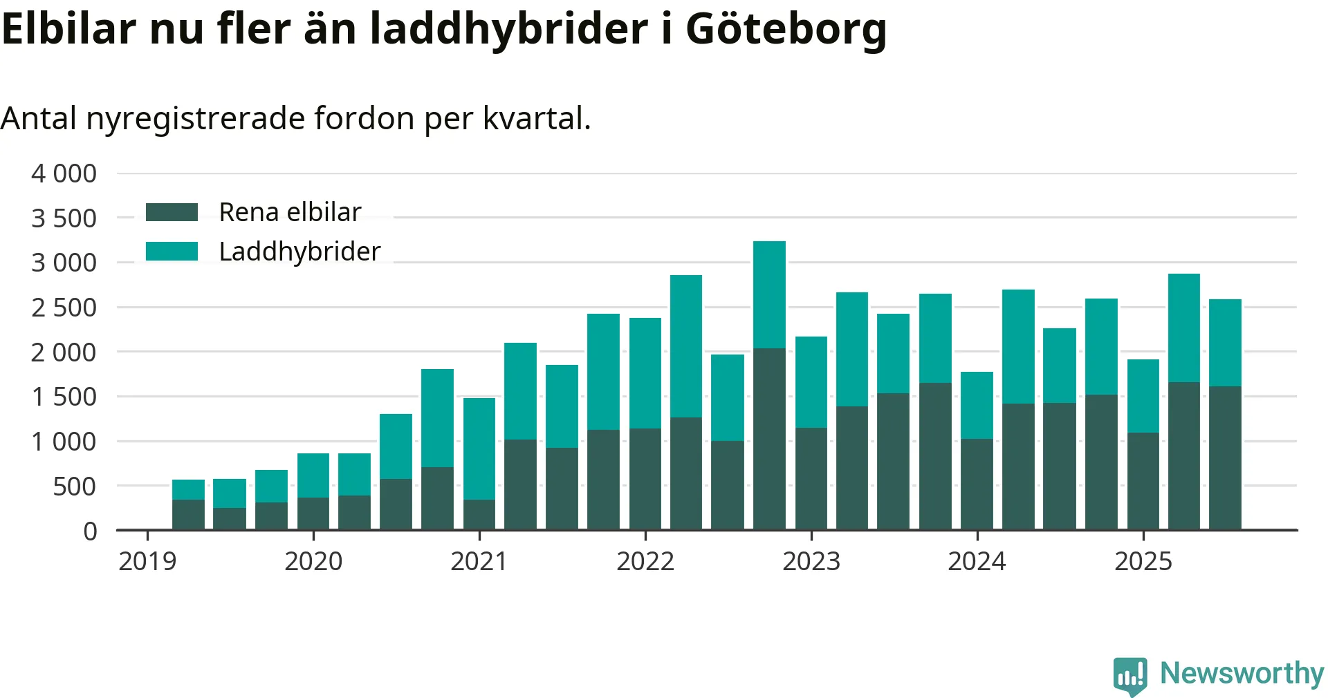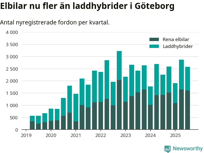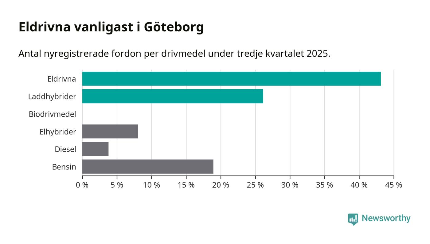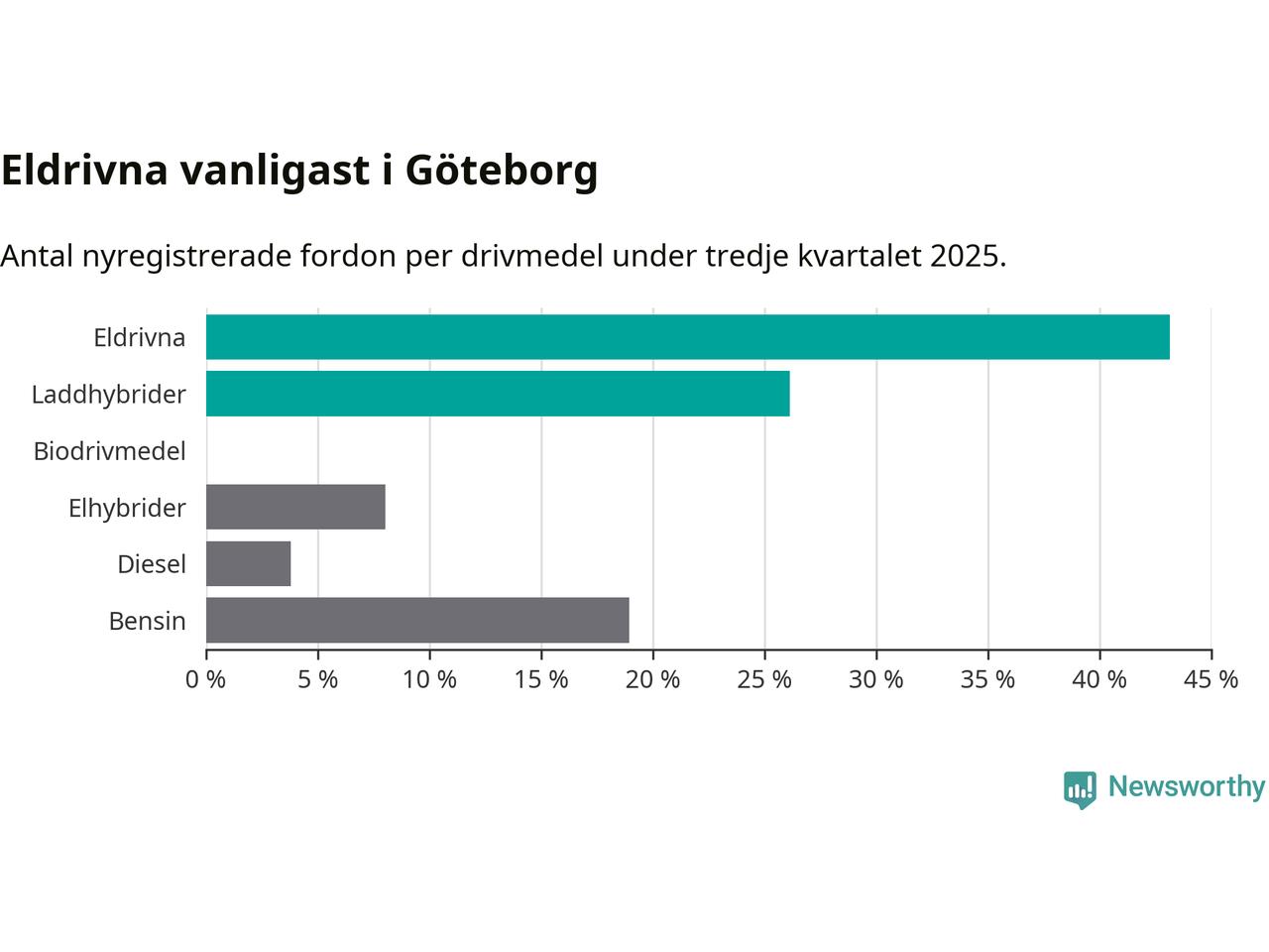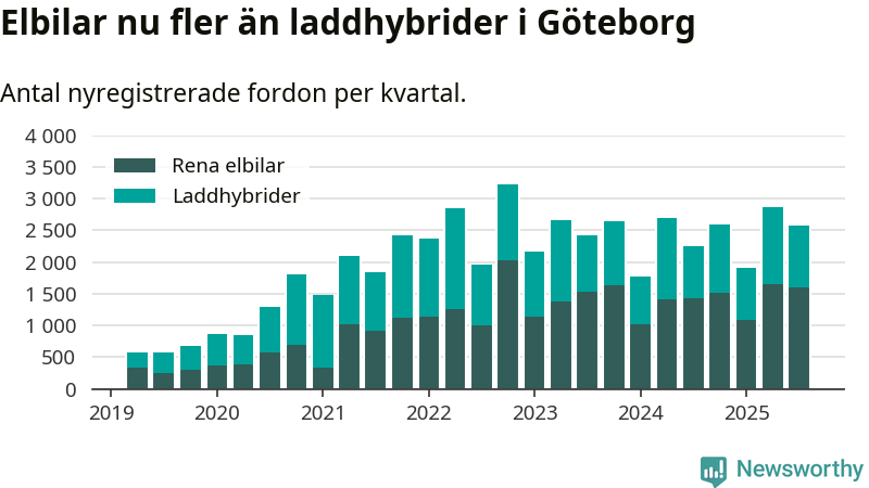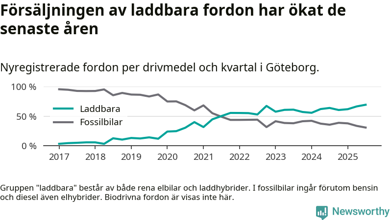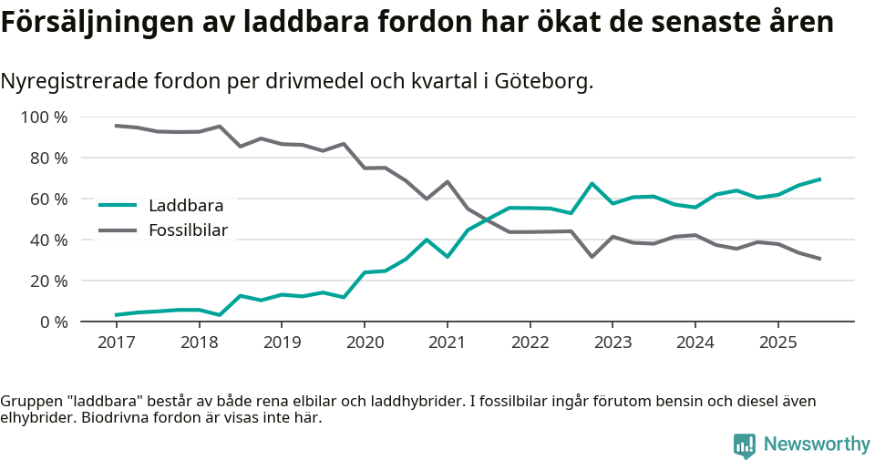 Under tredje kvartalet 2025 var 69 procent av alla nyregistrerade personbilar i Göteborg laddbara (sammanlagt registrerades 3 728 nya bilar). Merparten av de laddbara bilarna var rena elbilar (43 procent av alla).